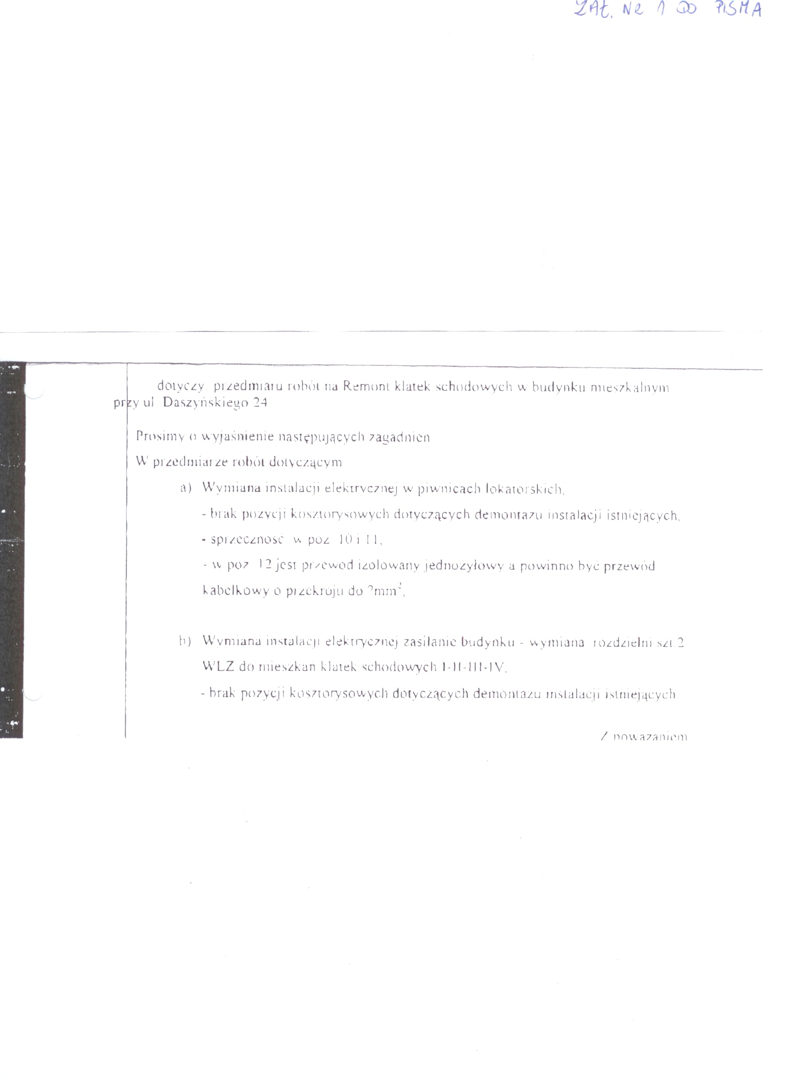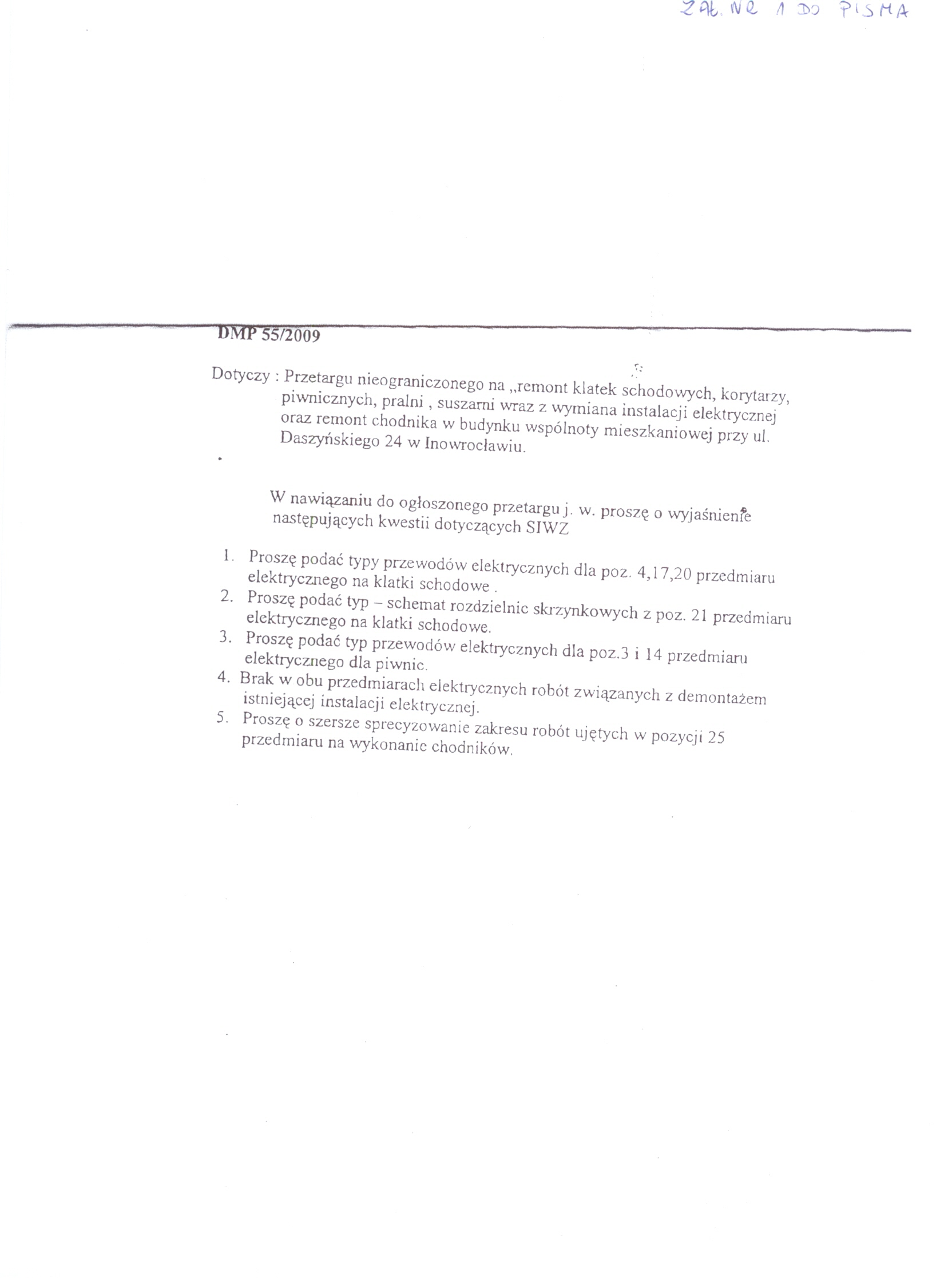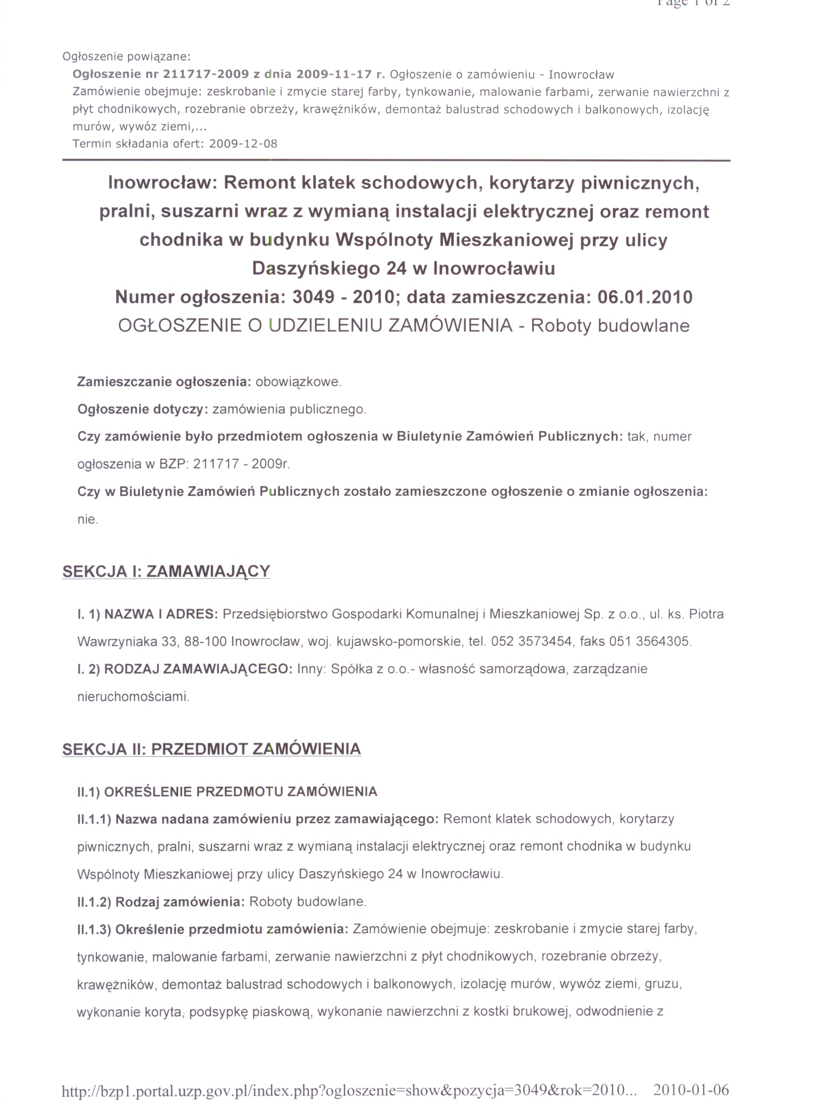 Nazwa nadana zam贸wieniu: "Remont klatek schodowych, korytarzy piwnicznych, pralni, suszarni wraz z wymian膮 instalacji elektrycznej oraz remont chodnika w budynku Wsp贸lnoty Mieszkaniowej przy ulicy Daszy艅skiego 24 w Inowroc艂awiu"