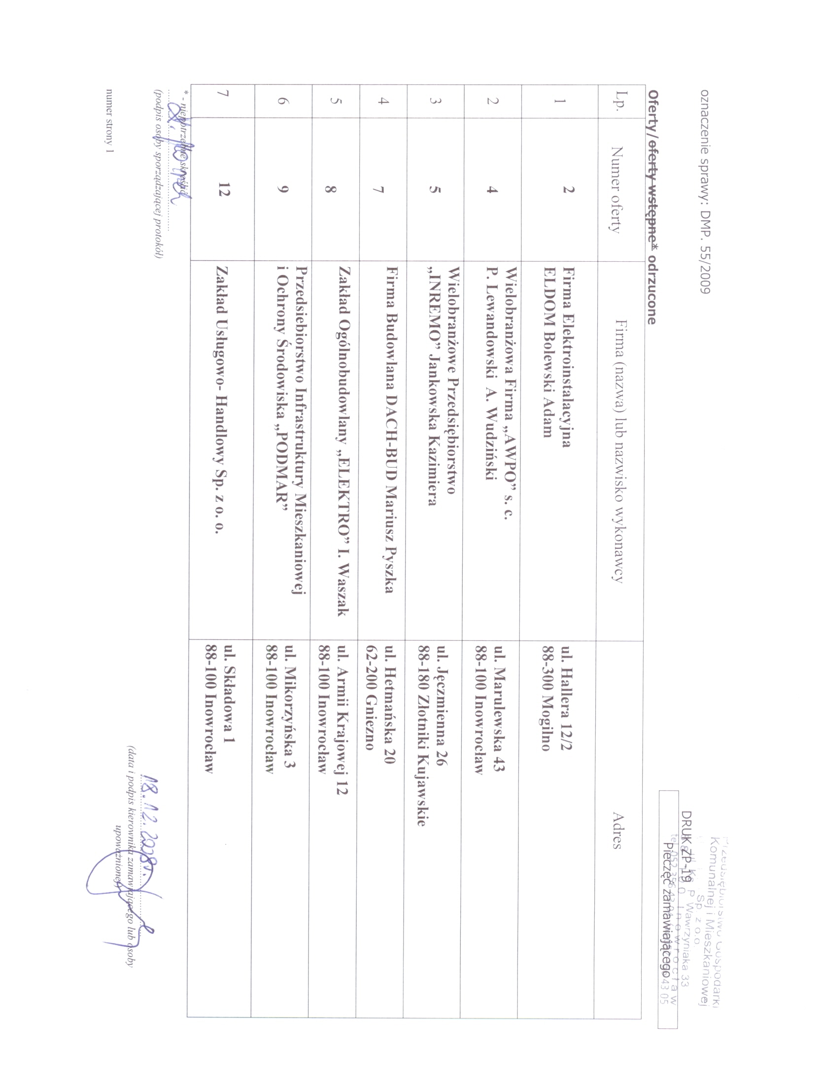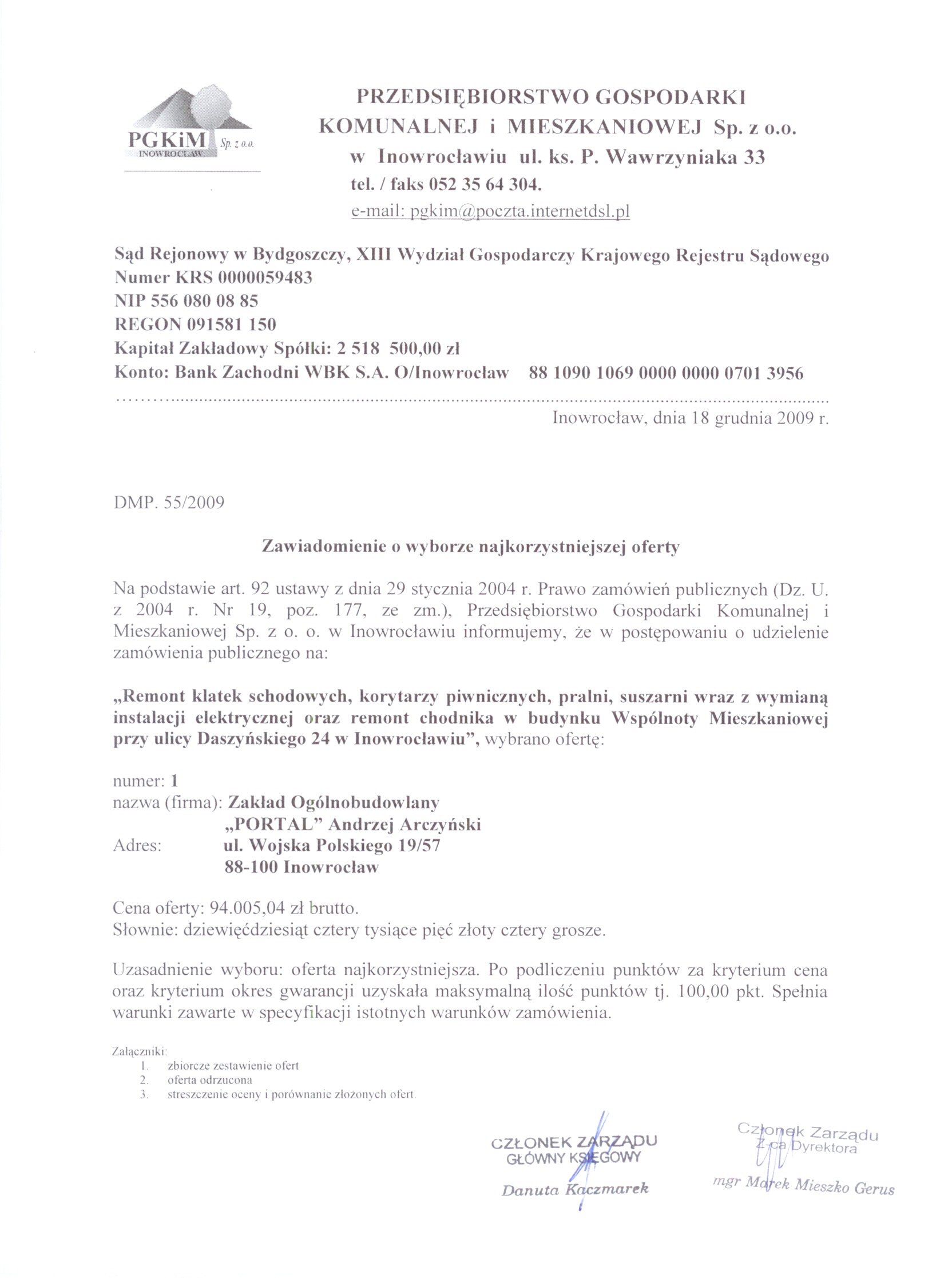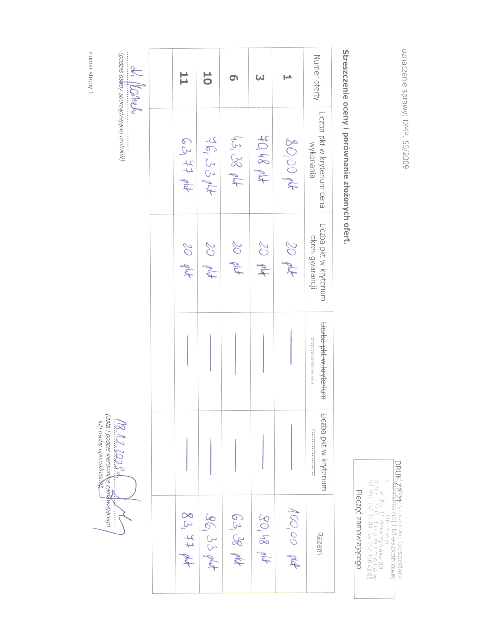 13. Miejsce i termin sk艂adania ofert: Przedsi臋biorstwo Gospodarki Komunalnej i Mieszkaniowej Sp. z o.o., ul. ks. Piotra Wawrzyniaka 33, 88-100 Inowroc艂aw, do dnia 8 grudnia 2009 r. do godziny 9:50, sekretariat 1 pi臋tro. 聽 14. Kryteria wyboru ofert: a)聽 cena wykonania zam贸wienia -聽 80 b) gwarancja - 20 聽