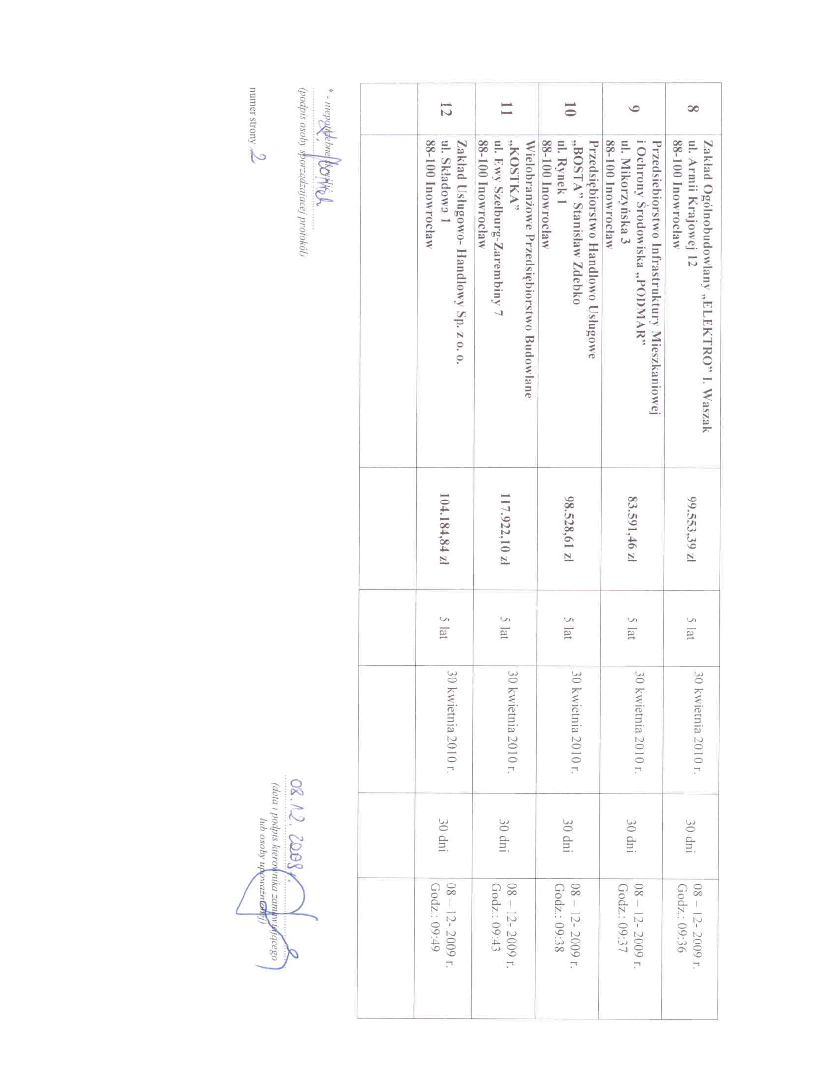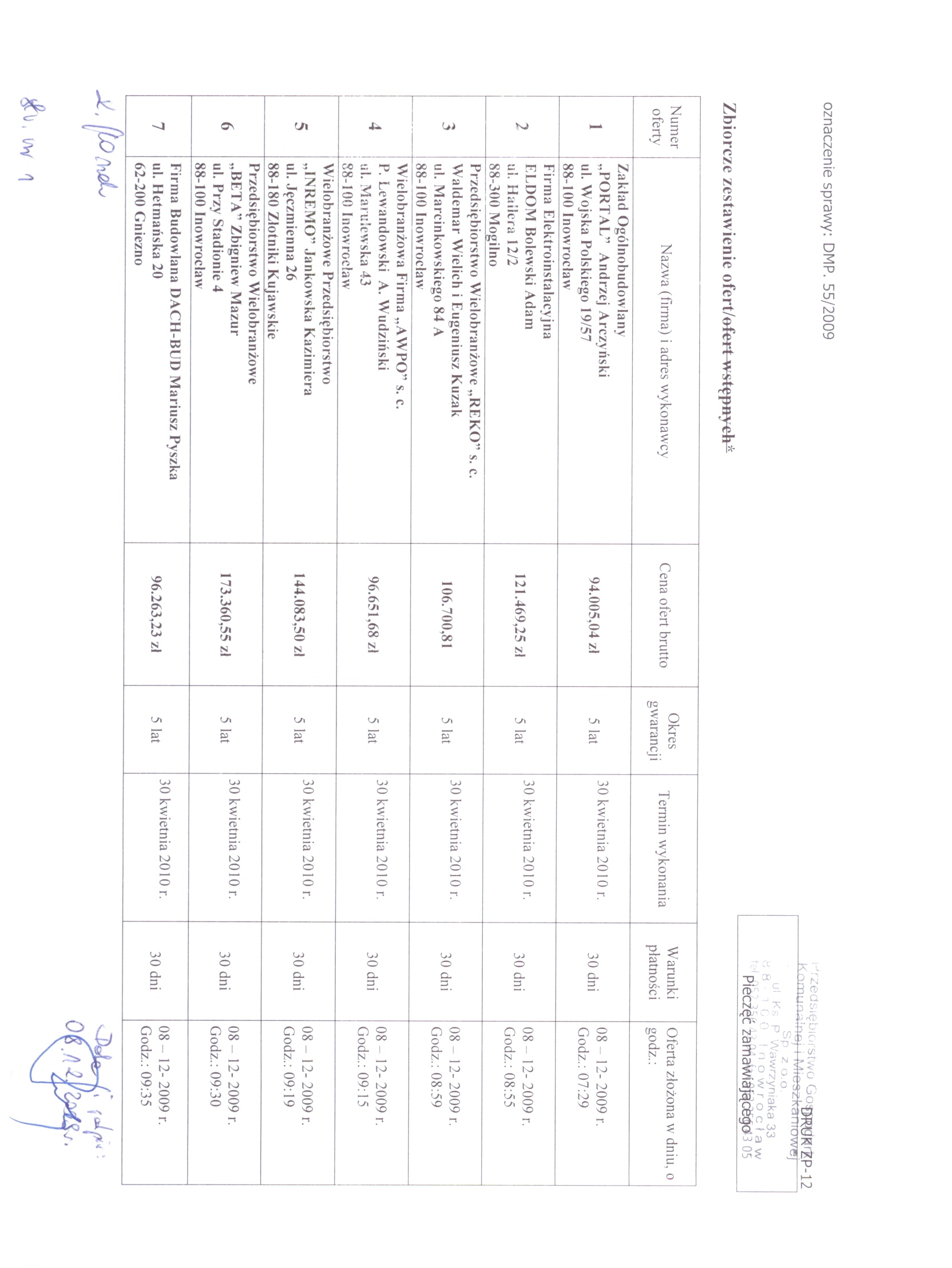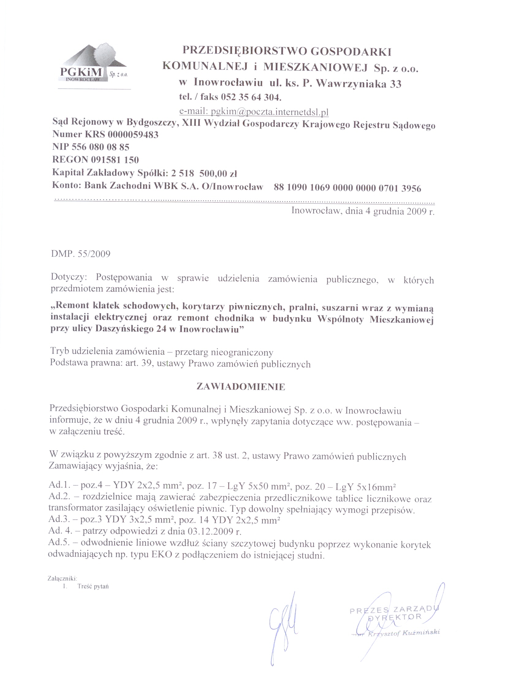 13. Miejsce i termin sk艂adania ofert: Przedsi臋biorstwo Gospodarki Komunalnej i Mieszkaniowej Sp. z o.o., ul. ks. Piotra Wawrzyniaka 33, 88-100 Inowroc艂aw, do dnia 8 grudnia 2009 r. do godziny 9:50, sekretariat 1 pi臋tro. 聽 14. Kryteria wyboru ofert: a)聽 cena wykonania zam贸wienia -聽 80 b) gwarancja - 20 聽