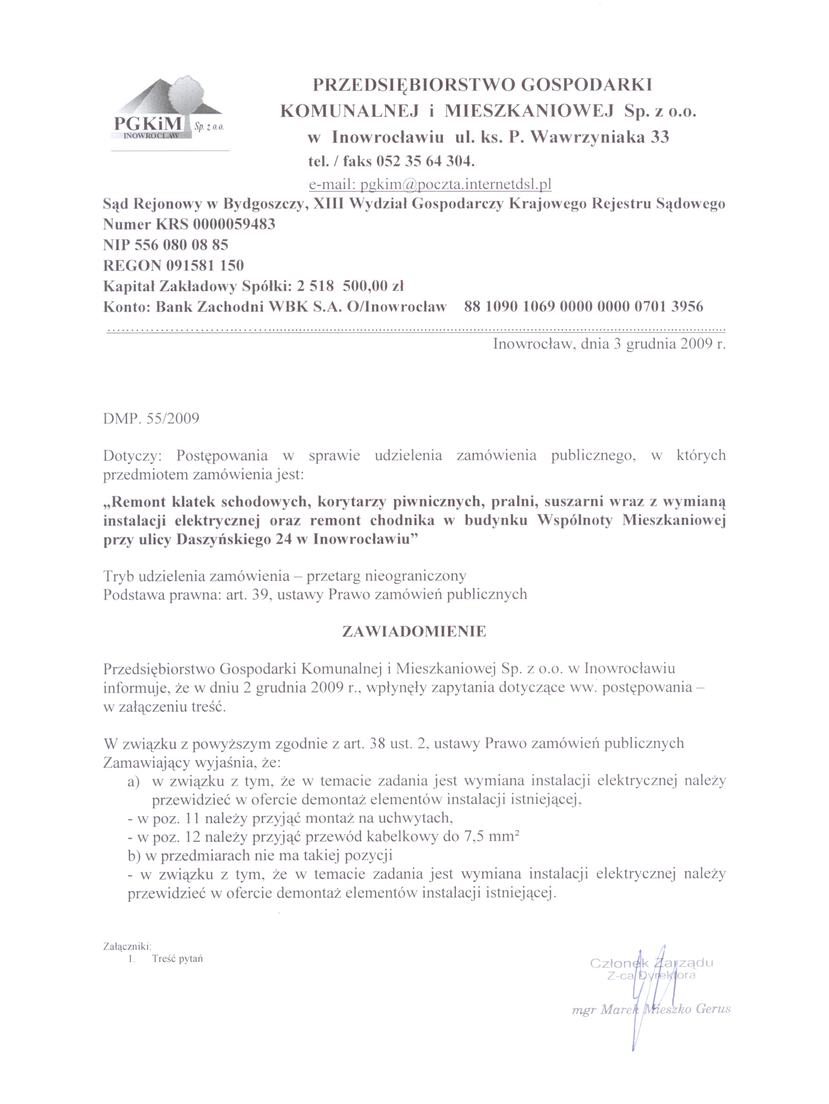 Numer sprawy: DMP. 55/2009聽聽聽聽聽聽聽聽聽聽聽聽聽聽聽聽聽聽聽聽聽聽聽聽聽聽聽聽聽Inowroc艂aw, dnia 17 listopada 2009 r.聽聽 聽