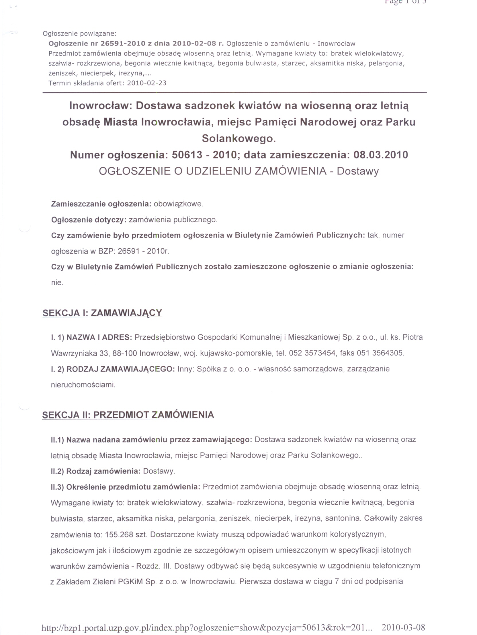 II.1.1) Nazwa nadana zam贸wieniu przez zamawiaj膮cego: Dostawa sadzonek kwiat贸w na wiosenn膮 oraz letni膮 obsad臋 Miasta Inowroc艂awia, miejsc Pami臋ci Narodowej oraz Parku Solankowego.