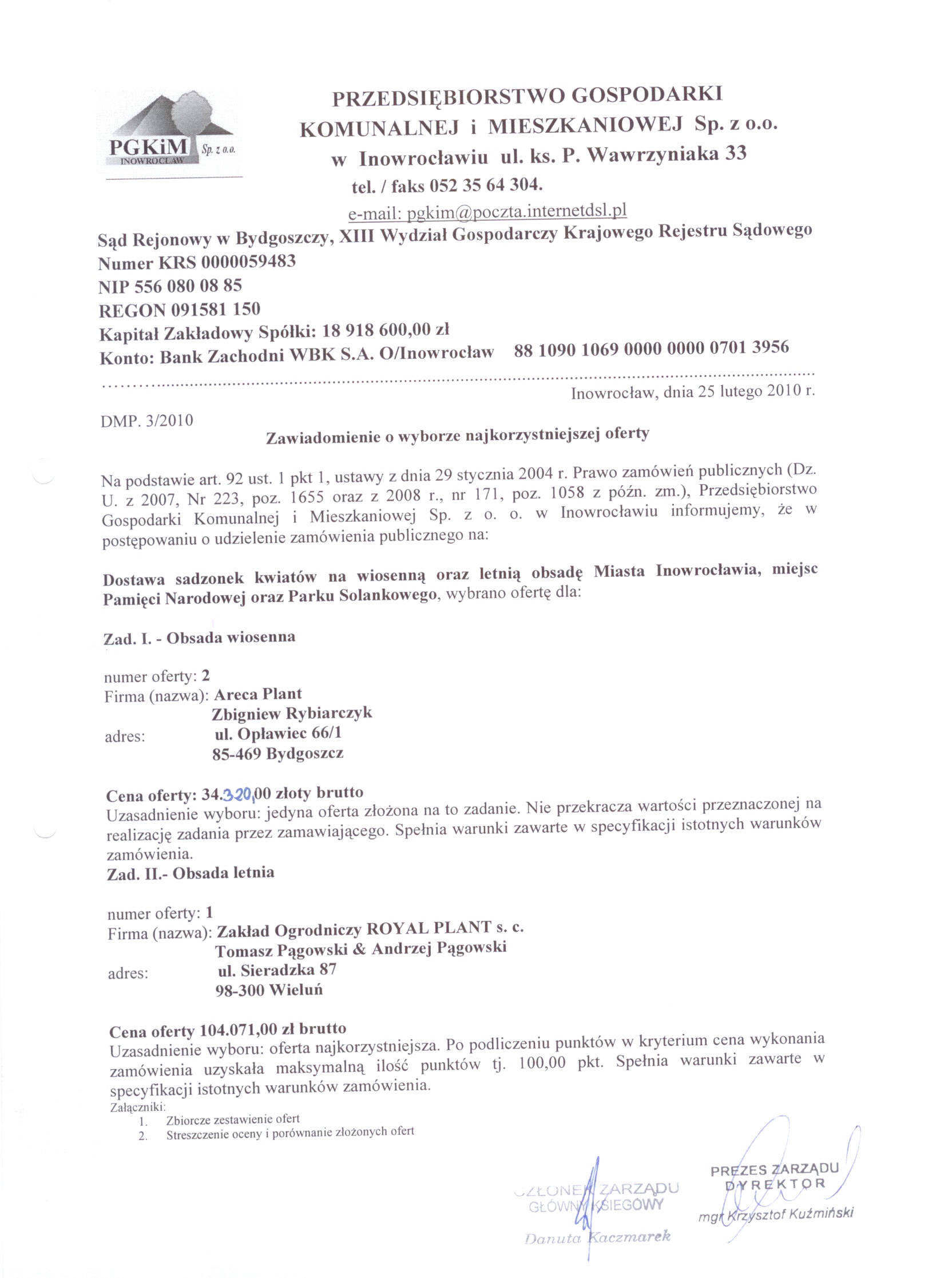 I. 1) NAZWA I ADRES: Przedsi臋biorstwo Gospodarki Komunalnej i Mieszkaniowej Sp. z o.o. , ul. ks. Piotra Wawrzyniaka 33, 88-100 Inowroc艂aw, woj. kujawsko-pomorskie, tel. 052 3573454, faks 051 3564305.