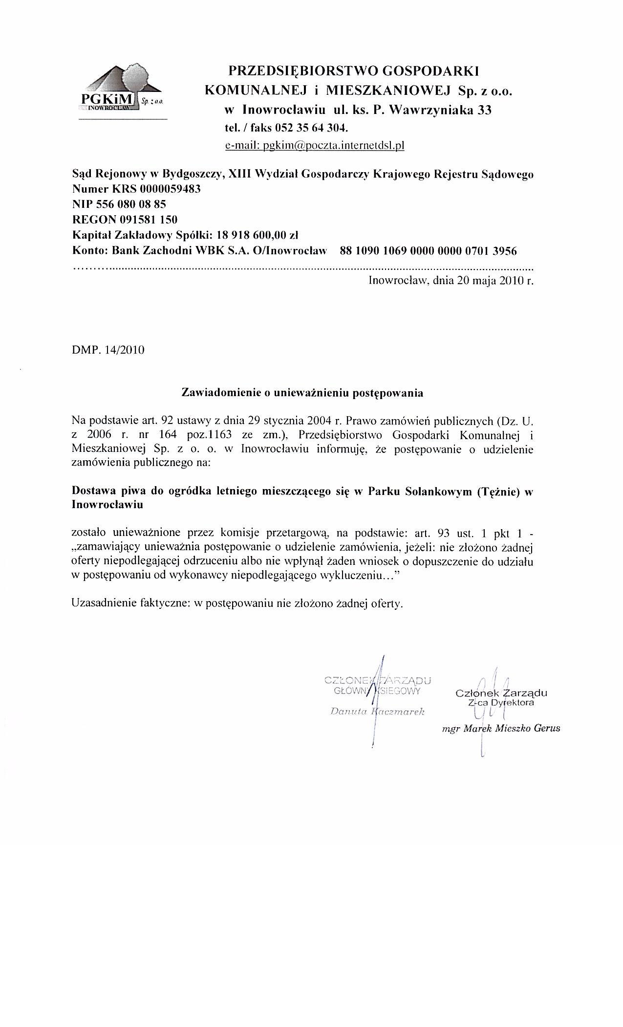 Zamieszczanie ogłoszenia: obowiązkowe. Ogłoszenie dotyczy: zamówienia publicznego. SEKCJA I: ZAMAWIAJĄCY I. 1) NAZWA I ADRES: Przedsiębiorstwo Gospodarki Komunalnej i Mieszkaniowej Sp. z o.o. , ul. ks. Piotra Wawrzyniaka 33, 88-100 Inowrocław, woj. kujawsko-pomorskie, tel. 052 3573454, faks 051 3564305.