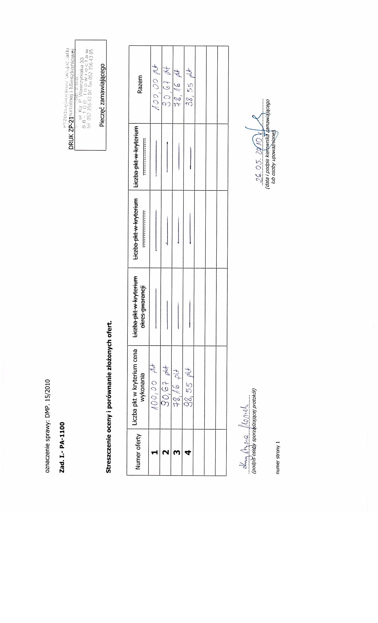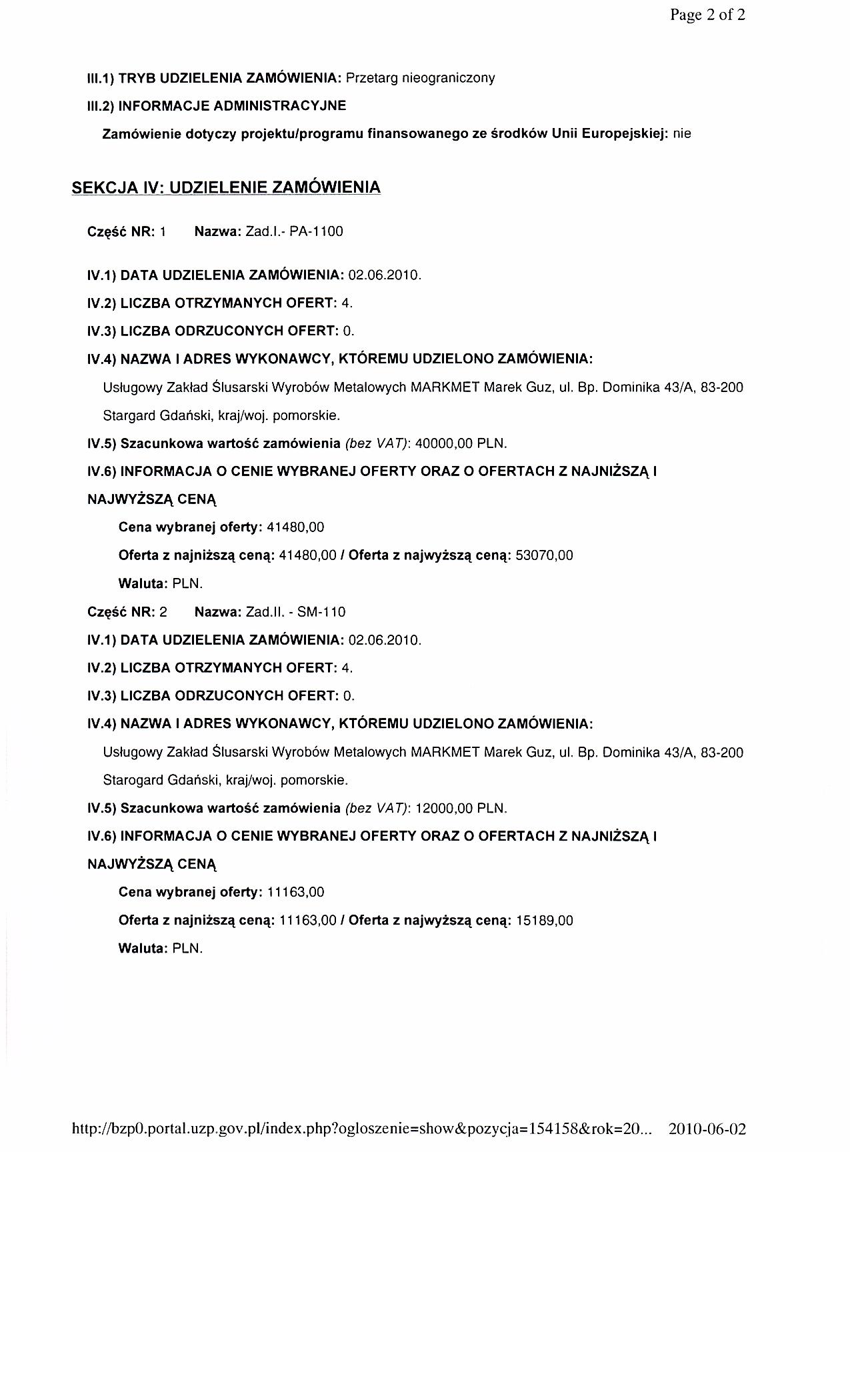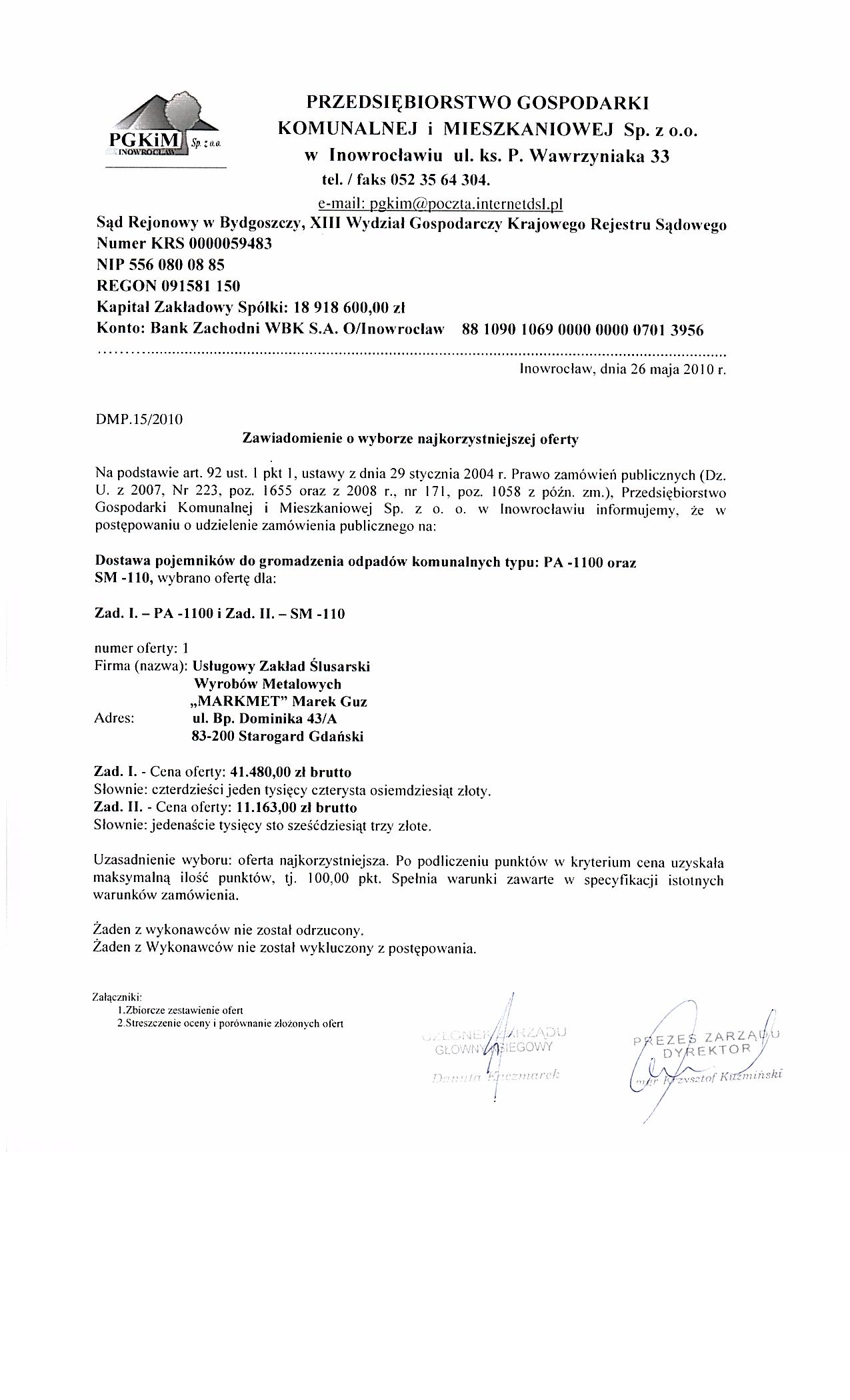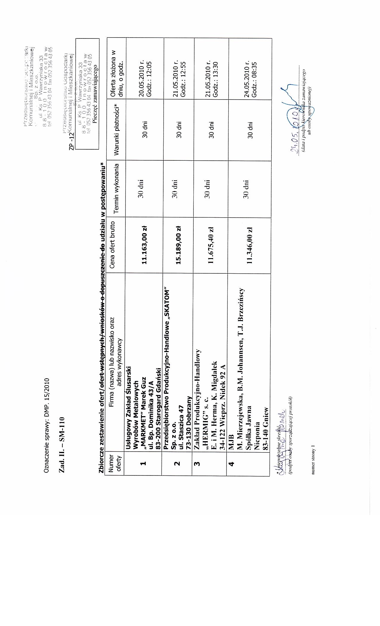 IV.4.4) Termin sk艂adania wniosk贸w o dopuszczenie do udzia艂u w post臋powaniu lub ofert: 24.05.2010 godzina 09:50, miejsce: Przedsi臋biorstwo Gospodarki Komunalnej i Mieszkaniowej sp. z o. o., ul. ks. Piotra Wawrzyniak 33, 88-100 Inowroc艂aw, sekretariat 1 pi臋tro.. IV.4.5) Termin zwi膮zania ofert膮: okres w dniach: 30 (od ostatecznego terminu sk艂adania ofert). IV.4.17) Czy przewiduje si臋 uniewa偶nienie post臋powania o udzielenie zam贸wienia, w przypadku nieprzyznania 艣rodk贸w pochodz膮cych z bud偶etu Unii Europejskiej oraz niepodlegaj膮cych zwrotowi 艣rodk贸w z pomocy udzielonej przez pa艅stwa cz艂onkowskie Europejskiego Porozumienia o Wolnym Handlu (EFTA), kt贸re mia艂y by膰 przeznaczone na sfinansowanie ca艂o艣ci lub cz臋艣ci zam贸wienia: nie ZA艁膭CZNIK I - INFORMACJE DOTYCZ膭CE OFERT CZ臉艢CIOWYCH CZ臉艢膯 Nr: 1 NAZWA: Zad. I. - PA 1100. 1) Kr贸tki opis ze wskazaniem wielko艣ci lub zakresu zam贸wienia: Zakres zam贸wienia - 50 szt. 2) Wsp贸lny S艂ownik Zam贸wie艅 (CPV): 34.92.84.80-6. 3) Czas trwania lub termin wykonania: Okres w dniach: 30. 4) Kryteria oceny ofert: najni偶sza cena.
