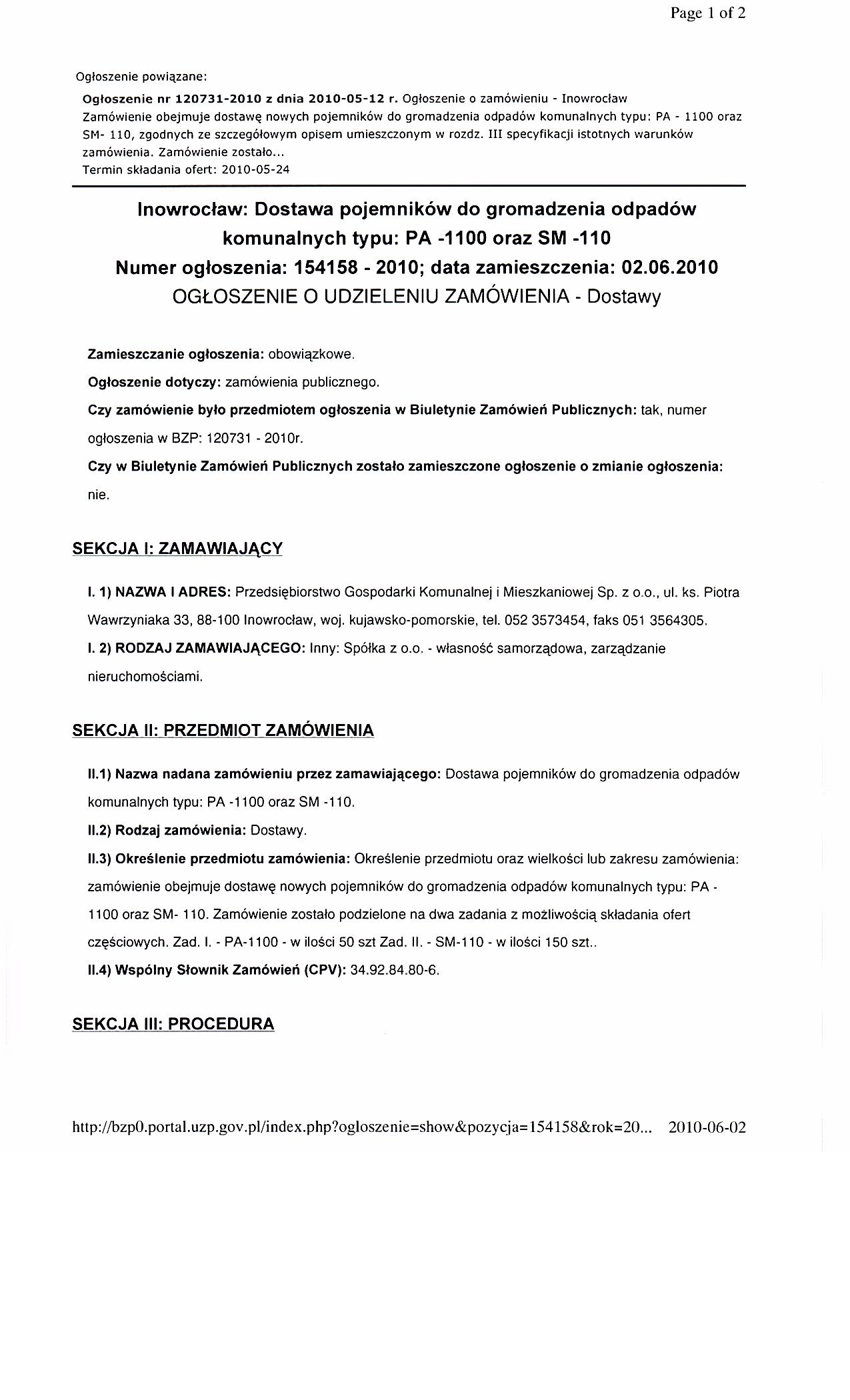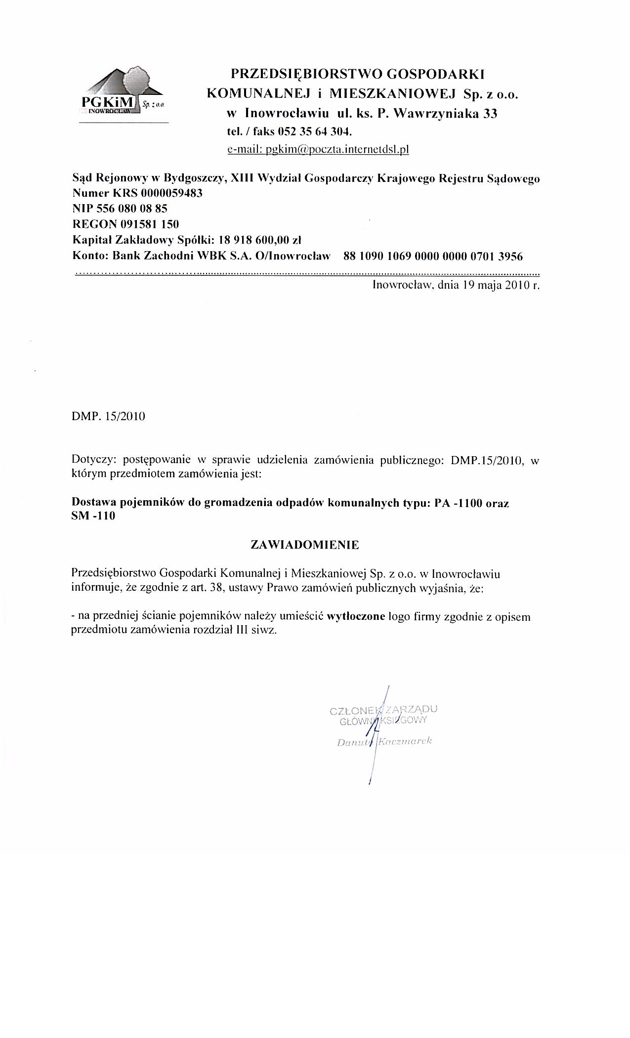 Og艂oszenie dotyczy: zam贸wienia publicznego. SEKCJA I: ZAMAWIAJ膭CY I. 1) NAZWA I ADRES: Przedsi臋biorstwo Gospodarki Komunalnej i Mieszkaniowej Sp. z o.o. , ul. ks. Piotra Wawrzyniaka 33, 88-100 Inowroc艂aw, woj. kujawsko-pomorskie, tel. 052 3573454, faks 051 3564305. Adres strony internetowej zamawiaj膮cego: www.pgkimino.pl I. 2) RODZAJ ZAMAWIAJ膭CEGO: Inny: Sp贸艂ka z o. o. - w艂asno艣膰 samorz膮dowa, zarz膮dzanie nieruchomo艣ciami. SEKCJA II: PRZEDMIOT ZAM脫WIENIA II.1) OKRE艢LENIE PRZEDMIOTU ZAM脫WIENIA II.1.1) Nazwa nadana zam贸wieniu przez zamawiaj膮cego: Dostawa pojemnik贸w do gromadzenia odpad贸w komunalnych typu: PA -1100 oraz SM -110. II.1.2) Rodzaj zam贸wienia: dostawy. II.1.3) Okre艣lenie przedmiotu oraz wielko艣ci lub zakresu zam贸wienia: Zam贸wienie obejmuje dostaw臋 nowych pojemnik贸w do gromadzenia odpad贸w komunalnych typu: PA - 1100 oraz SM- 110, zgodnych ze szczeg贸艂owym opisem umieszczonym w rozdz. III specyfikacji istotnych warunk贸w zam贸wienia. Zam贸wienie zosta艂o podzielone na dwa zadania z mo偶liwo艣ci膮 sk艂adania ofert cz臋艣ciowych, w tym: Zad. I. - PA 1100 - w ilo艣ci 50 szt Zad. II. - SM - 110 - w ilo艣ci 150 szt. Wymagane warunki techniczne, organizacyjne wykonania zam贸wienia: a) wszystkie tworzywa u偶ywane w produkcji nie mog膮 zawiera膰 kadmu, o艂owiu lub innych pierwiastk贸w szkodliwych dla 艣rodowiska, b) pojemniki musz膮 by膰 wykonane zgodnie z obowi膮zuj膮cymi normami. Transport w艂asny dostawcy do zamawiaj膮cego, Inowroc艂aw ul. Toru艅ska 165, Zak艂ad Us艂ug Sanitarnych i Porz膮dkowych.. II.1.4) Czy przewiduje si臋 udzielenie zam贸wie艅 uzupe艂niaj膮cych: tak. Okre艣lenie przedmiotu oraz wielko艣ci lub zakresu zam贸wie艅 uzupe艂niaj膮cych 1. Zamawiaj膮cy przewiduje mo偶liwo艣ci udzielenia zam贸wie艅 uzupe艂niaj膮cych, o kt贸rych mowa w art. 67 ust.1, ustawy Prawo zam贸wie艅 publicznych. 2. Je偶eli nast膮pi konieczno艣膰 skorzystania z zam贸wienia uzupe艂niaj膮cego b臋dzie ono udzielone do wysoko艣ci 20 % warto艣ci zam贸wienia podstawowego na podstawie odr臋bnej umowy. II.1.5) Wsp贸lny S艂ownik Zam贸wie艅 (CPV): 34.92.84.80-6. II.1.6) Czy dopuszcza si臋 z艂o偶enie oferty cz臋艣ciowej: tak, liczba cz臋艣ci: 2. II.1.7) Czy dopuszcza si臋 z艂o偶enie oferty wariantowej: nie.