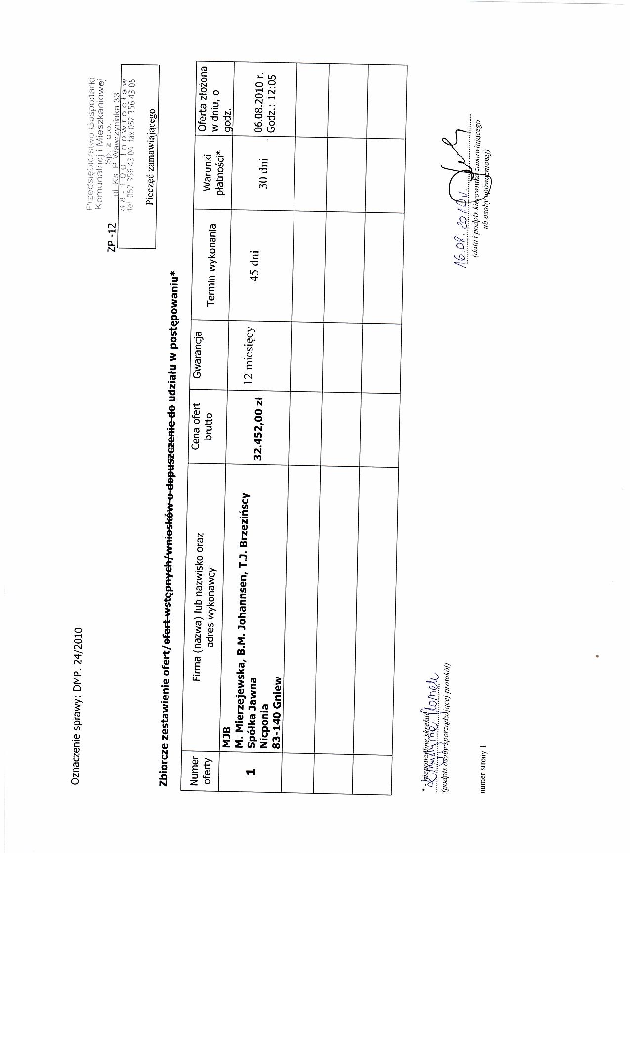 IV.4.4) Termin sk艂adania wniosk贸w o dopuszczenie do udzia艂u w post臋powaniu lub ofert: 16.08.2010 godzina 09:50, miejsce: Przedsi臋biorstwo Gospodarki Komunalnej i Mieszkaniowej sp. z o. o., ul. ks. Piotra Wawrzyniak 33, 88-100 Inowroc艂aw, sekretariat 1 pi臋tro.