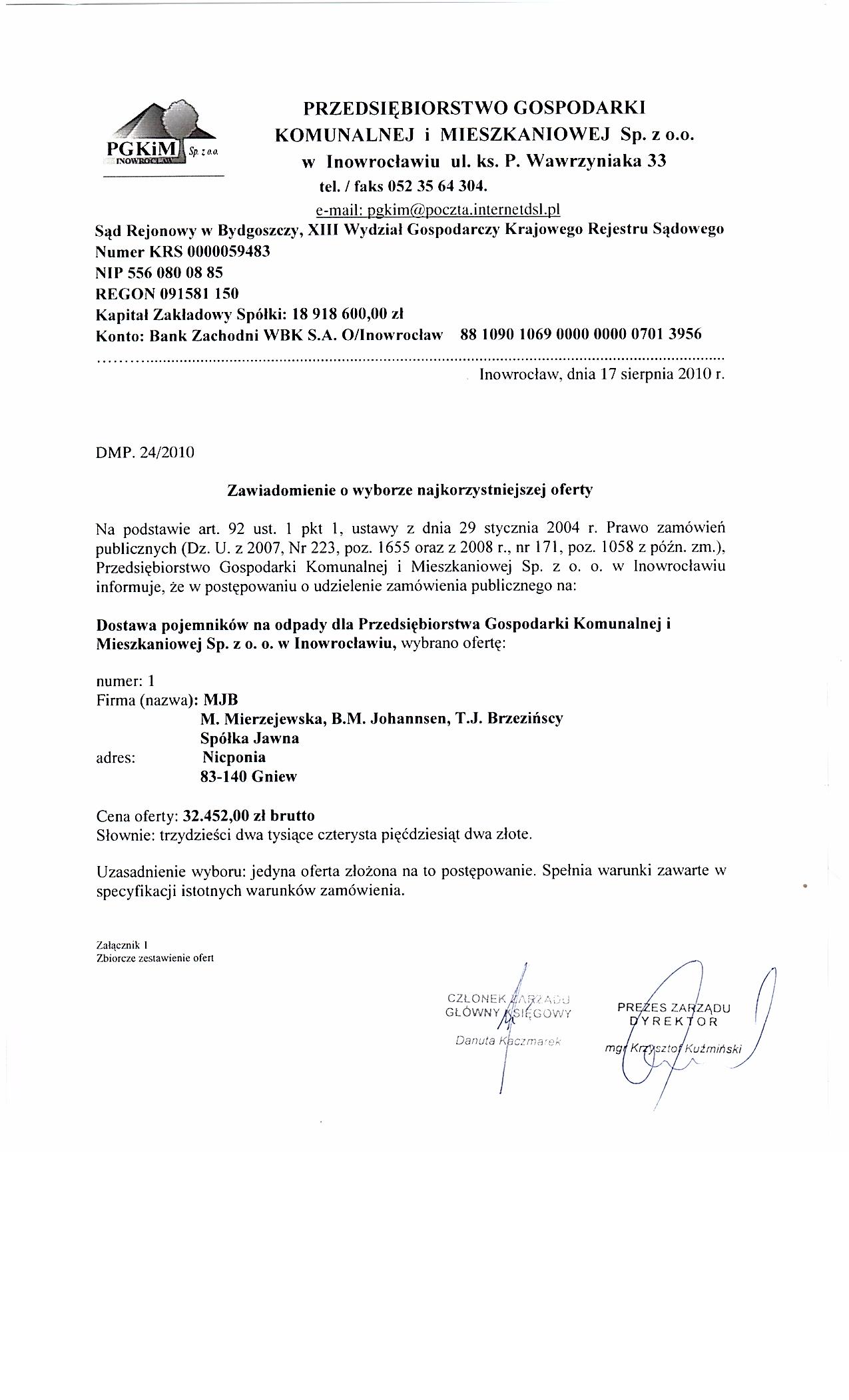 聽 Zamieszczanie og艂oszenia: obowi膮zkowe. Og艂oszenie dotyczy: zam贸wienia publicznego. SEKCJA I: ZAMAWIAJ膭CY I. 1) NAZWA I ADRES: Przedsi臋biorstwo Gospodarki Komunalnej i Mieszkaniowej Sp. z o.o. , ul. ks. Piotra Wawrzyniaka 33, 88-100 Inowroc艂aw, woj. kujawsko-pomorskie, tel. 052 35 64 300, faks 052 35 64 305. Adres strony internetowej zamawiaj膮cego: www.pgkimino.pl I. 2) RODZAJ ZAMAWIAJ膭CEGO: Inny: Sp贸艂ka z o.o.- w艂asno艣膰 samorz膮dowa, zarz膮dzanie nieruchomo艣ciami. SEKCJA II: PRZEDMIOT ZAM脫WIENIA II.1) OKRE艢LENIE PRZEDMIOTU ZAM脫WIENIA
