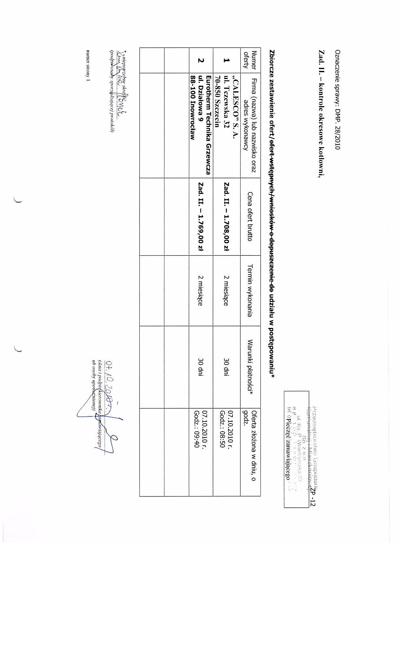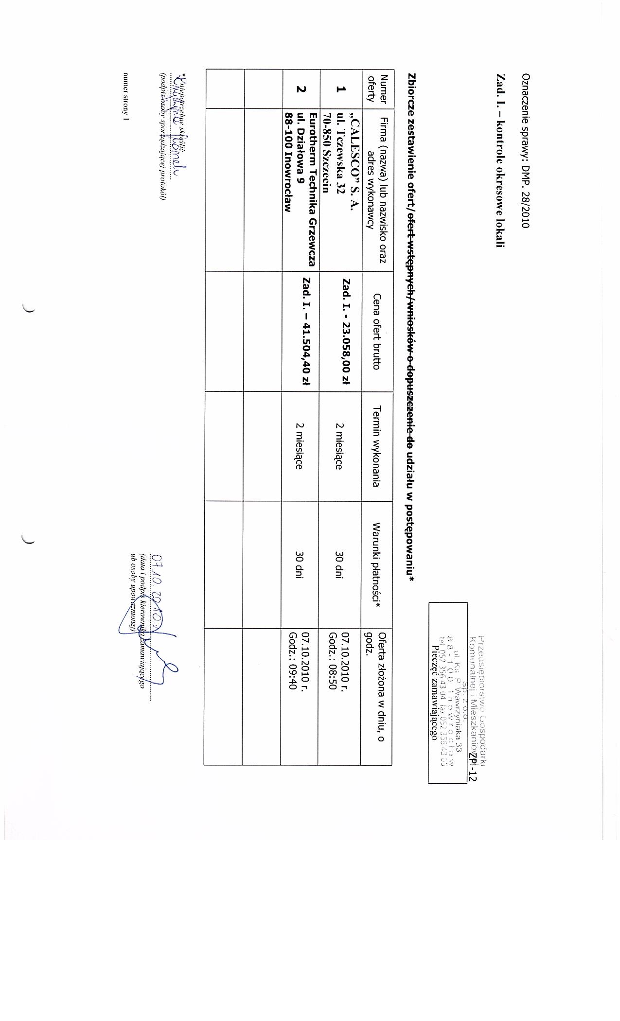 IV.4.4) Termin sk艂adania wniosk贸w o dopuszczenie do udzia艂u w post臋powaniu lub ofert: 07.10.2010 godzina 09:50, miejsce: Przedsi臋biorstwo Gospodarki Komunalnej i Mieszkaniowej sp. z o. o., ul. ks. Piotra Wawrzyniak 33, 88-100 Inowroc艂aw, sekretariat 1 pi臋tro.. IV.4.5) Termin zwi膮zania ofert膮: okres w dniach: 30 (od ostatecznego terminu sk艂adania ofert). IV.4.17) Czy przewiduje si臋 uniewa偶nienie post臋powania o udzielenie zam贸wienia, w przypadku nieprzyznania 艣rodk贸w pochodz膮cych z bud偶etu Unii Europejskiej oraz niepodlegaj膮cych zwrotowi 艣rodk贸w z pomocy udzielonej przez pa艅stwa cz艂onkowskie Europejskiego Porozumienia o Wolnym Handlu (EFTA), kt贸re mia艂y by膰 przeznaczone na sfinansowanie ca艂o艣ci lub cz臋艣ci zam贸wienia: nie ZA艁膭CZNIK I - INFORMACJE DOTYCZ膭CE OFERT CZ臉艢CIOWYCH CZ臉艢膯 Nr: 1 NAZWA: Zad. I. - kontrole okresowe lokali. 1) Kr贸tki opis ze wskazaniem wielko艣ci lub zakresu zam贸wienia: Obejmuje 126 lokali (zgodnie z za艂膮cznikiem nr 6 do siwz). 2) Wsp贸lny S艂ownik Zam贸wie艅 (CPV): 71.63.00.00-3. 3) Czas trwania lub termin wykonania: Okres w miesi膮cach: 2. 4) Kryteria oceny ofert: najni偶sza cena. CZ臉艢膯 Nr: 2 NAZWA: Zad. II. - kontrole okresowe kot艂owni. 1) Kr贸tki opis ze wskazaniem wielko艣ci lub zakresu zam贸wienia: Obejmuje 5 kot艂owni (zgodnie z za艂膮cznikiem nr 7 do siwz).. 2) Wsp贸lny S艂ownik Zam贸wie艅 (CPV): 71.63.00.00-3. 3) Czas trwania lub termin wykonania: Okres w miesi膮cach: 2. 4) Kryteria oceny ofert: najni偶sza cena. 聽 聽 聽 |