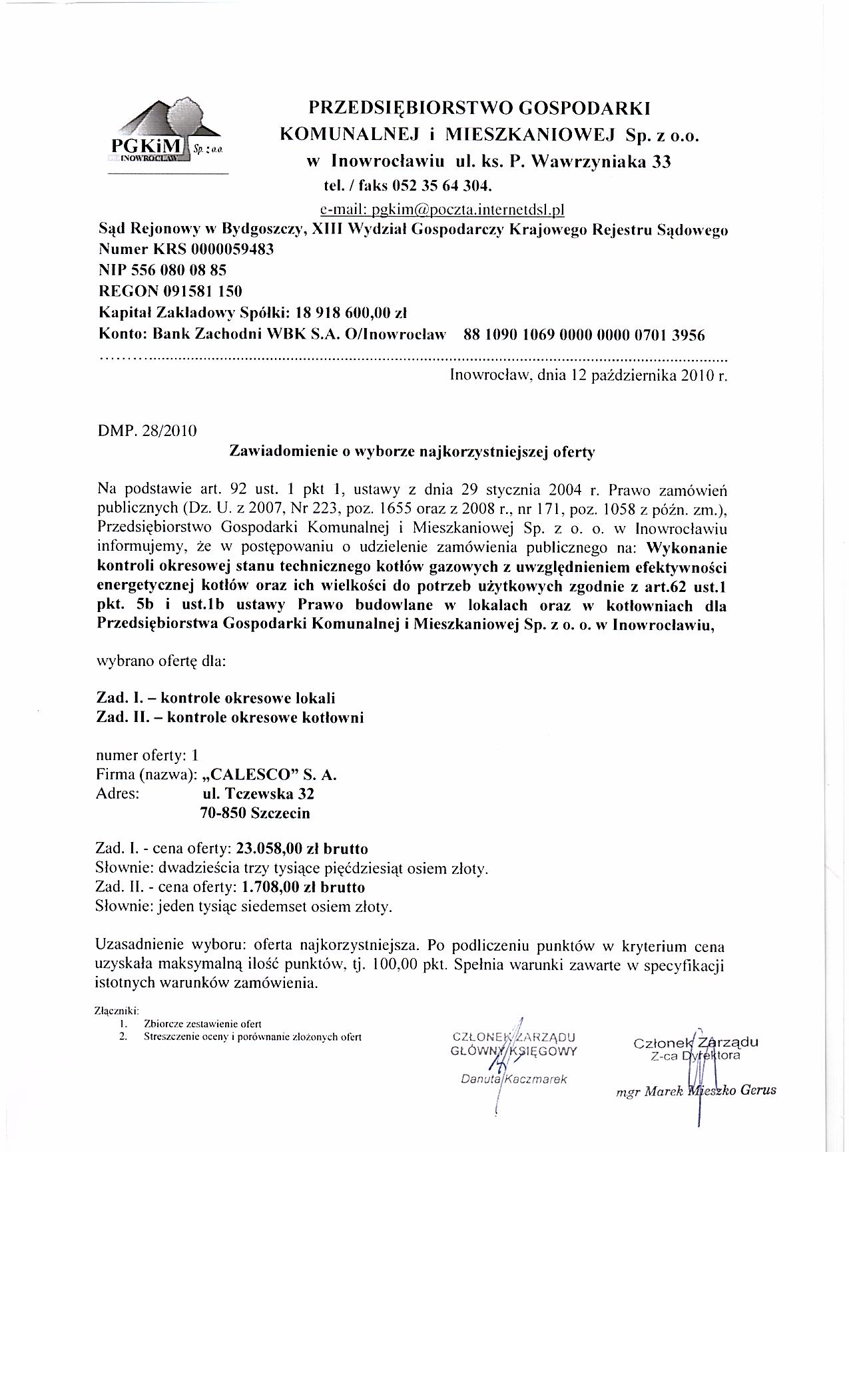 Zamieszczanie og艂oszenia: obowi膮zkowe. Og艂oszenie dotyczy: zam贸wienia publicznego. SEKCJA I: ZAMAWIAJ膭CY I. 1) NAZWA I ADRES: Przedsi臋biorstwo Gospodarki Komunalnej i Mieszkaniowej Sp. z o.o. , ul. ks. Piotra Wawrzyniaka 33, 88-100 Inowroc艂aw, woj. kujawsko-pomorskie, tel. 052 3573454, faks 051 3564305. Adres strony internetowej zamawiaj膮cego: www.pgkimino.pl I. 2) RODZAJ ZAMAWIAJ膭CEGO: Inny: Sp贸艂ka z o. o. - w艂asno艣膰 samorz膮dowa, zarz膮dzanie nieruchomo艣ciami. SEKCJA II: PRZEDMIOT ZAM脫WIENIA II.1) OKRE艢LENIE PRZEDMIOTU ZAM脫WIENIA II.1.1) Nazwa nadana zam贸wieniu przez zamawiaj膮cego: Wykonanie kontroli okresowej stanu technicznego kot艂贸w gazowych z uwzgl臋dnieniem efektywno艣ci energetycznej kot艂贸w oraz ich wielko艣ci do potrzeb u偶ytkowych zgodnie z art.62 ust.1 pkt. 5b i ust.1b ustawy Prawo budowlane w lokalach oraz w kot艂owniach dla Przedsi臋biorstwa Gospodarki Komunalnej i Mieszkaniowej Sp. z o. o. w Inowroc艂awiu. II.1.2) Rodzaj zam贸wienia: us艂ugi. II.1.3) Okre艣lenie przedmiotu oraz wielko艣ci lub zakresu zam贸wienia: Przedmiotem zam贸wienia jest okresowa kontrola stanu technicznego kot艂贸w z uwzgl臋dnieniem ich efektywno艣ci energetycznej oraz wielko艣ci w odniesieniu do potrzeb u偶ytkowych. Kontroli b臋d膮 podlega艂y kot艂y opalane gazem. Kontrol臋 powinny przeprowadza膰 osoby posiadaj膮ce kwalifikacje wymagane przy wykonywaniu dozoru nad eksploatacj膮 urz膮dze艅, instalacji i sieci gazowych. Zakres kontroli powinien obejmowa膰: ocen臋 stanu technicznego kot艂a, ocen臋 efektywno艣ci spalania, ocen臋 wielko艣ci kot艂a w stosunku do rzeczywistych potrzeb oraz sporz膮dzenie protoko艂u zawieraj膮cego ewentualne zalecenia wraz z ocen膮 ich zasadno艣ci ekonomicznej. W przypadku kot艂贸w starszych ni偶 15 lat nale偶y wyda膰 zalecenie wymiany albo jego modernizacji lub te偶 aprobat臋 stanu istniej膮cego. Okresowe kontrole musz膮 by膰 przeprowadzone zgodnie z art.62 ust.1 pkt. 5b i ust.1b ustawy Prawo budowlane. Szczeg贸艂owe informacje zawarte s膮 w specyfikacji istotnych warunk贸w zam贸wienia. Zam贸wienie podzielona na 2 zadania z mo偶liwo艣ci膮 sk艂adania ofert cz臋艣ciowych, w tym: Zad. I. - kontrole okresowe lokali, obejmuje 126 lokali (zgodnie z za艂膮cznikiem nr 6 do siwz) Zad. II. - kontrole okresowe kot艂owni, obejmuje 5 kot艂owni (zgodnie z za艂膮cznikiem nr 7 do siwz).. II.1.4) Czy przewiduje si臋 udzielenie zam贸wie艅 uzupe艂niaj膮cych: tak. Okre艣lenie przedmiotu oraz wielko艣ci lub zakresu zam贸wie艅 uzupe艂niaj膮cych 1. Zamawiaj膮cy przewiduje mo偶liwo艣膰 udzielenia zam贸wie艅 uzupe艂niaj膮cych, o kt贸rych mowa w art. 67 ust.1, ustawy Prawo zam贸wie艅 publicznych. 2. Je偶eli nast膮pi konieczno艣膰 skorzystania z zam贸wienia uzupe艂niaj膮cego b臋dzie ono udzielone do wysoko艣ci 20 % warto艣ci zam贸wienia podstawowego na podstawie odr臋bnej umowy. II.1.5) Wsp贸lny S艂ownik Zam贸wie艅 (CPV): 71.63.00.00-3. II.1.6) Czy dopuszcza si臋 z艂o偶enie oferty cz臋艣ciowej: tak, liczba cz臋艣ci: 2. II.1.7) Czy dopuszcza si臋 z艂o偶enie oferty wariantowej: nie. II.2) CZAS TRWANIA ZAM脫WIENIA LUB TERMIN WYKONANIA: Okres w miesi膮cach: 2. SEKCJA III: INFORMACJE O CHARAKTERZE PRAWNYM, EKONOMICZNYM, FINANSOWYM I TECHNICZNYM III.1) WADIUM Informacja na temat wadium: Zamawiaj膮cy nie wymaga wadium. III.2) ZALICZKI Czy przewiduje si臋 udzielenie zaliczek na poczet wykonania zam贸wienia: nie III.3) WARUNKI UDZIA艁U W POST臉POWANIU ORAZ OPIS SPOSOBU DOKONYWANIA OCENY SPE艁NIANIA TYCH WARUNK脫W III.3.4) Osoby zdolne do wykonania zam贸wienia Opis sposobu dokonywania oceny spe艂niania tego warunku Wykonawca musi wykaza膰, 偶e posiada osoby zdolne do wykonania zam贸wienia. Zamawiaj膮cy stwierdzi to na podstawie do艂膮czonego do oferty wykazu wraz z informacjami na temat ich kwalifikacji zawodowych, do艣wiadczenia i wykszta艂cenia niezb臋dnego dla wykonania zam贸wienia (za艂膮cznik nr 4 do siwz). Zamawiaj膮cy oceni wykonawc臋 na zasadzie spe艂nia/ nie spe艂nia. III.4) INFORMACJA O O艢WIADCZENIACH LUB DOKUMENTACH, JAKIE MAJ膭 DOSTARCZY膯 WYKONAWCY W CELU POTWIERDZENIA SPE艁NIANIA WARUNK脫W UDZIA艁U W POST臉POWANIU ORAZ NIEPODLEGANIA WYKLUCZENIU NA PODSTAWIE ART. 24 UST. 1 USTAWY III.4.1) W zakresie wykazania spe艂niania przez wykonawc臋 warunk贸w, o kt贸rych mowa w art. 22 ust. 1 ustawy, opr贸cz o艣wiadczenia o spe艂nieniu warunk贸w udzia艂u w post臋powaniu, nale偶y przed艂o偶y膰: a) wykaz os贸b, kt贸re b臋d膮 uczestniczy膰 w wykonywaniu zam贸wienia, w szczeg贸lno艣ci odpowiedzialnych za 艣wiadczenie us艂ug, kontrol臋 jako艣ci lub kierowanie robotami budowlanymi, wraz z informacjami na temat ich kwalifikacji zawodowych, do艣wiadczenia i wykszta艂cenia niezb臋dnych dla wykonania zam贸wienia, a tak偶e zakresu wykonywanych przez nie czynno艣ci, oraz informacj膮 o podstawie do dysponowania tymi osobami III.4.2) W zakresie potwierdzenia niepodlegania wykluczeniu na podstawie art. 24 ust. 1 ustawy, nale偶y przed艂o偶y膰: a) o艣wiadczenie o braku podstaw do wykluczenia b) aktualny odpis z w艂a艣ciwego rejestru, je偶eli odr臋bne przepisy wymagaj膮 wpisu do rejestru, w celu wykazania braku podstaw do wykluczenia w oparciu o art. 24 ust. 1 pkt 2 ustawy, wystawiony nie wcze艣niej ni偶 6 miesi臋cy przed up艂ywem terminu sk艂adania wniosk贸w o dopuszczenie do udzia艂u w post臋powaniu o udzielenie zam贸wienia albo sk艂adania ofert, a w stosunku do os贸b fizycznych o艣wiadczenie w zakresie art. 24 ust. 1 pkt 2 ustawy III.4.3) Dokumenty podmiot贸w zagranicznych Je偶eli wykonawca ma siedzib臋 lub miejsce zamieszkania poza terytorium Rzeczypospolitej Polskiej, przedk艂ada: III.4.3.1) dokument wystawiony w kraju, w kt贸rym ma siedzib臋 lub miejsce zamieszkania potwierdzaj膮cy, 偶e: a) nie otwarto jego likwidacji ani nie og艂oszono upad艂o艣ci - wystawio