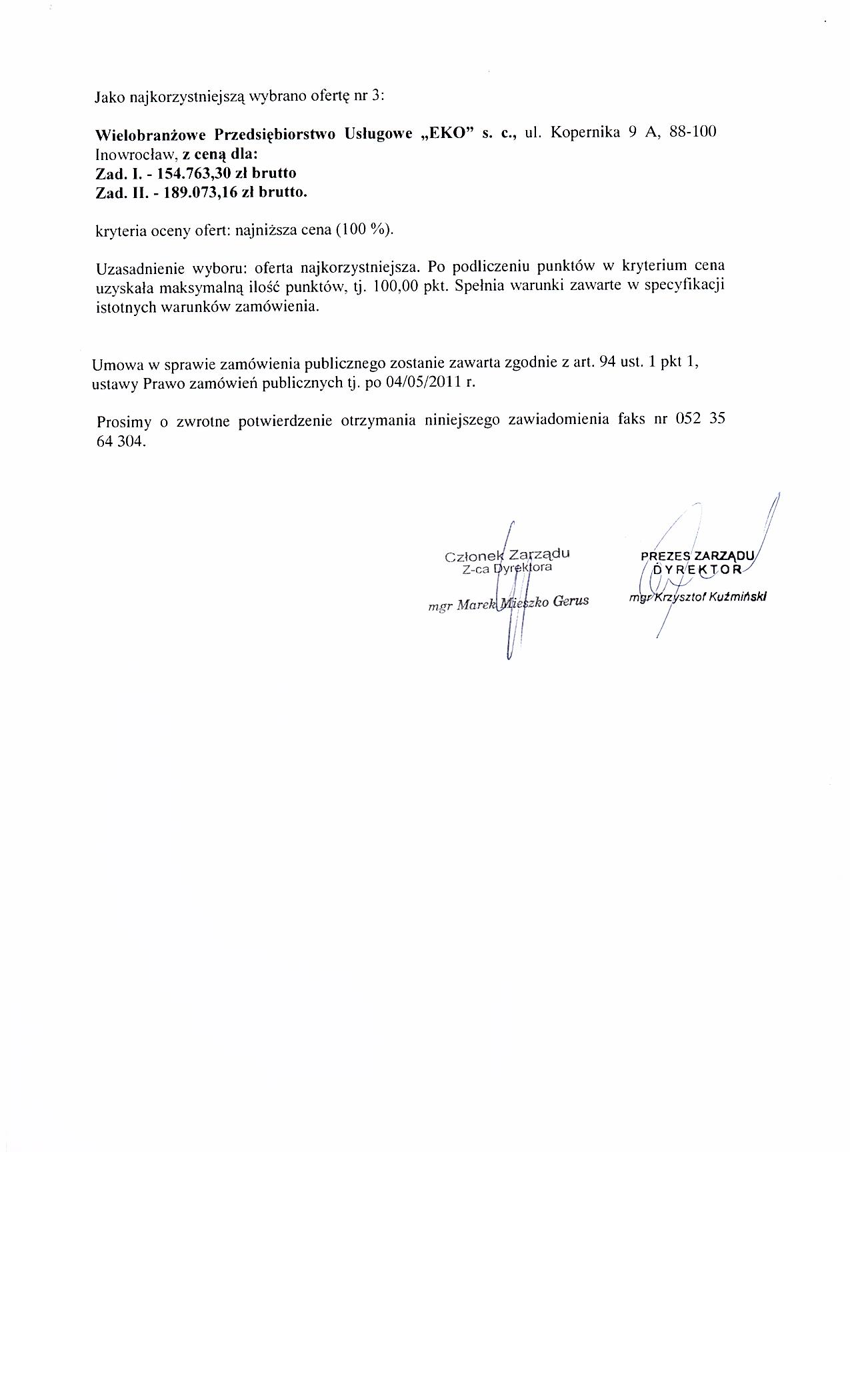 Utrzymanie czystości oraz usuwanie skutków zimy na terenie oraz w budynkach komunalnych, prywatnych, użytkowych administrowanych przez Przedsiębiorstwo Gospodarki Komunalnej i Mieszkaniowej Sp. z o. o. w Inowrocławiu