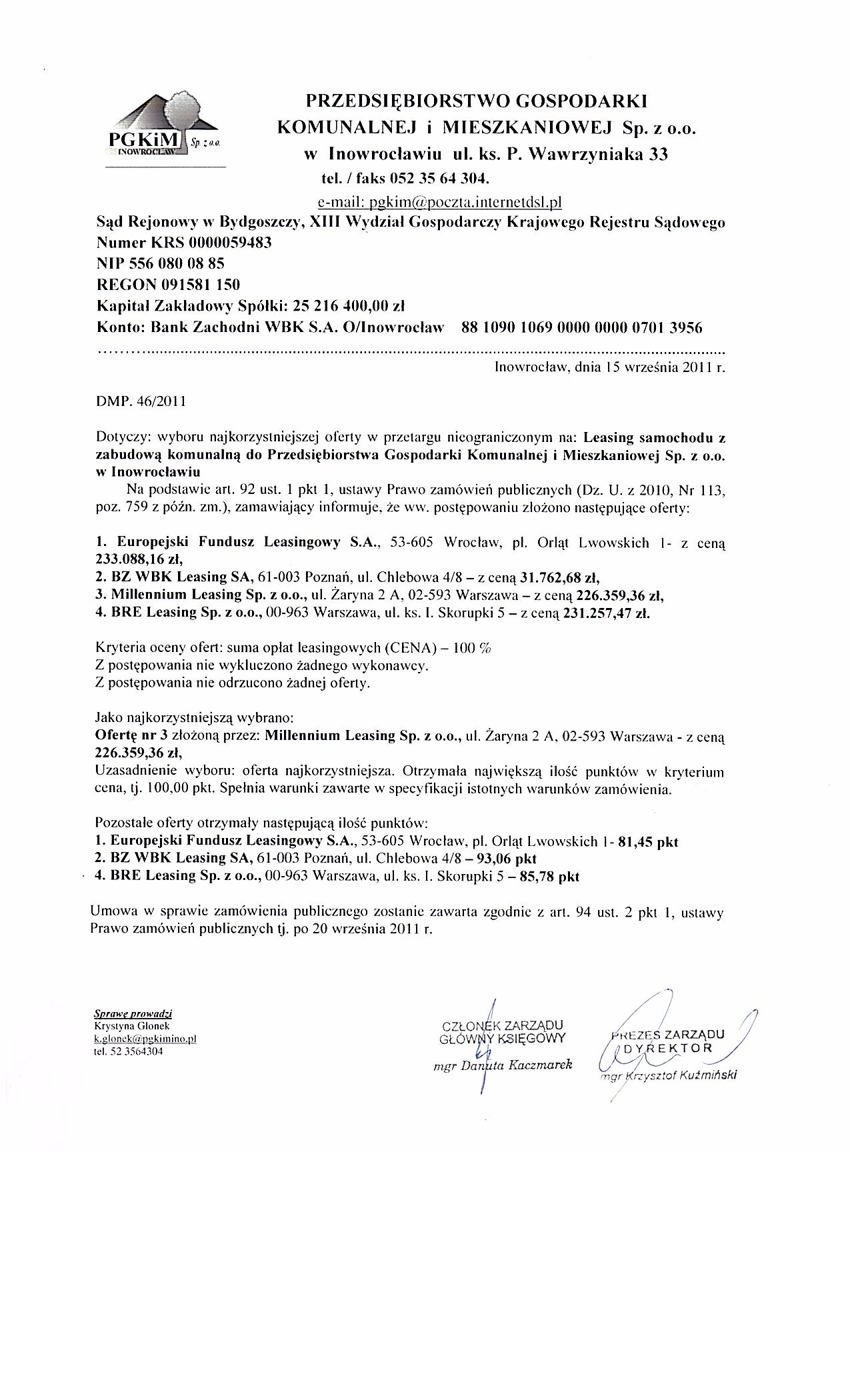 | Typ | Rozmiar | Pobierz | Komentarz | Data dodania | Licznik | ? | 22.4 KB | POBIERZ | Ogłoszenie | 2011-08-25 11:39:31 | 456 | .DOC | 244.5 KB | POBIERZ | Specyfikacja istotnych warunków zamówienia | 2011-08-25 11:40:05 | 596 | .DOC | 27 KB | POBIERZ | Zał. nr 5 do siwz | 2011-08-25 11:40:20 | 577 | graf. | 502.2 KB | POBIERZ | Zał. nr 6 do siwz | 2011-08-25 11:40:50 | 550 | graf. | 689.4 KB | POBIERZ | zał. nr 7 do siwz | 2011-08-25 11:41:16 | 557 | graf. | 294 KB | POBIERZ | Odpowiedzi na zapytania | 2011-08-30 11:13:26 | 541 | graf. | 320.3 KB | POBIERZ | Treść pytań | 2011-08-30 11:13:46 | 555 | .ZIP | 1739.7 KB | POBIERZ | KRS | 2011-08-30 11:16:09 | 514 | .ZIP | 1195.2 KB | POBIERZ | Bilans 2009 | 2011-08-30 11:16:48 | 515 | .ZIP | 1047.3 KB | POBIERZ | Bilans 2010 | 2011-08-30 11:17:15 | 531 | .ZIP | 2157.9 KB | POBIERZ | F-01 | 2011-08-30 11:18:03 | 519 | graf. | 208 KB | POBIERZ | Odpowiedzi na zapytania II | 2011-09-02 10:58:25 | 553 | graf. | 93.1 KB | POBIERZ | Treść pytań II | 2011-09-02 10:59:05 | 457 | graf. | 214.8 KB | POBIERZ | Odpowiedzi na zapytania III | 2011-09-08 08:46:56 | 494 | .ZIP | 1543.2 KB | POBIERZ | F-01, I kw. 2010 | 2011-09-08 08:48:13 | 493 | .ZIP | 2014.7 KB | POBIERZ | F-01, II kw. 2010 | 2011-09-08 08:49:04 | 503 | graf. | 79 KB | POBIERZ | Treść pytań III | 2011-09-08 08:52:07 | 516 | graf. | 281.9 KB | POBIERZ | Wybór oferty | 2011-09-15 14:37:23 | 426 | ? | 17.5 KB | POBIERZ | Ogłoszenie o udzieleniu zamówienia BZP nr 278901-2011 | 2011-10-25 08:08:17 | 435 |