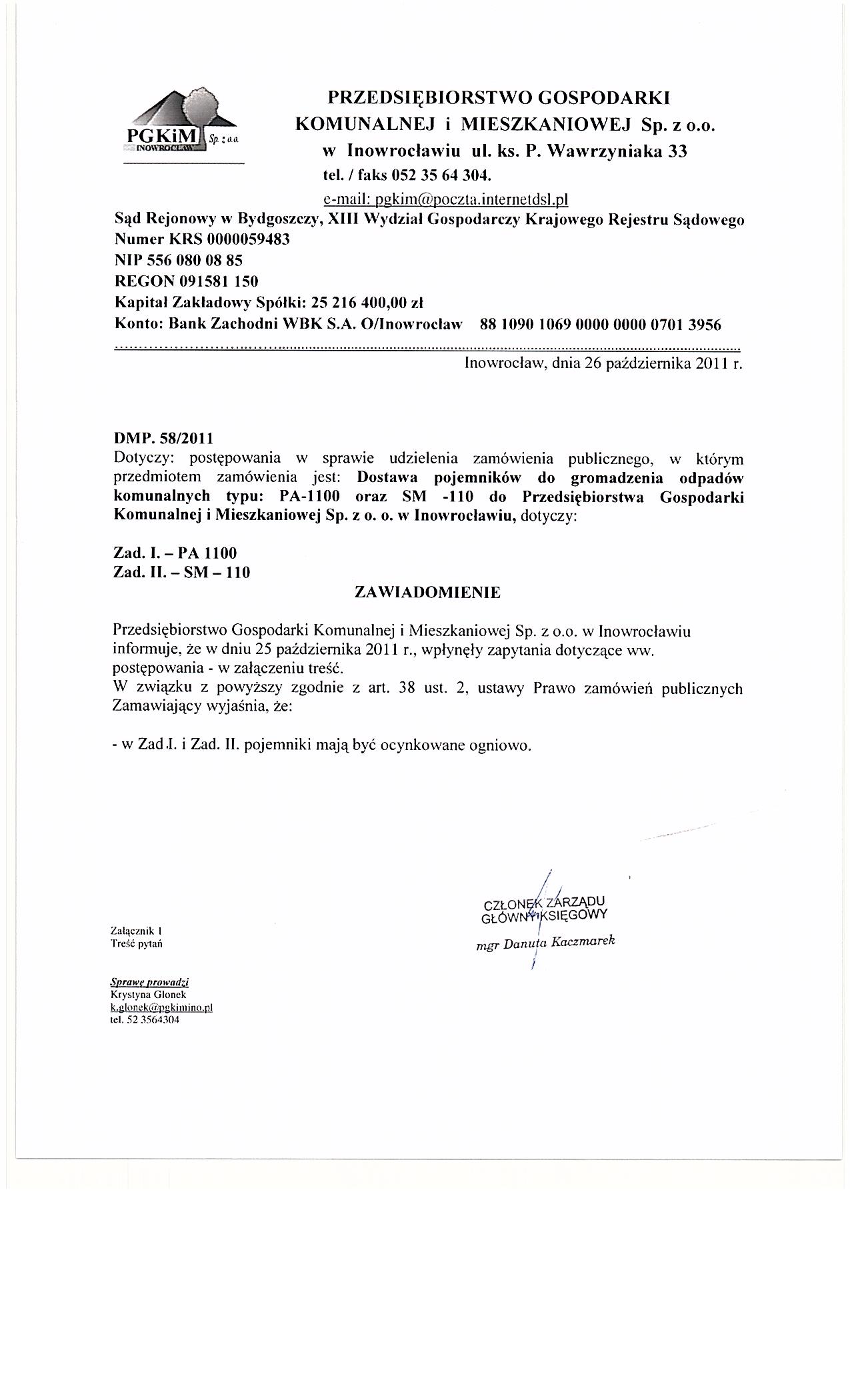 | Typ | Rozmiar | Pobierz | Komentarz | Data dodania | Licznik | ? | 24.4 KB | POBIERZ | Og艂oszenie | 2011-10-24 10:07:03 | 401 | .DOC | 292 KB | POBIERZ | Specyfikacja istotnych warunk贸w zam贸wienia | 2011-10-24 10:07:39 | 536 | graf. | 212.8 KB | POBIERZ | Odpowiedzi na zapytania | 2011-10-26 10:50:15 | 512 | graf. | 115.6 KB | POBIERZ | Tre艣膰 pyta艅 | 2011-10-26 10:50:34 | 542 | graf. | 275.8 KB | POBIERZ | Wyb贸r oferty | 2011-11-14 09:51:46 | 415 | graf. | 239.1 KB | POBIERZ | s.2 | 2011-11-14 09:52:18 | 439 | ? | 18.5 KB | POBIERZ | Og艂oszenie o udzieleniu zam贸wienia BZP nr 305823-2011 | 2011-11-23 10:58:03 | 380 |