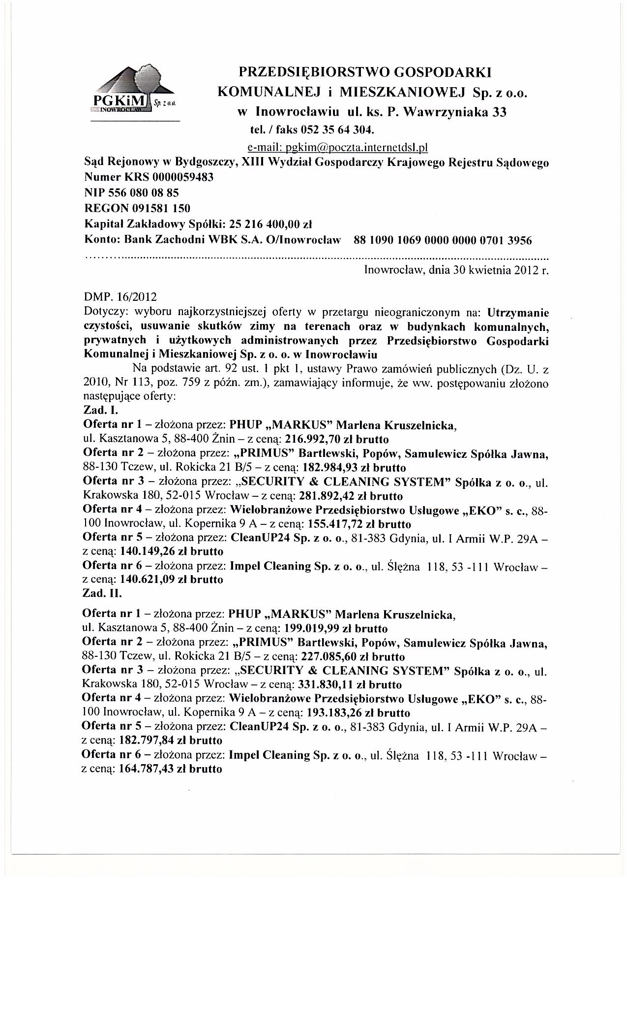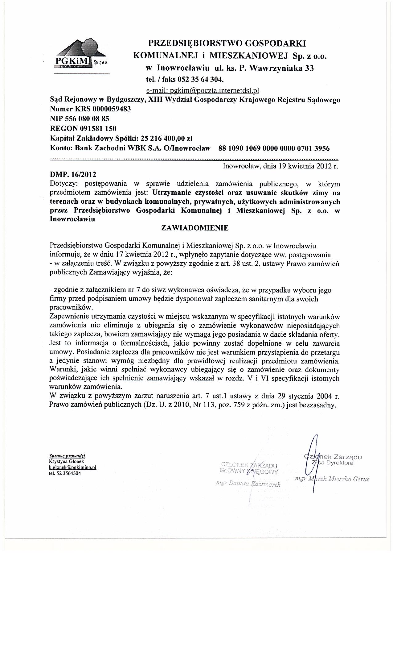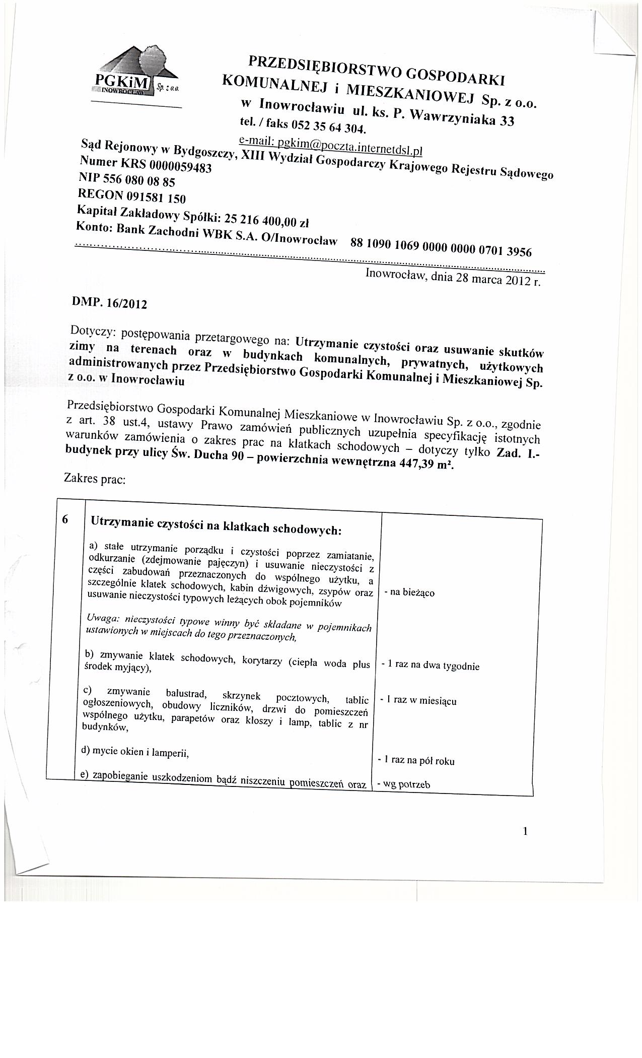 Utrzymanie czystości oraz usuwanie skutków zimy na terenach oraz w budynkach komunalnych, prywatnych, użytkowych administrowanych przez Przedsiębiorstwo Gospodarki Komunalnej i Mieszkaniowej Sp. z o. o. w Inowrocławiu