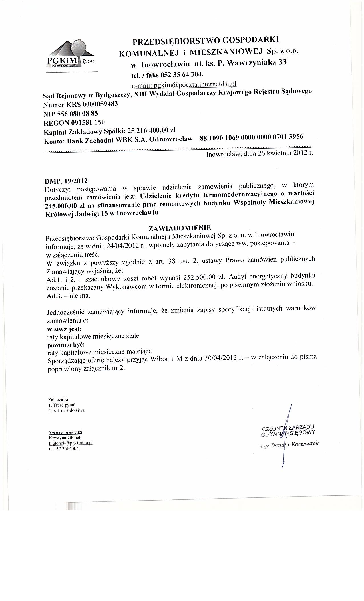 Udzielenie kredytu termomodernizacyjnego o warto艣ci 245.000,00 z艂 na sfinansowanie prac remontowych budynku Wsp贸lnoty Mieszkaniowej Kr贸lowej Jadwigi 15 w Inowroc艂awiu