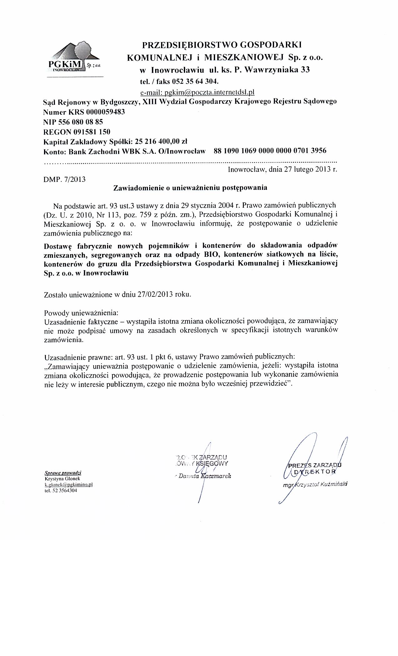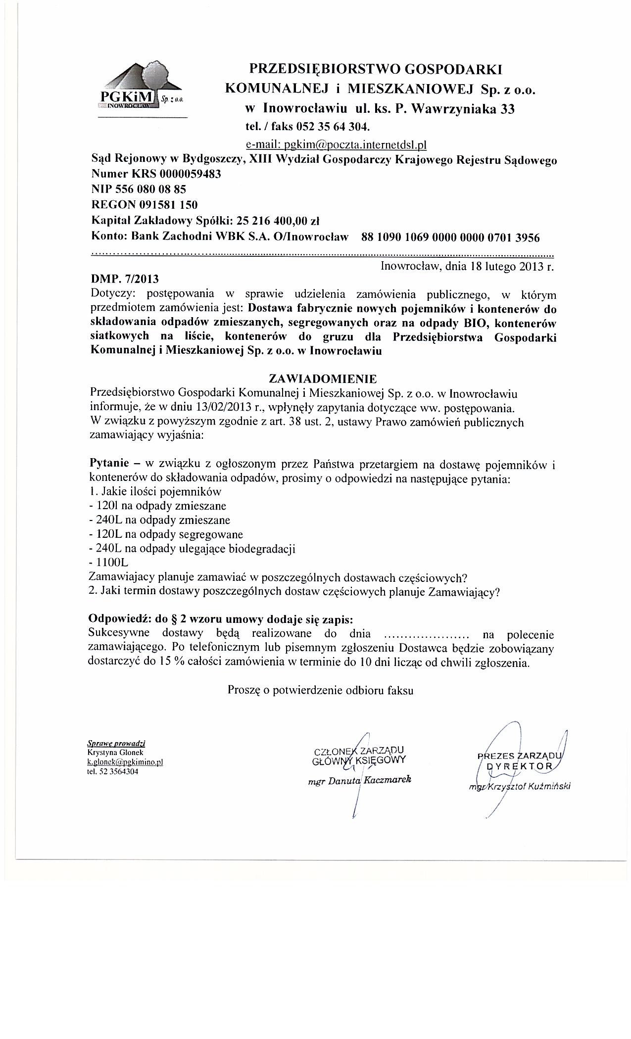 Dostawa fabrycznie nowych pojemnik贸w i kontener贸w do sk艂adowania odpad贸w zmieszanych, segregowanych oraz na odpady BIO, kontener贸w siatkowych na liscie, kontener贸w do gruzu dla Przedsi臋biorstwa Gospodarki Komunalnej i Mieszkaniowej Sp. z o.o. w Inowroc艂awiu