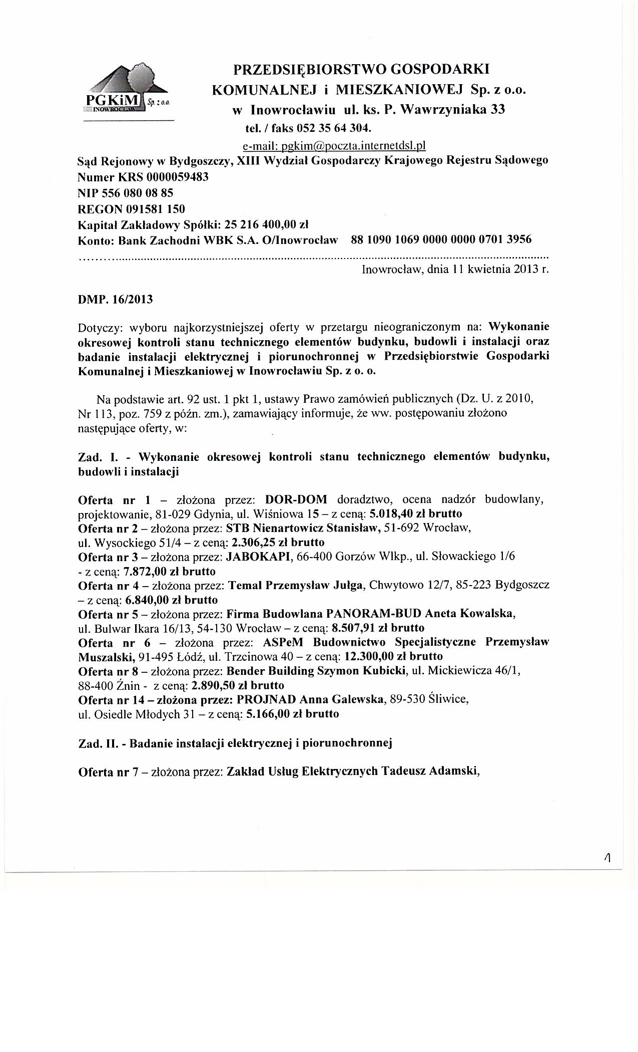 Wykonanie okresowej kontroli stanu technicznego elementów budynku, budowli i instalacji oraz badanie instalacji elektrycznej i piorunochronnej w Przedsiębiorstwie Gospodarki Komunalnej i Mieszkaniowej w Inowrocławiu Sp. z o.o.