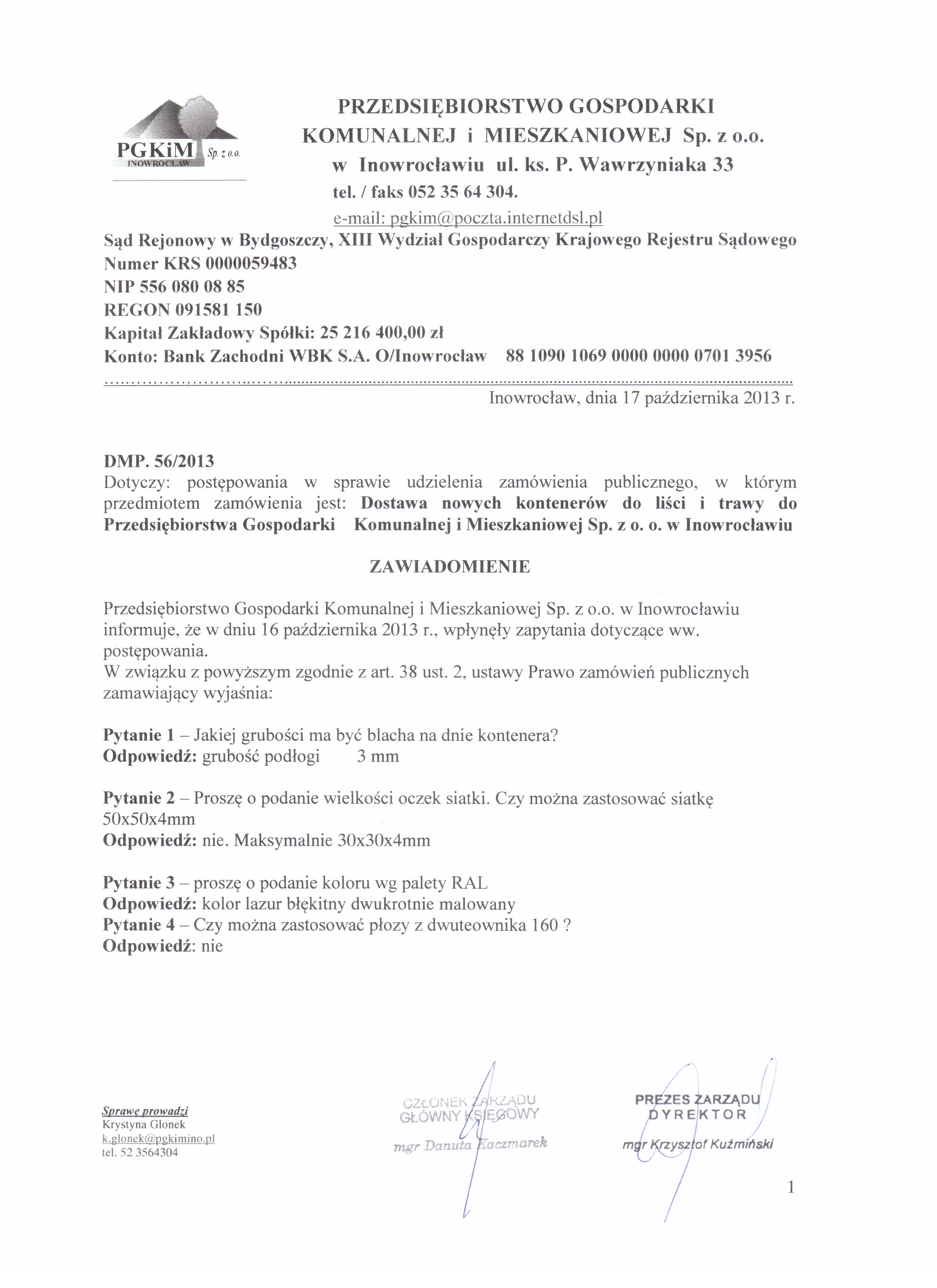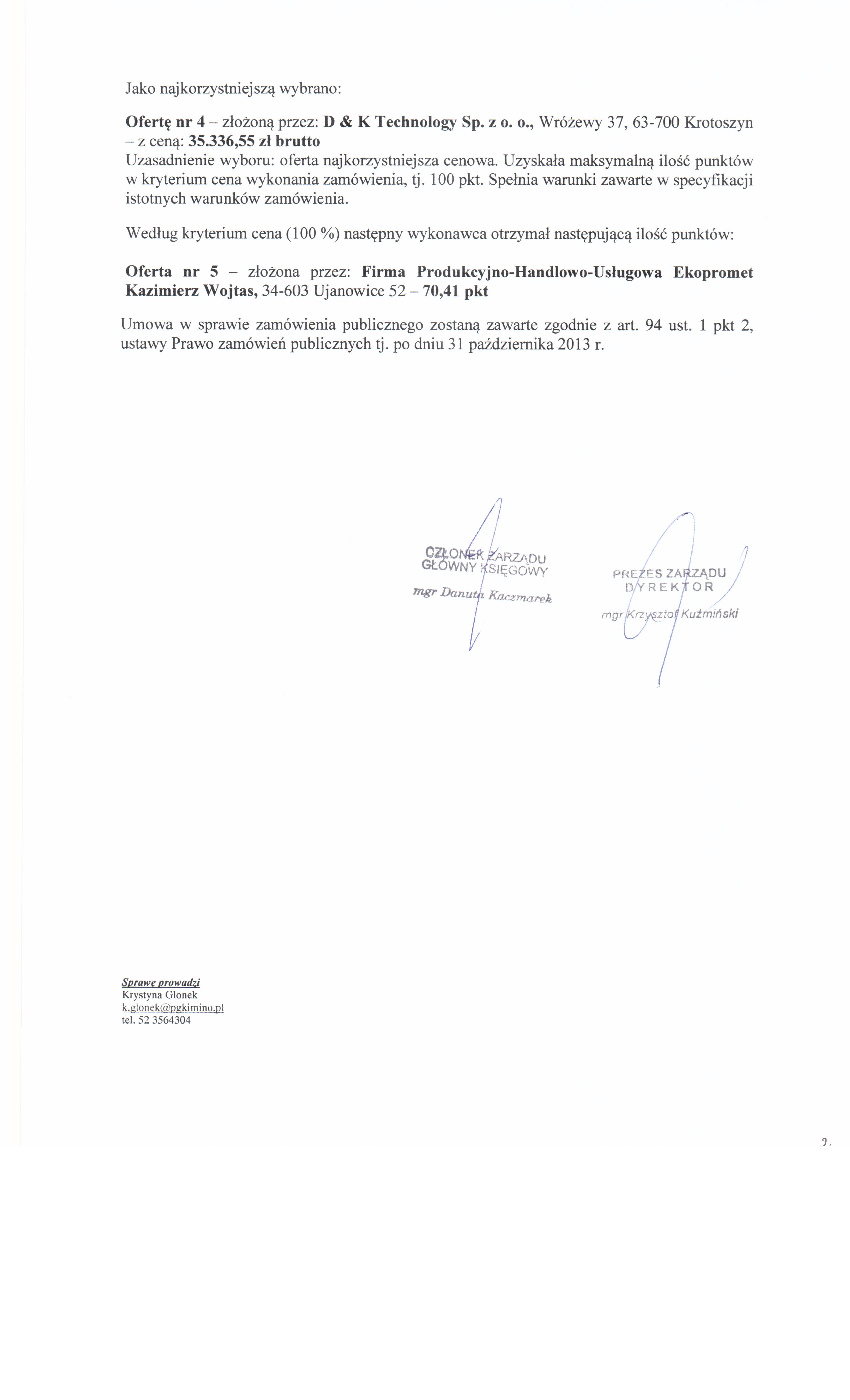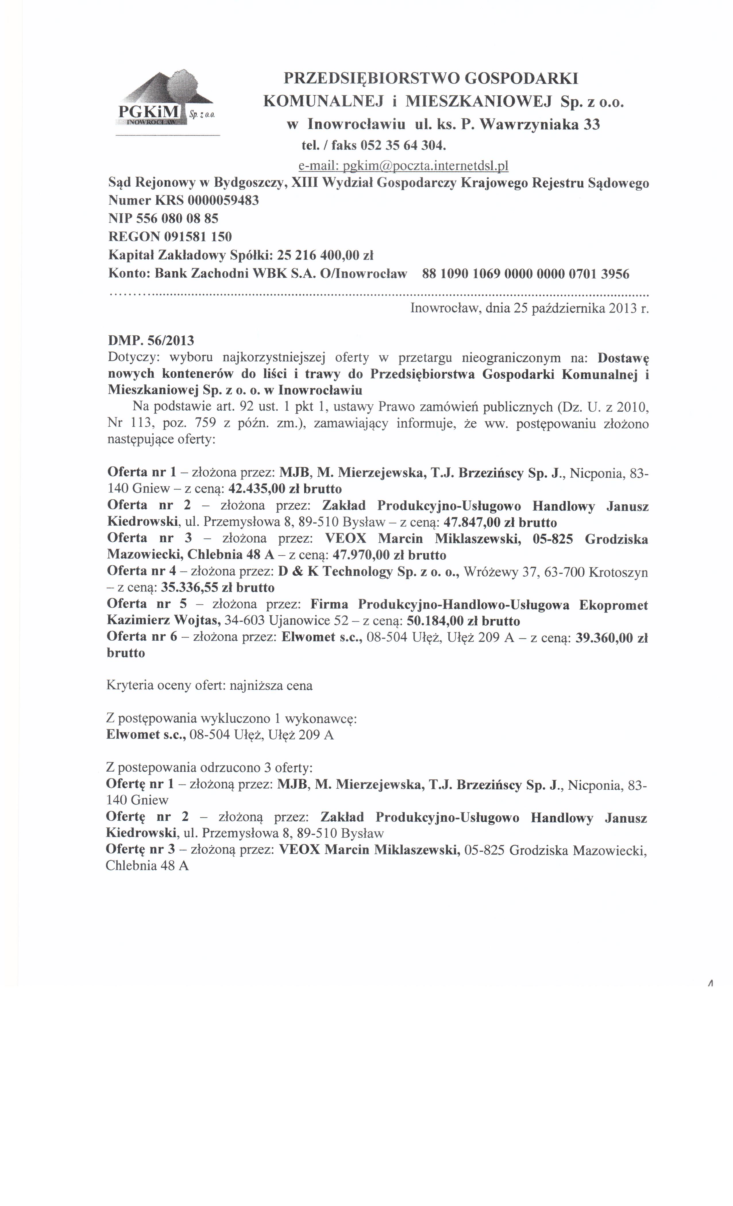 | Typ | Rozmiar | Pobierz | Komentarz | Data dodania | Licznik | ? | 19.6 KB | POBIERZ | Ogłoszenie | 2013-10-11 11:47:38 | 381 | .DOC | 258 KB | POBIERZ | Specyfikacja istotnych warunków zamówienia | 2013-10-11 11:47:50 | 467 | graf. | 523.3 KB | POBIERZ | Odpowiedzi na zapytania | 2013-10-17 10:32:54 | 383 | graf. | 678 KB | POBIERZ | Wybór wraz z informacją o wykluczeniu i odrzuceniu | 2013-10-25 12:26:22 | 370 | graf. | 357.8 KB | POBIERZ | s.2 | 2013-10-25 12:26:35 | 391 | ? | 16.8 KB | POBIERZ | Ogłoszenie o udzieleniu zamówienia BZP nr 231837-2013 | 2013-11-05 09:32:15 | 361 |