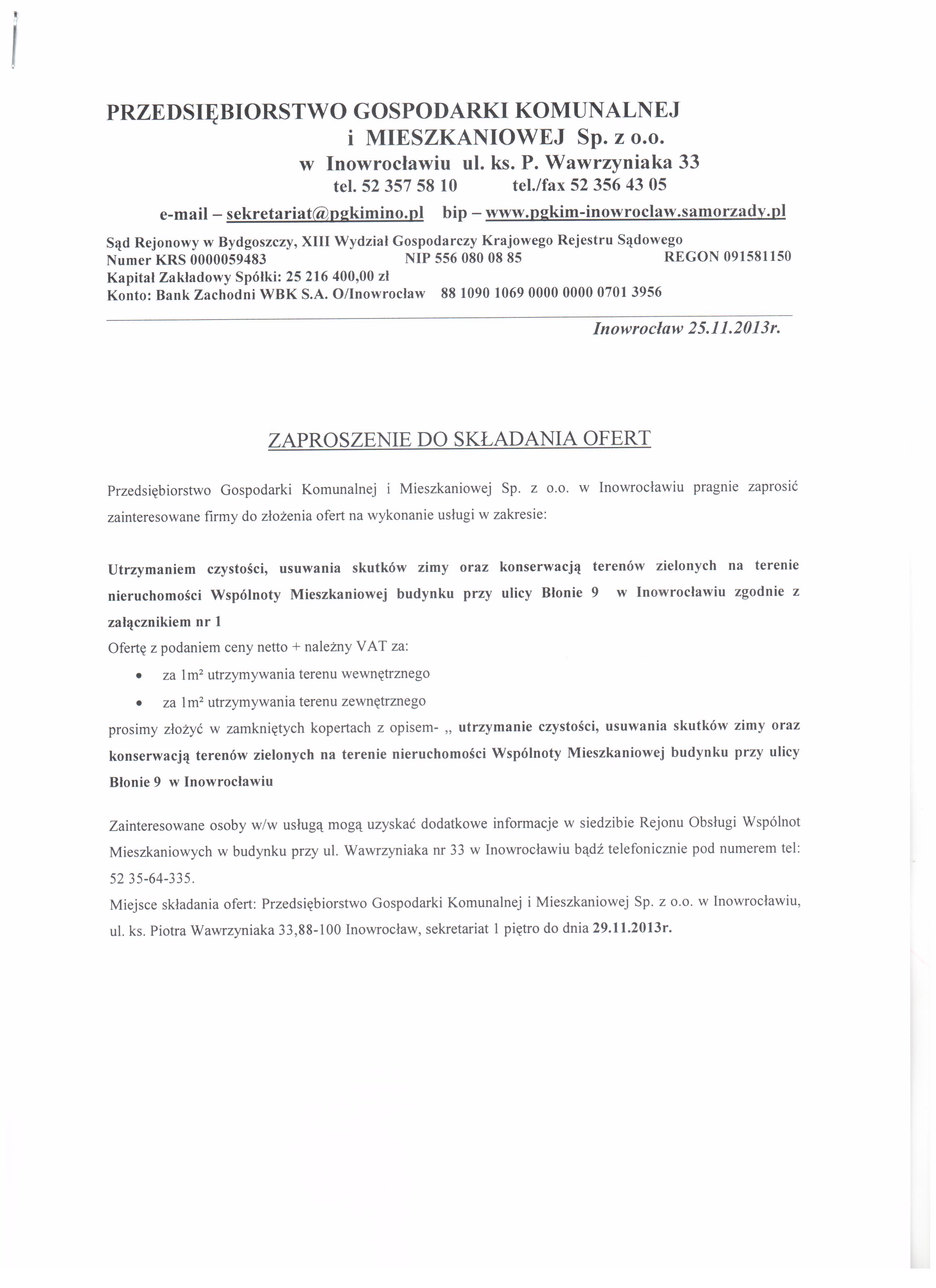 Utrzymanie czystości, usuwanię skutków zimy oraz konserwacja terenów zielonych na terenie nieruchomości Wspólnoty Mieszkaniowej Błonie 9 w Inowrocławiu