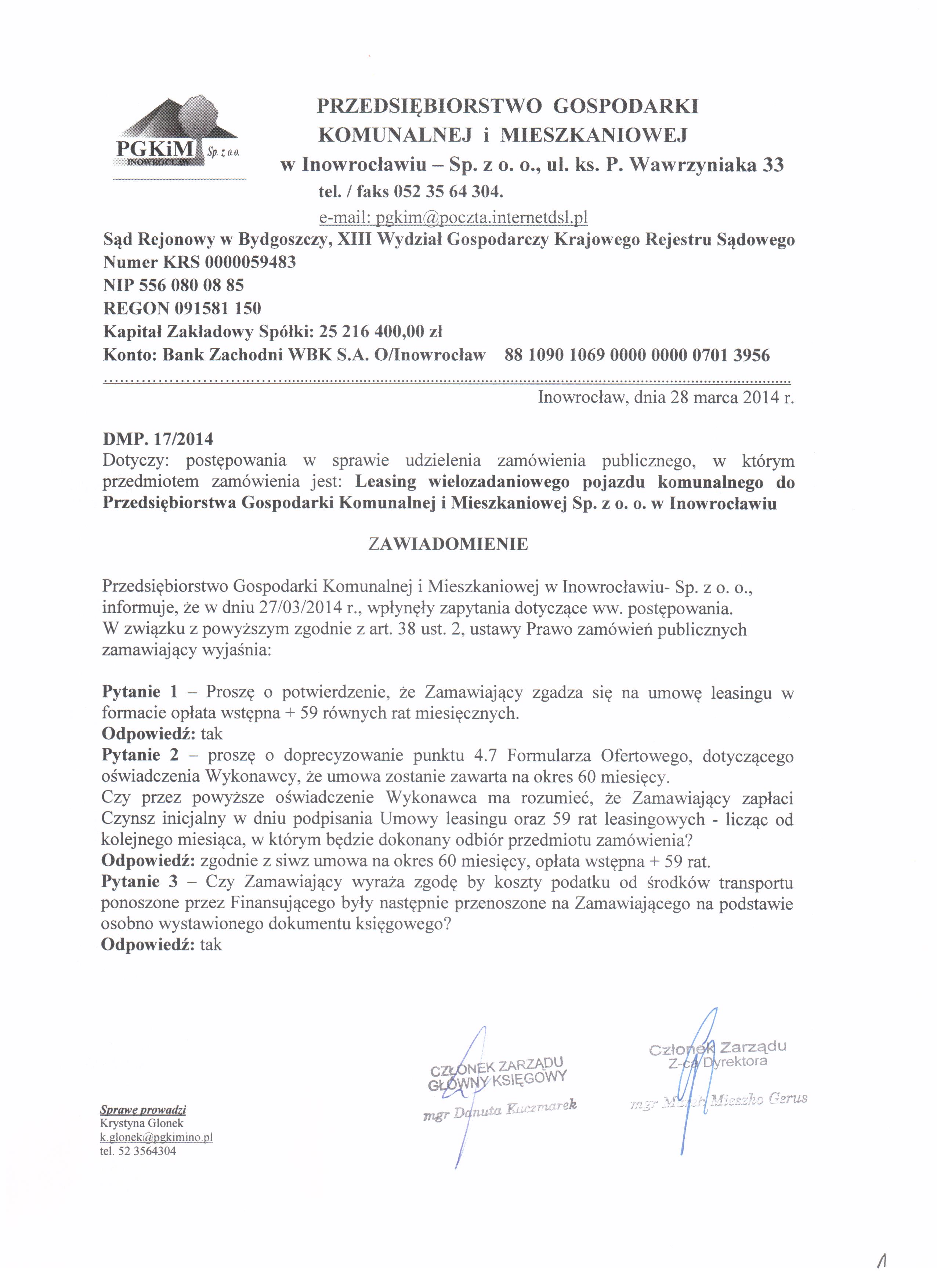 | Typ | Rozmiar | Pobierz | Komentarz | Data dodania | Licznik | ? | 20.4 KB | POBIERZ | Ogłoszenie | 2014-03-20 10:44:16 | 385 | .DOC | 250.5 KB | POBIERZ | Specyfikacja istotnych warunków zamówienia | 2014-03-20 10:44:29 | 484 | .ZIP | 5704.4 KB | POBIERZ | Zał. nr 7 do siwz - F-01 za 2013 r. | 2014-03-20 10:45:23 | 477 | ? | 20.5 KB | POBIERZ | Zał. nr 6 do siwz - OP | 2014-03-20 10:48:40 | 485 | graf. | 629.1 KB | POBIERZ | Odpowiedzi na zapytania | 2014-03-28 10:40:07 | 420 | graf. | 632.8 KB | POBIERZ | Wybór | 2014-04-04 10:55:23 | 439 | ? | 17.5 KB | POBIERZ | Ogłoszenie o udzieleniu zamówienia BZP nr 90415-2014 | 2014-04-25 12:14:18 | 371 |