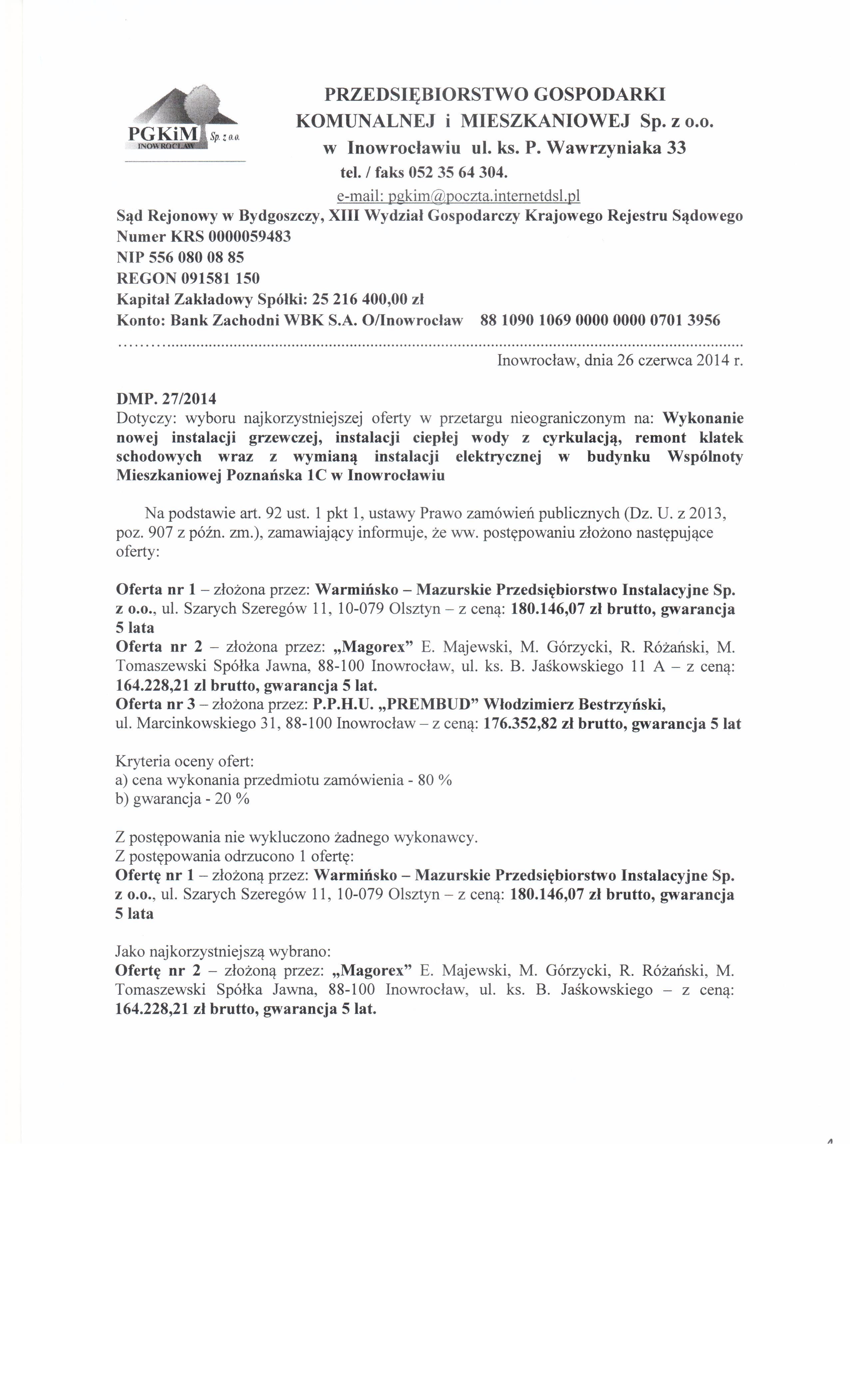 Wykonanie nowej instalacji grzewczej, instalacji cieplnej wody z cyrkulacj膮, remont klatek schodowych wraz z wymian膮 instalacji elektrycznej w budynku Wsp贸lnoty Mieszkaniowej Pozna艅ska 1C w Inowroc艂awiu