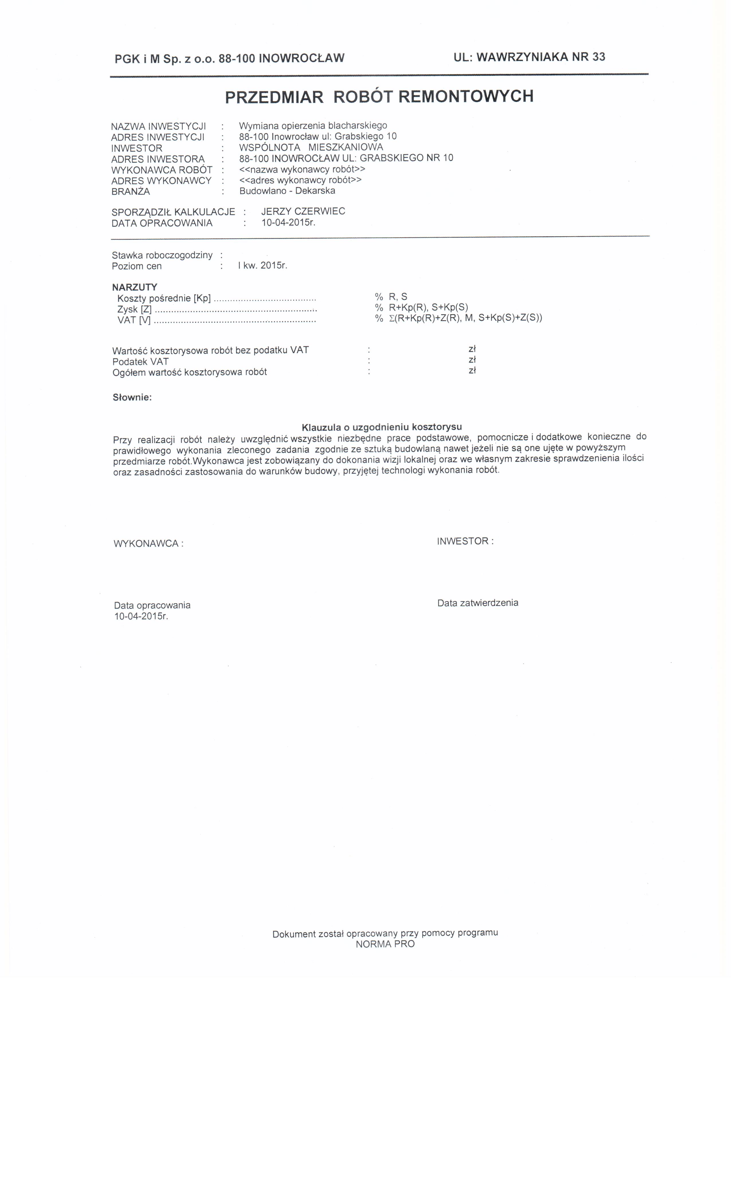 Wymiana rynien, rur spustowych oraz opierzeni blacharskich w budynku Wspólnoty Mieszkaniowej Grabskiego 10 w Inowrocławiu