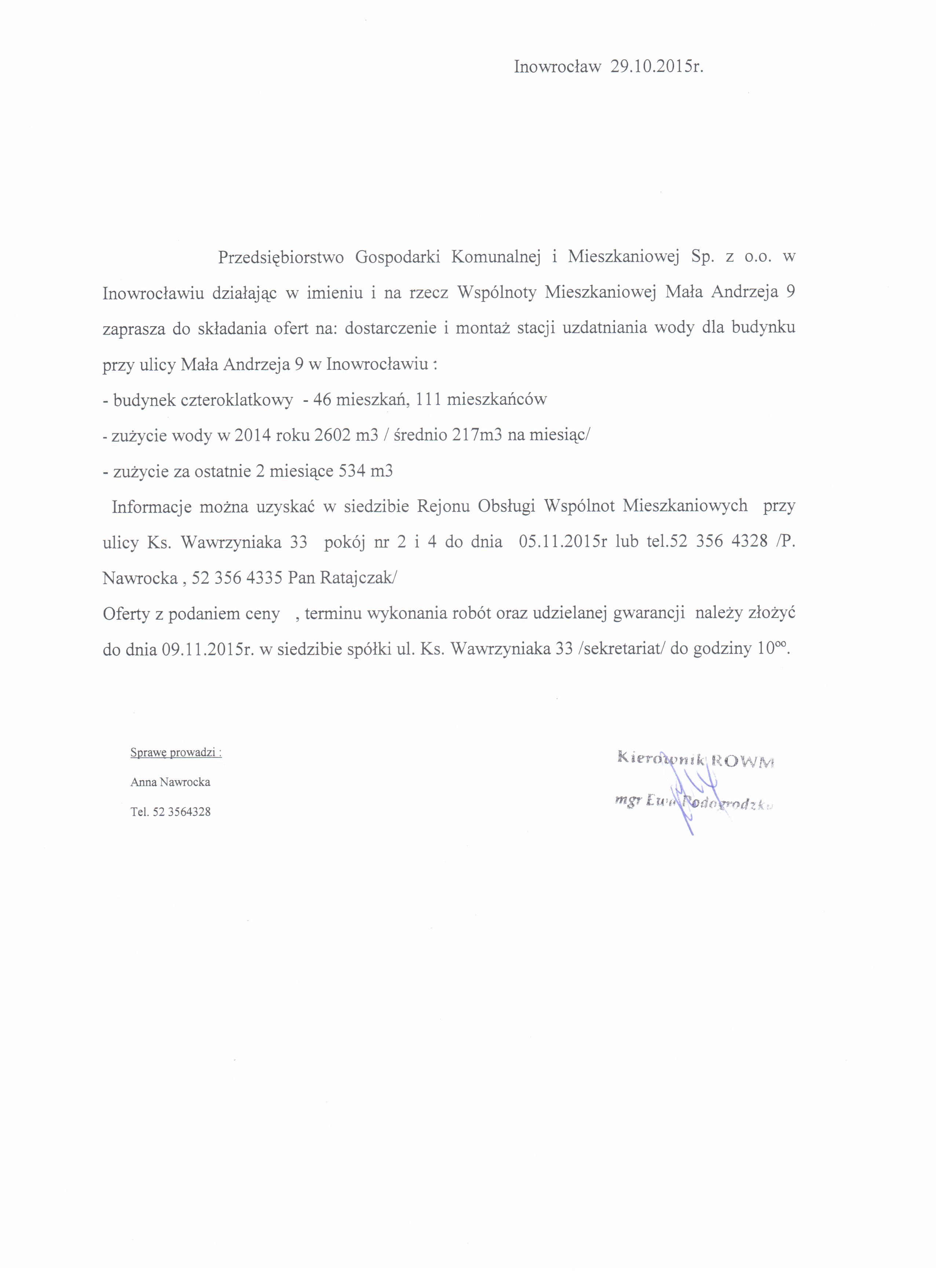 Dostarczenie i montaż stacji uzdatniania wody dla budynku Wspólnoty Mieszkaniowej M. Andrzeja 9 w Inowrocławiu