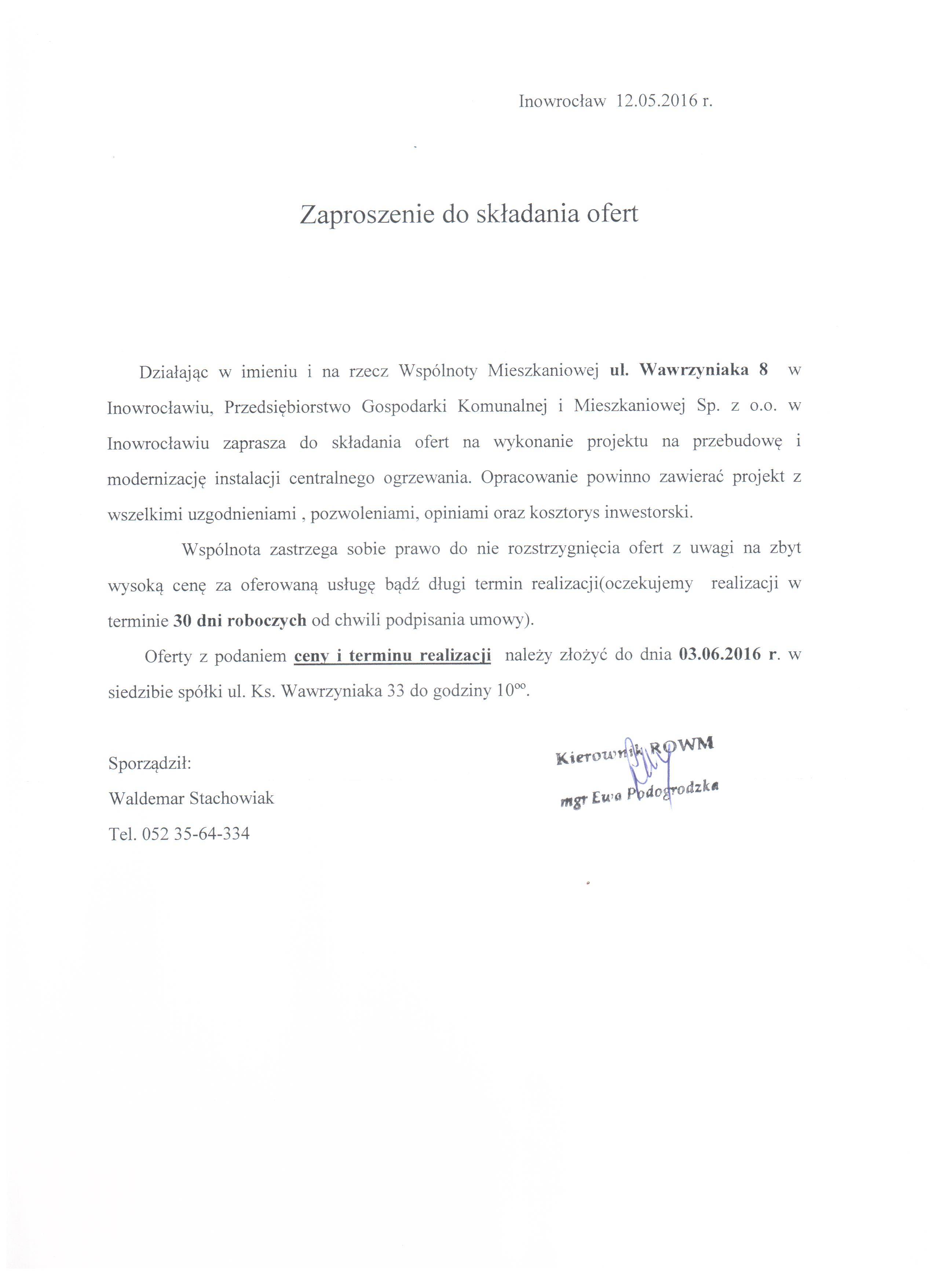 Wykonanie projektu na przebudowę i modernizację instalacji centralnego ogrzewania dla budynku Wspólnoty Mieszkaniowej Wawrzyniaka 8 w Inowrocławiu