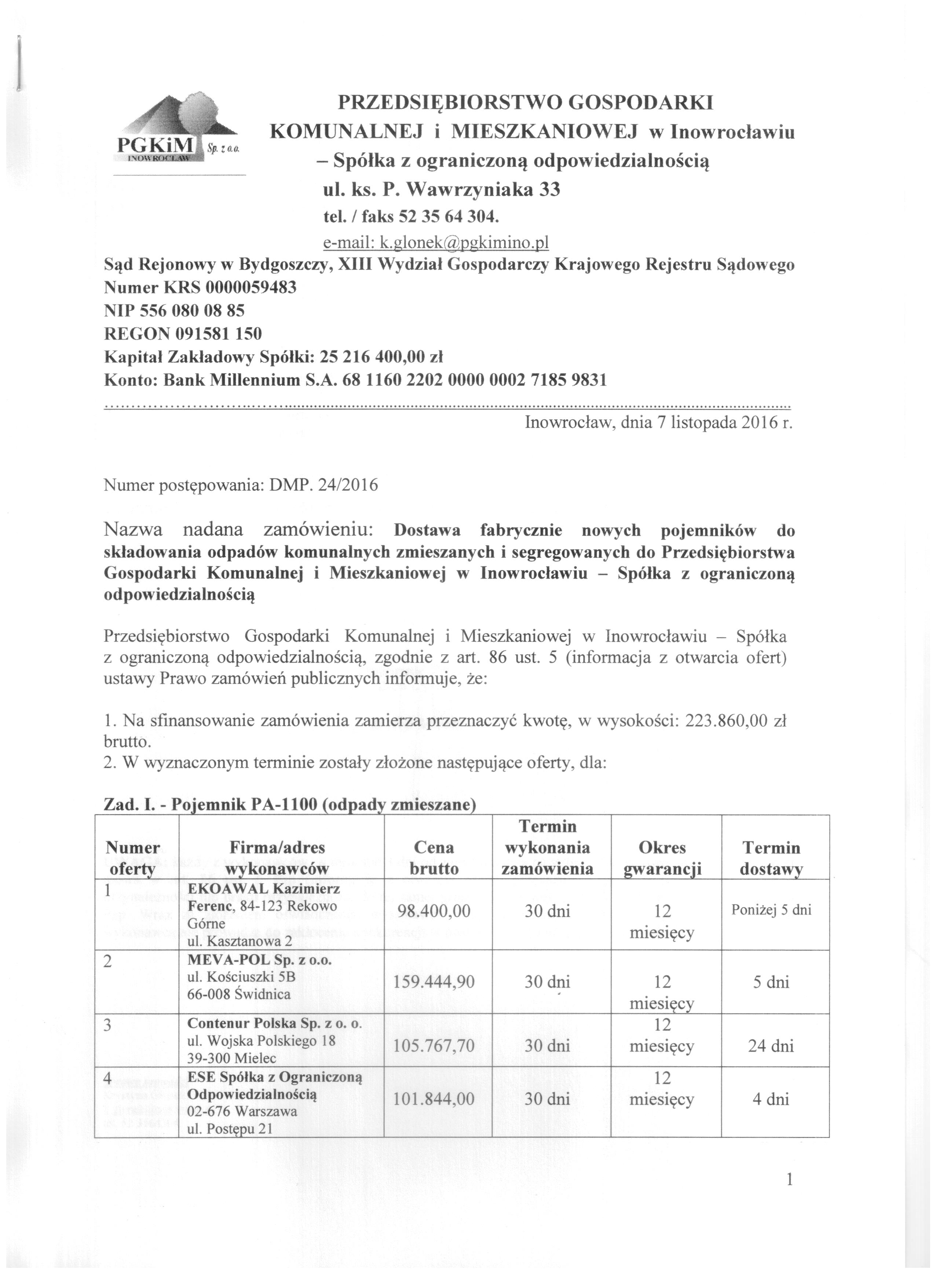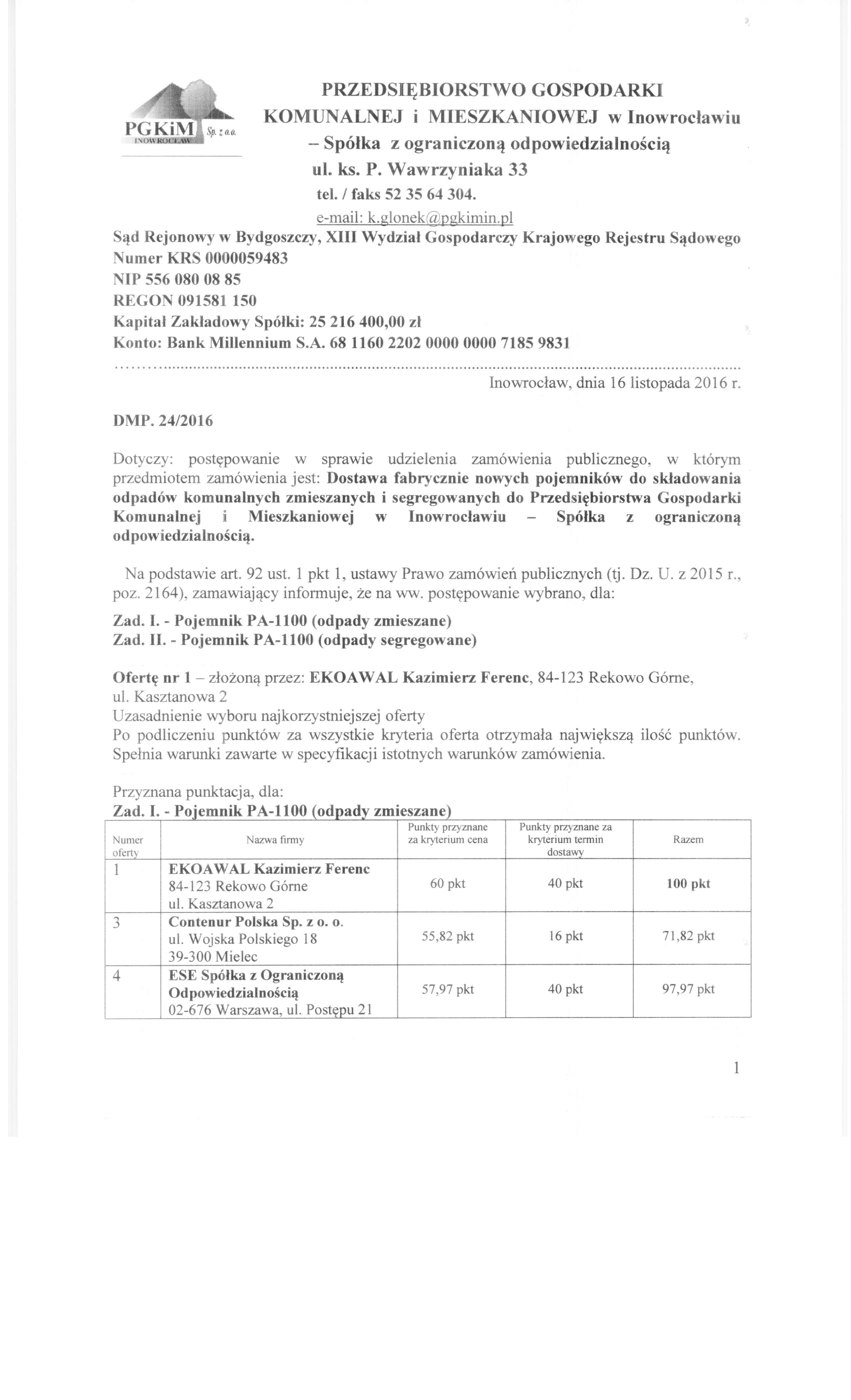 | Typ | Rozmiar | Pobierz | Komentarz | Data dodania | Licznik | ? | 26.5 KB | POBIERZ | Og艂oszenie o zam贸wieniu nr 329180-2016 | 2016-10-24 12:33:02 | 353 | ? | 145 KB | POBIERZ | Specyfikcja istotnych warunk贸w zam贸wienia | 2016-10-24 12:33:12 | 360 | graf. | 523.2 KB | POBIERZ | Odpowiedzi na zapytania | 2016-10-27 13:56:14 | 382 | graf. | 580.4 KB | POBIERZ | Informacja z otwarcia ofert | 2016-11-07 13:11:56 | 339 | graf. | 446.1 KB | POBIERZ | s.2 | 2016-11-07 13:12:10 | 350 | graf. | 569.4 KB | POBIERZ | Wyb贸r | 2016-11-16 11:10:21 | 376 | graf. | 396.8 KB | POBIERZ | s.2 | 2016-11-16 11:10:32 | 323 | ? | 14.6 KB | POBIERZ | Og艂oszenie o udzieleniu zam贸wienia BZP nr 356615 - 2016 | 2016-12-01 14:32:12 | 313 |