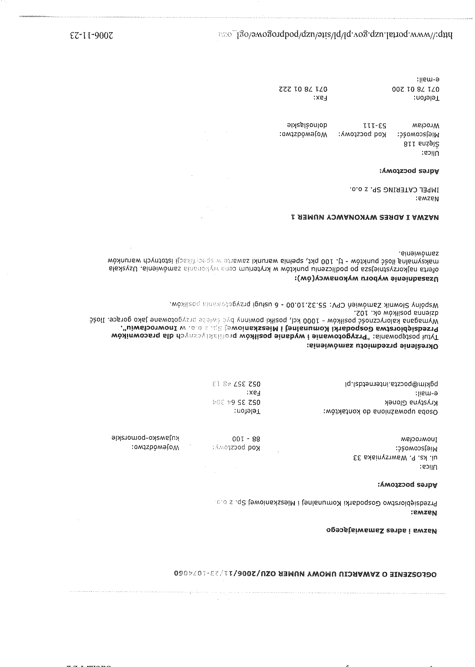 7. Osobami uprawnionymi do kontakt贸w z wykonawcami s膮: 聽聽聽 a) Lidia Owedyk, tel. 052聽355 41 01, 聽聽聽 b) Wojciech Miko艂ajczak, tel. 052聽357 90 11, 聽聽聽 c) Krystyna Glonek, tel./faks: 052 35 64聽304/ 357 48 18. 8. Termin (okres) realizacji zam贸wienia: od 2 listopada 2006 r. do 31 marca 2007 r. 9. Adres strony internetowej, na kt贸rej dost臋pna jest specyfikacja istotnych warunk贸w zam贸wienia: http://pgkim-inowroclaw.samorzady.pl 10. Op艂ata za otrzymanie specyfikacji istotnych warunk贸w zam贸wienia b臋dzie pokrywa膰 jedynie koszty jej druku oraz聽 przekazania. 11. Wykonawca zainteresowany post臋powaniem powinien z艂o偶y膰 wniosek u zamawiaj膮cego z podaniem wszystkich danych firmy -聽 niezb臋dnych do przekazywania zmian i zapyta艅聽聽dotycz膮cych powy偶szego post臋powania. 12. O udzielenie zam贸wienia mog膮 ubiega膰 si臋 wy艂膮cznie Wykonawcy, kt贸rzy: 聽 1) posiadaj膮 uprawnienia do wykonywania okre艣lonej dzia艂alno艣ci lub czynno艣ci, je偶eli聽聽ustawy nak艂adaj膮 obowi膮zek posiadania takich uprawnie艅, 聽 2) nie podlegaj膮 wykluczeniu z post臋powania o udzielenie zam贸wienia.