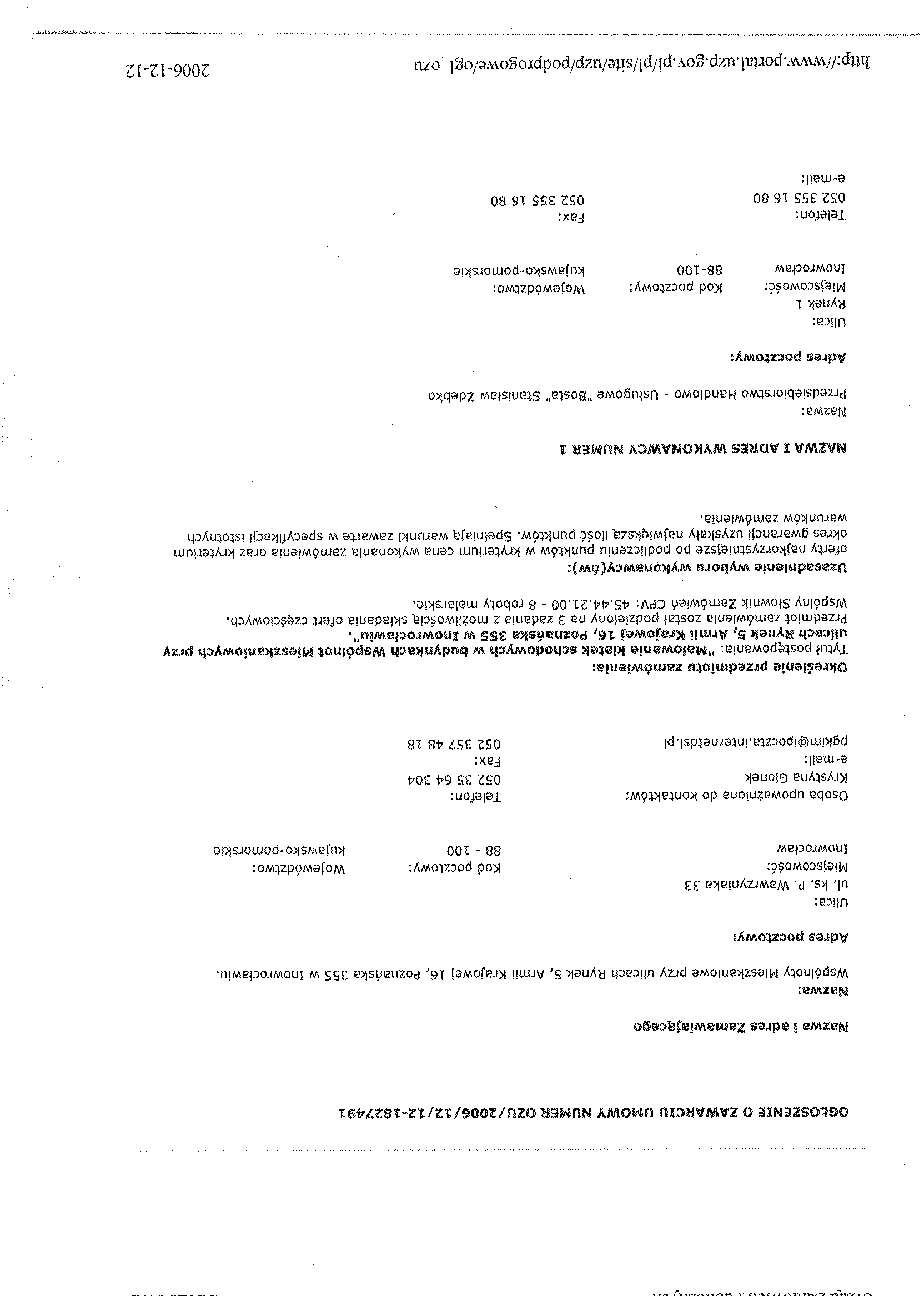 16.Miejsce i termin otwarcia ofert: Przedsi臋biorstwo Gospodarki Komunalnej i Mieszkaniowej Sp. z o.o., ul. ks. Piotra Wawrzyniaka 33, 88-100 Inowroc艂aw dnia 23 listopada 2006 r. o聽 godz. 10.00.