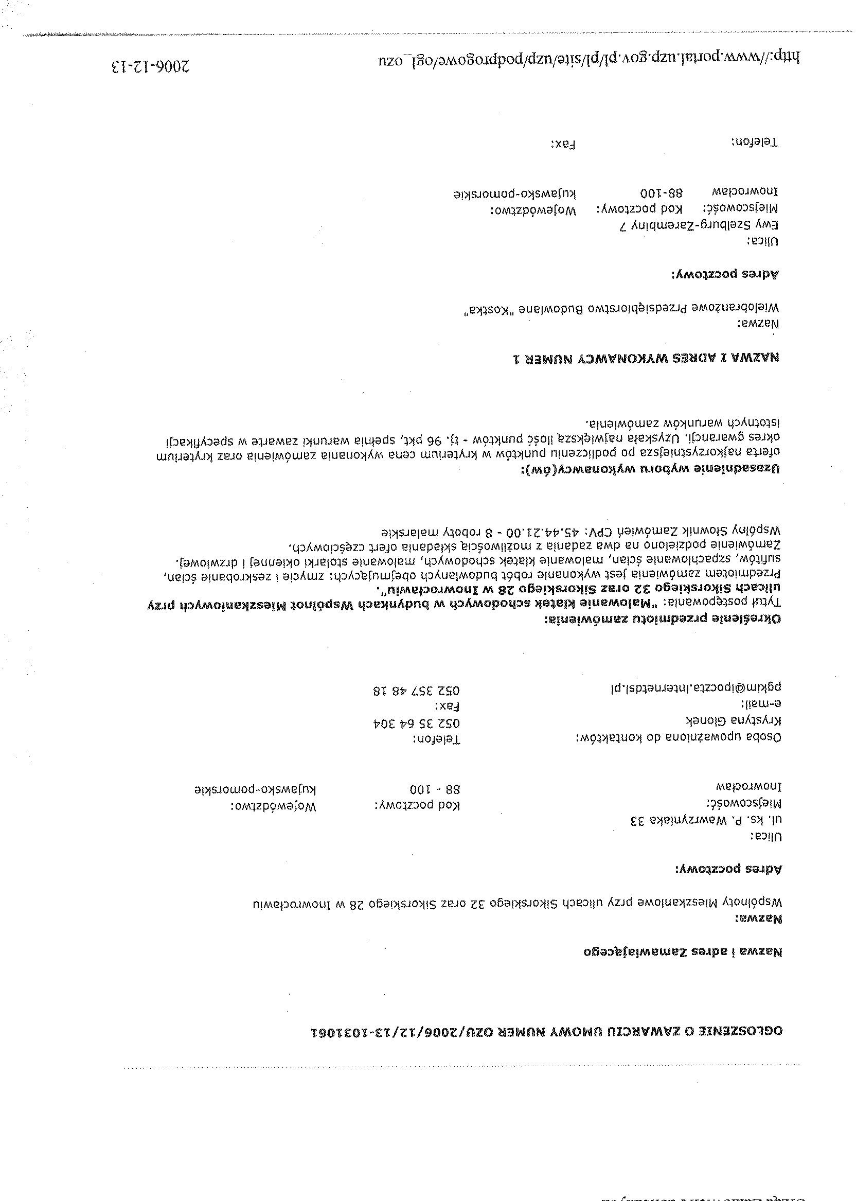 13. W celu potwierdzenia, 偶e Wykonawca posiada uprawnienie do wykonywania okre艣lonej dzia艂alno艣ci lub czynno艣ci oraz nie podlega wykluczeniu na podstawie art. 24 ustawy z dnia 29 stycznia 2004 r. - Prawo zam贸wie艅 publicznych, zamawiaj膮cy 偶膮da, nast臋puj膮cych dokument贸w: a) aktualnego odpisu z w艂a艣ciwego rejestru albo aktualnego za艣wiadczenia o wpisie do ewidencji dzia艂alno艣ci gospodarczej, je偶eli odr臋bne przepisy wymagaj膮 wpisu do rejestru lub zg艂oszenia do ewidencji dzia艂alno艣ci gospodarczej, wystawionego nie wcze艣niej ni偶 6 miesi臋cy przed up艂ywem terminu sk艂adania ofert; b) o艣wiadczenie wykonawcy, 偶e nie posiada zaleg艂o艣ci podatkowej wobec Naczelnika Urz臋du Skarbowego, c) o艣wiadczenie wykonawcy, 偶e nie posiada zaleg艂o艣ci wobec Zak艂adu Ubezpiecze艅 Spo艂ecznych w op艂acaniu sk艂adek na ubezpieczenie spo艂eczne, zdrowotne oraz Fundusz Pracy. 2) W celu potwierdzenia posiadania przez wykonawc臋 niezb臋dnej wiedzy i do艣wiadczenia oraz os贸b zdolnych do wykonania zam贸wienia, zamawiaj膮cy 偶膮da nast臋puj膮cych dokument贸w: a) wykazu wykonanych rob贸t budowlanych w okresie ostatniego 1 roku, przed dniem wszcz臋cia post臋powania o udzielenie zam贸wienia, z podaniem ich warto艣ci oraz daty i聽聽miejsca wykonania oraz za艂膮czeniem dokument贸w potwierdzaj膮cych, 偶e roboty te zosta艂y wykonane nale偶ycie, z艂. nr 2 do siwz (minimum 1 referencja), b) zamawiaj膮cy 偶膮da za艂膮czenia kserokopii uprawnie艅 budowlanych w specjalno艣ciach obj臋tych przedmiotem zam贸wienia, c) aktualnego wpisu do w艂a艣ciwych Izb Zawodowych. 3) W celu potwierdzenia, 偶e wykonawca znajduje si臋 w sytuacji ekonomicznej i finansowej zapewniaj膮cej wykonanie zam贸wienia zamawiaj膮cy 偶膮da nast臋puj膮cych dokument贸w: a) polisy, a w przypadku jej braku innego dokumentu potwierdzaj膮cego, 偶e wykonawca jest ubezpieczony od odpowiedzialno艣ci cywilnej w zakresie prowadzonej dzia艂alno艣ci. 4) Wype艂nione nast臋puj膮ce za艂膮czniki: a) formularz ofertowy wykonawcy (za艂. nr 1 do swiz). b) wykaz podobnych rob贸t (za艂. nr 2 do siwz), c) o艣wiadczenie w trybie art.22 ust.1 pkt.1-4聽 ustawy聽 Pzp (za艂. nr 3 do siwz), d) o艣wiadczenie w trybie art. 24, ustawy Pzp (za艂. nr 4 do siwz). 5) Kosztorys ofertowy, kt贸ry musi by膰 integraln膮 cz臋艣ci膮 z艂o偶onej oferty. Podstaw膮 do opracowania przez Wykonawc臋聽 kosztorysu ofertowego jest聽 przedmiar rob贸t, b臋d膮cy za艂膮cznikiem do siwz. Wykonawca mo偶e przyj膮膰 dowoln膮 form臋 i podstaw臋 wyceny rob贸t. 14. Miejsce i termin sk艂adania ofert: Oferty nale偶y z艂o偶y膰 w sekretariacie Przedsi臋biorstwa Gospodarki Komunalnej i Mieszkaniowej Sp. z o.o., ul. ks. Piotra Wawrzyniaka 33, 88-100 Inowroc艂aw,聽 do dnia 30 listopada 2006 r. do godz. 9.30. 15. Kryteria wyboru oferty聽 (w % ): 聽聽聽 聽a)聽 cena wykonania zam贸wienia聽聽聽聽聽聽聽聽聽聽聽聽聽聽 80 % 聽聽聽聽 b) gwarancja聽聽聽聽聽聽聽聽聽聽聽聽聽聽聽聽聽聽聽聽聽聽聽聽聽聽聽聽聽聽聽聽聽聽聽聽聽聽聽聽聽聽聽 20 % 16. Zamawiaj膮cy nie wymaga wadium. 16.Miejsce i termin otwarcia ofert: Przedsi臋biorstwo Gospodarki Komunalnej i Mieszkaniowej Sp. z o.o., ul. ks. Piotra Wawrzyniaka 33, 88-100 Inowroc艂aw dnia 30 listopada 2006 r. o聽 godz. 10.00 (salka konferencyjna). 聽