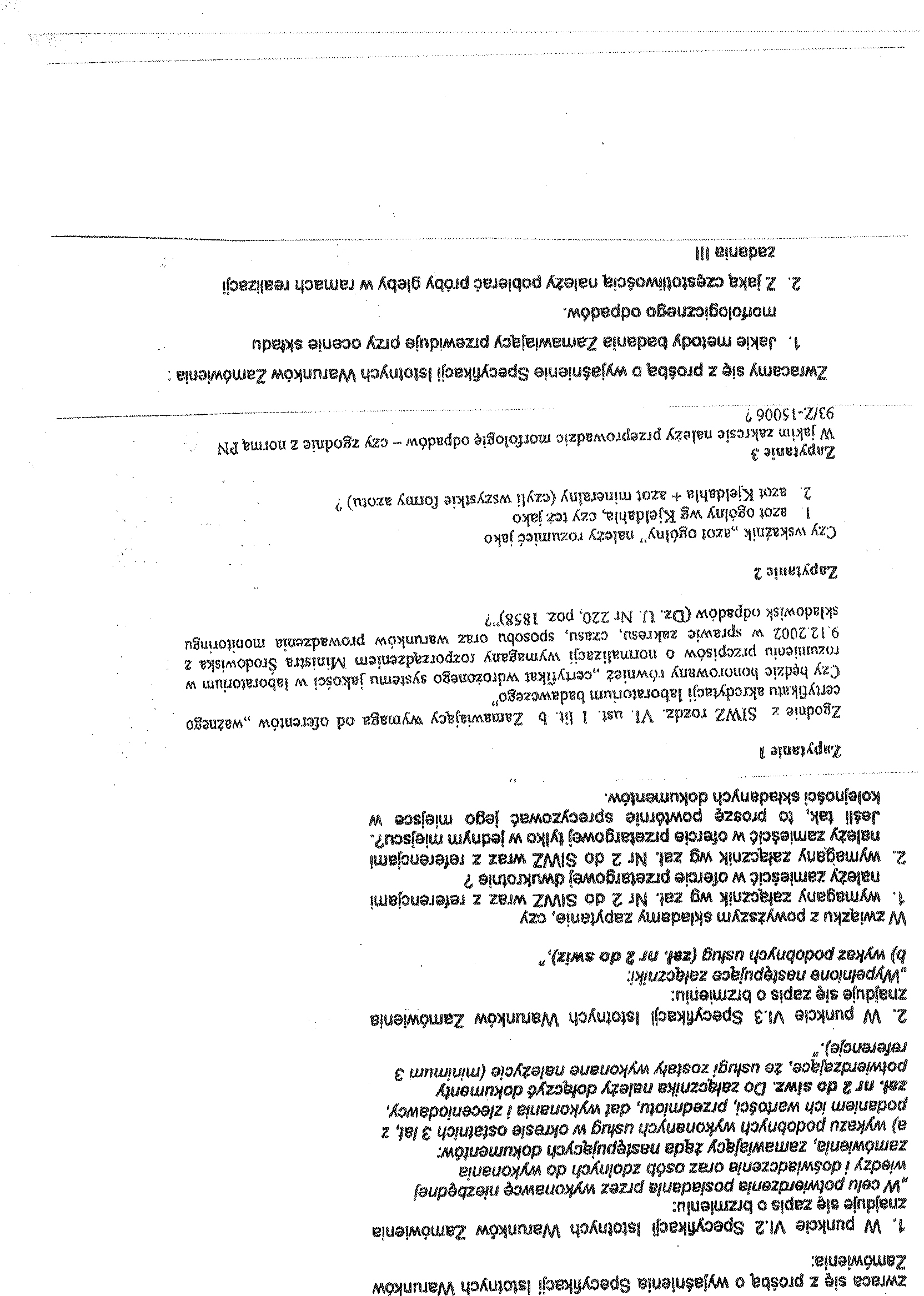 14. W celu potwierdzenia, 偶e Wykonawca posiada uprawnienie do wykonywania okre艣lonej dzia艂alno艣ci lub czynno艣ci oraz nie podlega wykluczeniu na podstawie art. 24 ustawy z dnia 29 stycznia 2004 r. – Prawo zam贸wie艅 publicznych, zamawiaj膮cy 偶膮da nast臋puj膮cych dokument贸w: a) aktualnego odpisu z w艂a艣ciwego rejestru albo aktualnego za艣wiadczenia o wpisie do 聽聽聽 ewidencji dzia艂alno艣ci gospodarczej, je偶eli odr臋bne przepisy wymagaj膮 wpisu do聽聽 聽聽聽 rejestru lub zg艂oszenia do ewidencji dzia艂alno艣ci gospodarczej, wystawionego nie 聽聽聽 wcze艣niej ni偶 6 miesi臋cy przed up艂ywem terminu sk艂adania ofert, b) wa偶ny certyfikat akredytacji laboratorium badawczego, c) o艣wiadczenia wykonawcy, 偶e nie posiada zaleg艂o艣ci podatkowej wobec Naczelnika Urz臋du Skarbowego, d) o艣wiadczenia wykonawcy, 偶e nie posiada zaleg艂o艣ci wobec Zak艂adu Ubezpiecze艅 聽聽聽 Spo艂ecznych w op艂acaniu sk艂adek na ubezpieczenie spo艂eczne, zdrowotne oraz聽聽 Fundusz Pracy. 14.1.W celu potwierdzenia posiadania przez wykonawc臋 niezb臋dnej wiedzy i do艣wiadczenia oraz os贸b zdolnych do wykonania zam贸wienia, zamawiaj膮cy 偶膮da nast臋puj膮cych dokument贸w: a) wykazu podobnych wykonanych us艂ug w okresie ostatnich 3 lat, z聽 podaniem ich warto艣ci, przedmiotu, dat wykonania i zleceniodawcy, za艂. nr 2 do siwz. Do za艂膮cznika nale偶y do艂膮czy膰 dokumenty potwierdzaj膮ce, 偶e us艂ugi zosta艂y wykonane nale偶ycie (minimum 3 referencje). 14.2.Wype艂nione nast臋puj膮ce za艂膮czniki: a) formularz ofertowy wykonawcy (za艂. nr 1 do swiz). b) wykaz podobnych us艂ug (za艂. nr 2 do swiz), c) o艣wiadczenie w trybie art. 24 ustawy Pzp (za艂. nr 3 do siwz), d) o艣wiadczenie w trybie art.22 ust.1 pkt.1-4聽 ustawy聽 Pzp (za艂. nr 4 do siwz). 聽