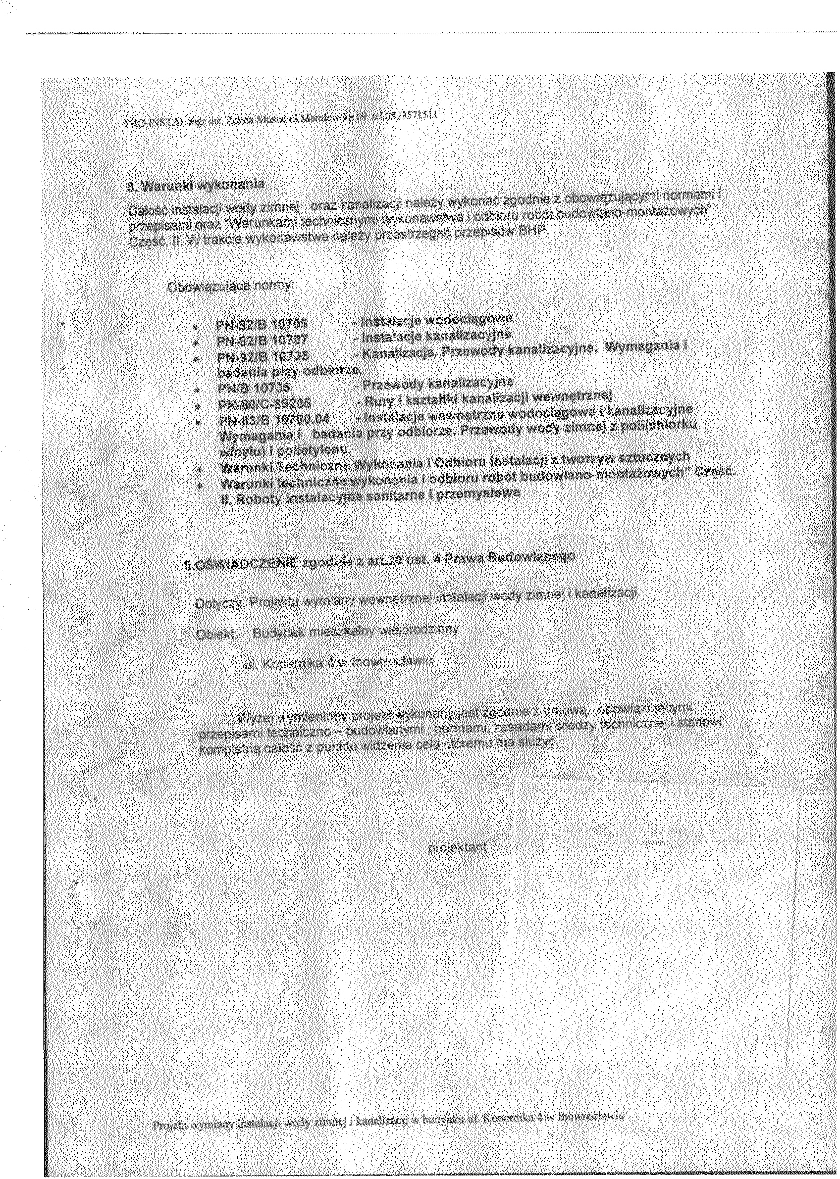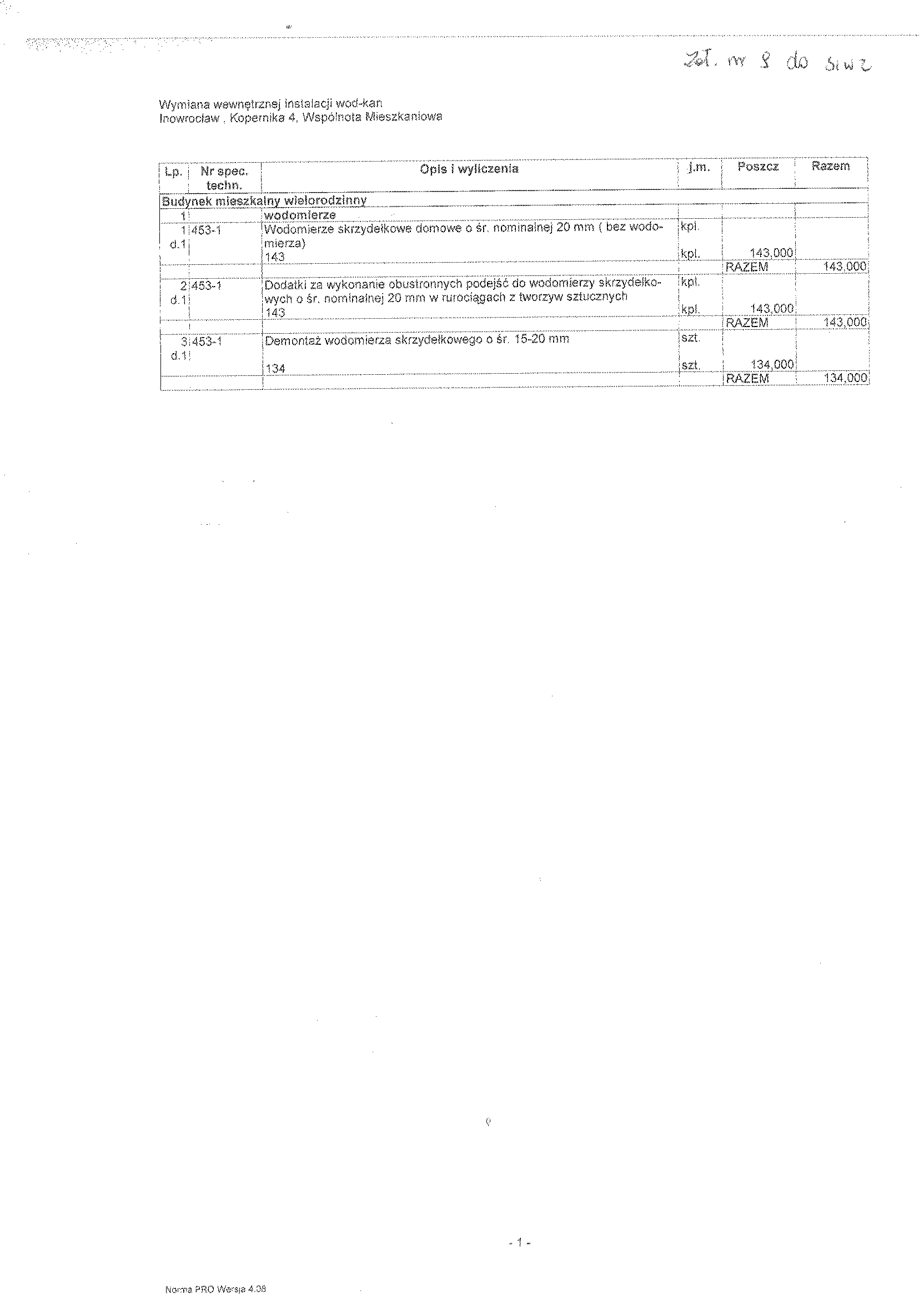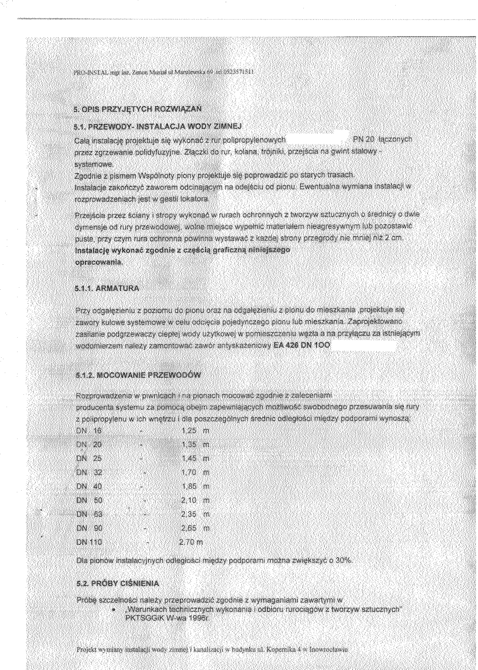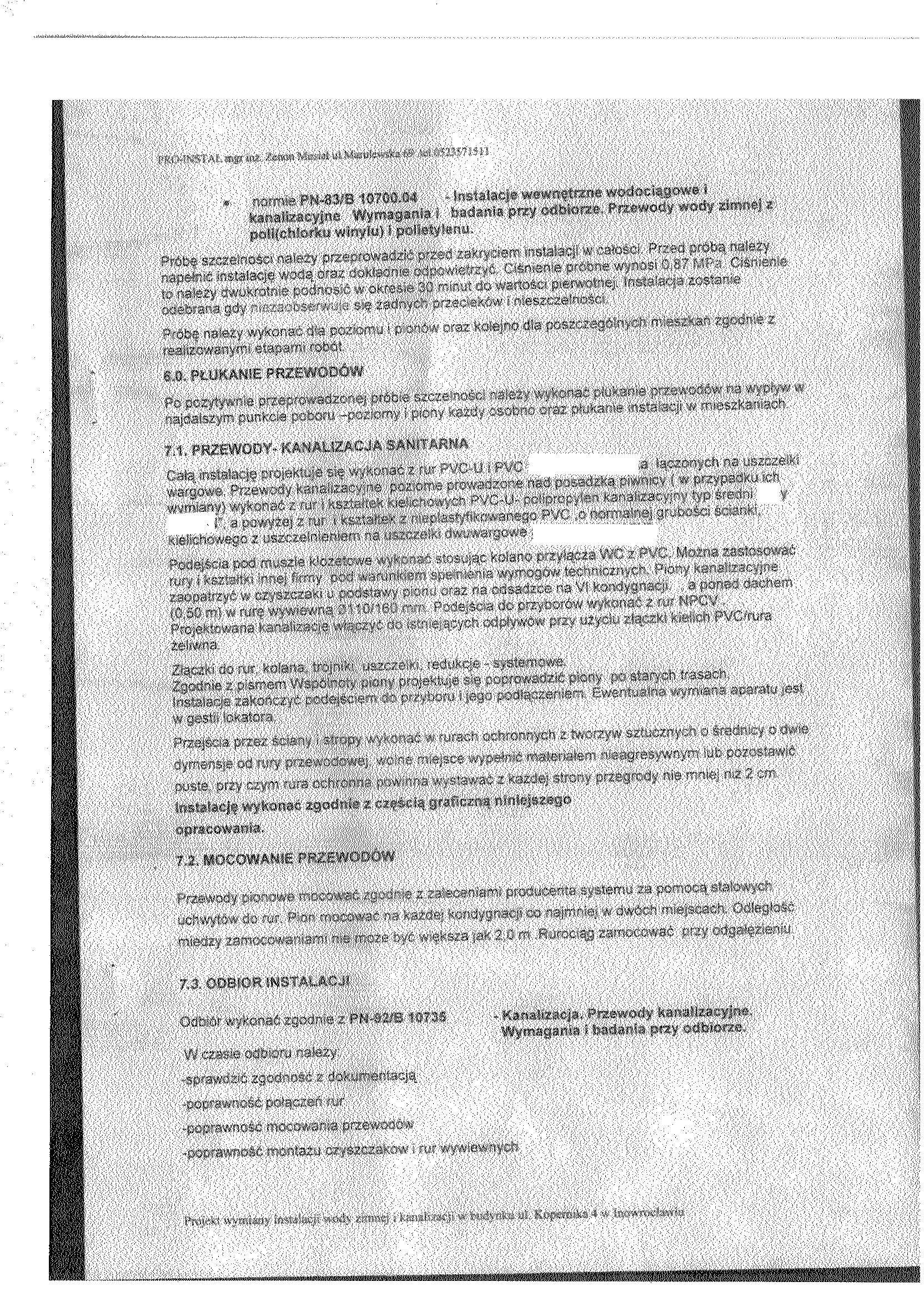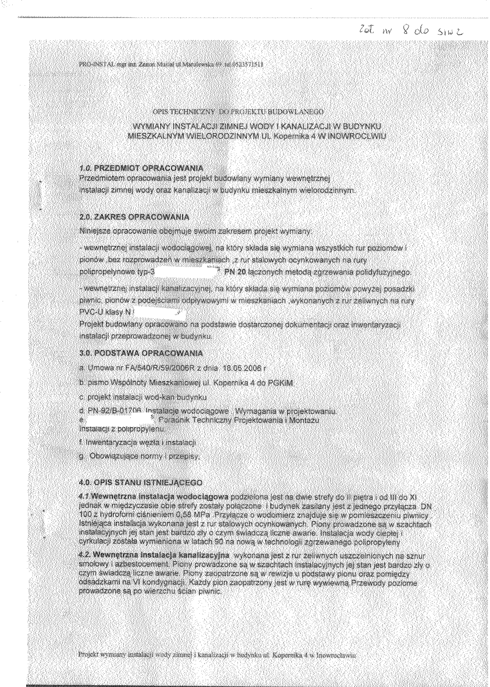 7. Opis przedmiotu zam贸wienia. Prace obejmuj膮: wymianie pion贸w instalacji wody zimnej (bez rozprowadze艅 w mieszkaniach do wodomierzy) oraz pion贸w kanalizacyjnych z podej艣ciami odp艂ywowymi (bez wymiany urz膮dze艅). 8. Warunki p艂atno艣ci. Realizacja rob贸t etapowo na podstawie harmonogramu rzeczowo- finansowego- p艂atno艣ci cz臋艣ciowe. 9. Osobami uprawnionymi do kontakt贸w z wykonawcami s膮: 聽聽聽 a) Krystyna Glonek, tel. 052 35 64聽304, 聽聽聽 b) Dorota Ma艂ek, tel. 052 35 64聽325. 10. Termin (okres) realizacji zam贸wienia: rozpocz臋cie od 19.03.2007 r. – przewidywany termin zako艅czenia do 31.10.2007 r.