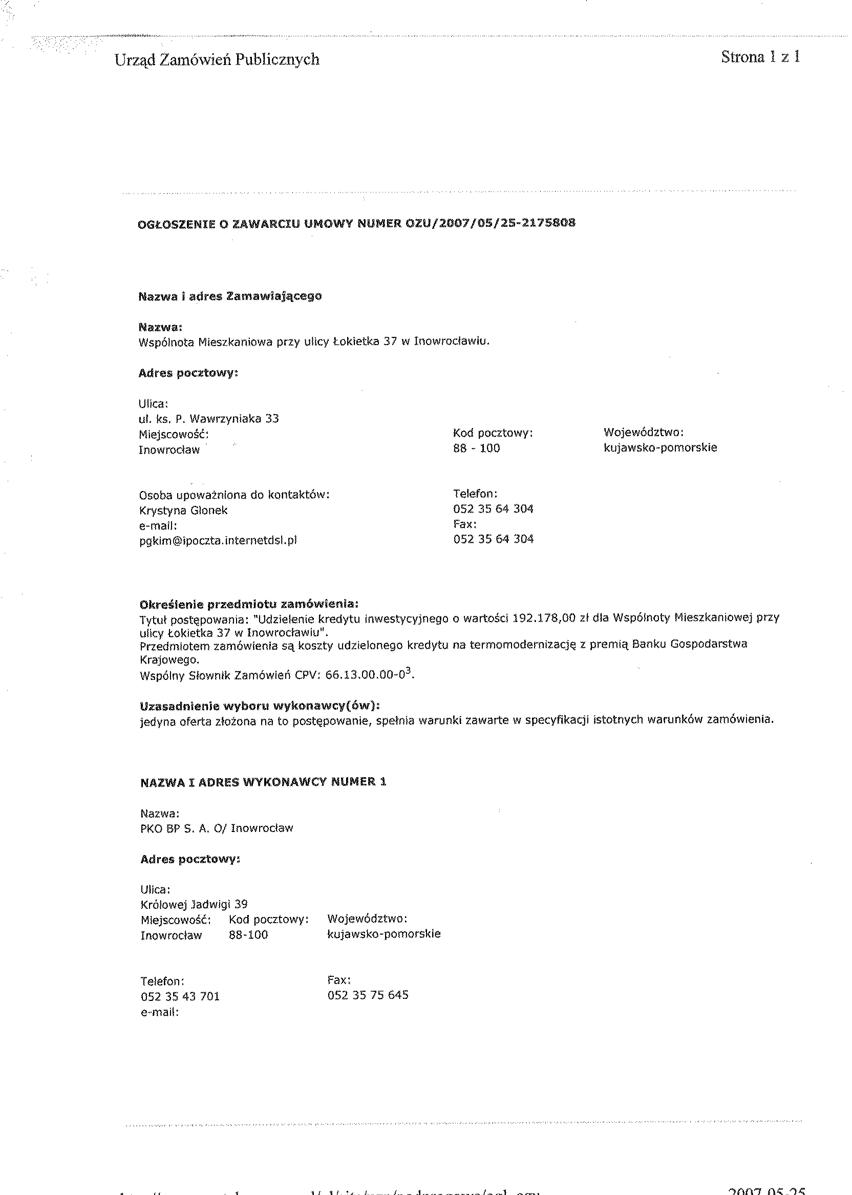 „Udzielenie kredytu inwestycyjnego o warto艣ci 192.178,00 z艂 dla Wsp贸lnoty Mieszkaniowej przy ulicy 艁okietka 37 w Inowroc艂awiu”. 聽