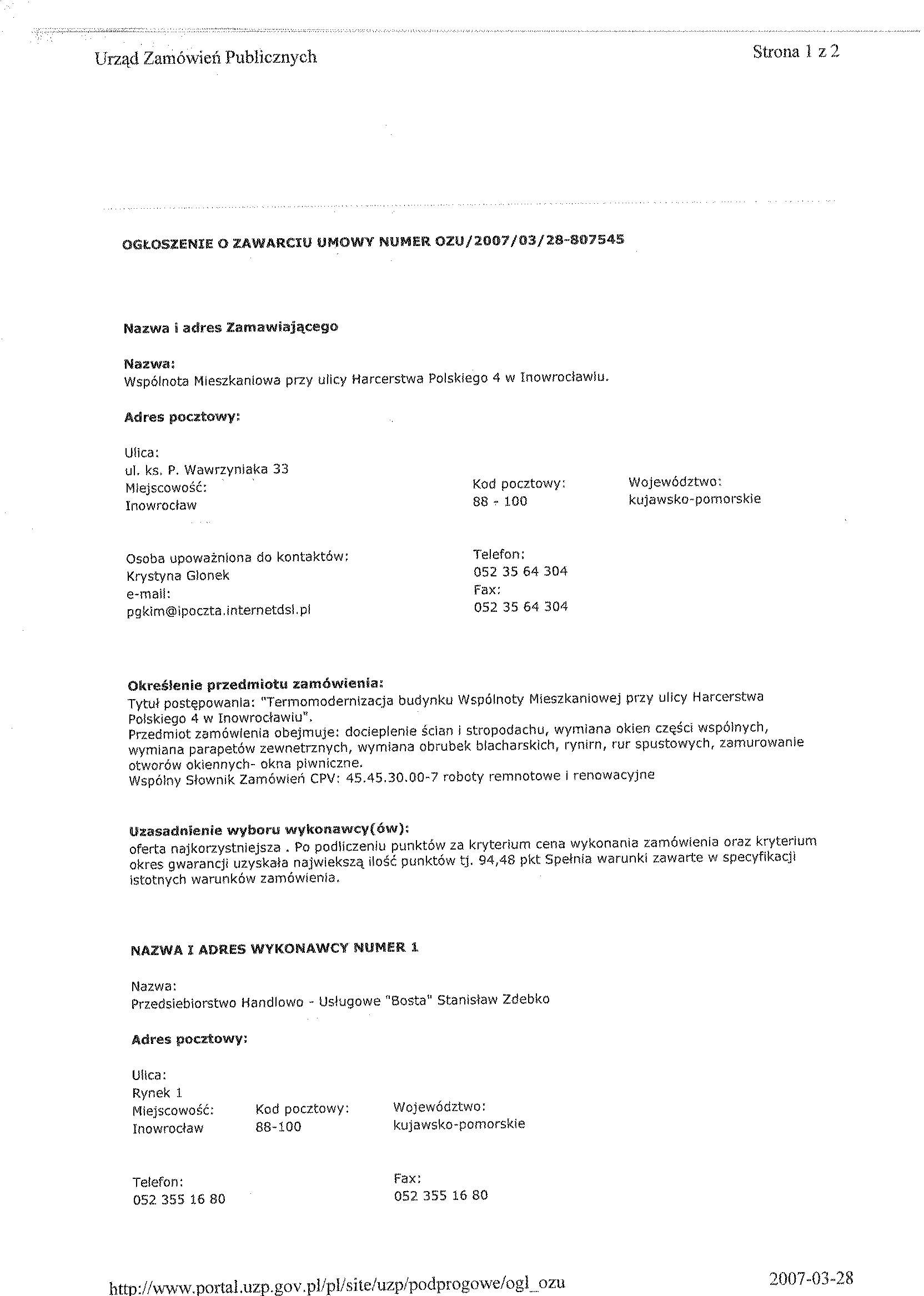 1. Zamawiaj膮cy: Wsp贸lnota Mieszkaniowa przy ulicy Harcerstwa Polskiego 4 w Inowroc艂awiu, w imieniu i na rzecz kt贸rej dzia艂a na mocy umowy o administrowanie, Przedsi臋biorstwo Gospodarki Komunalnej i Mieszkaniowej Sp. z o.o.