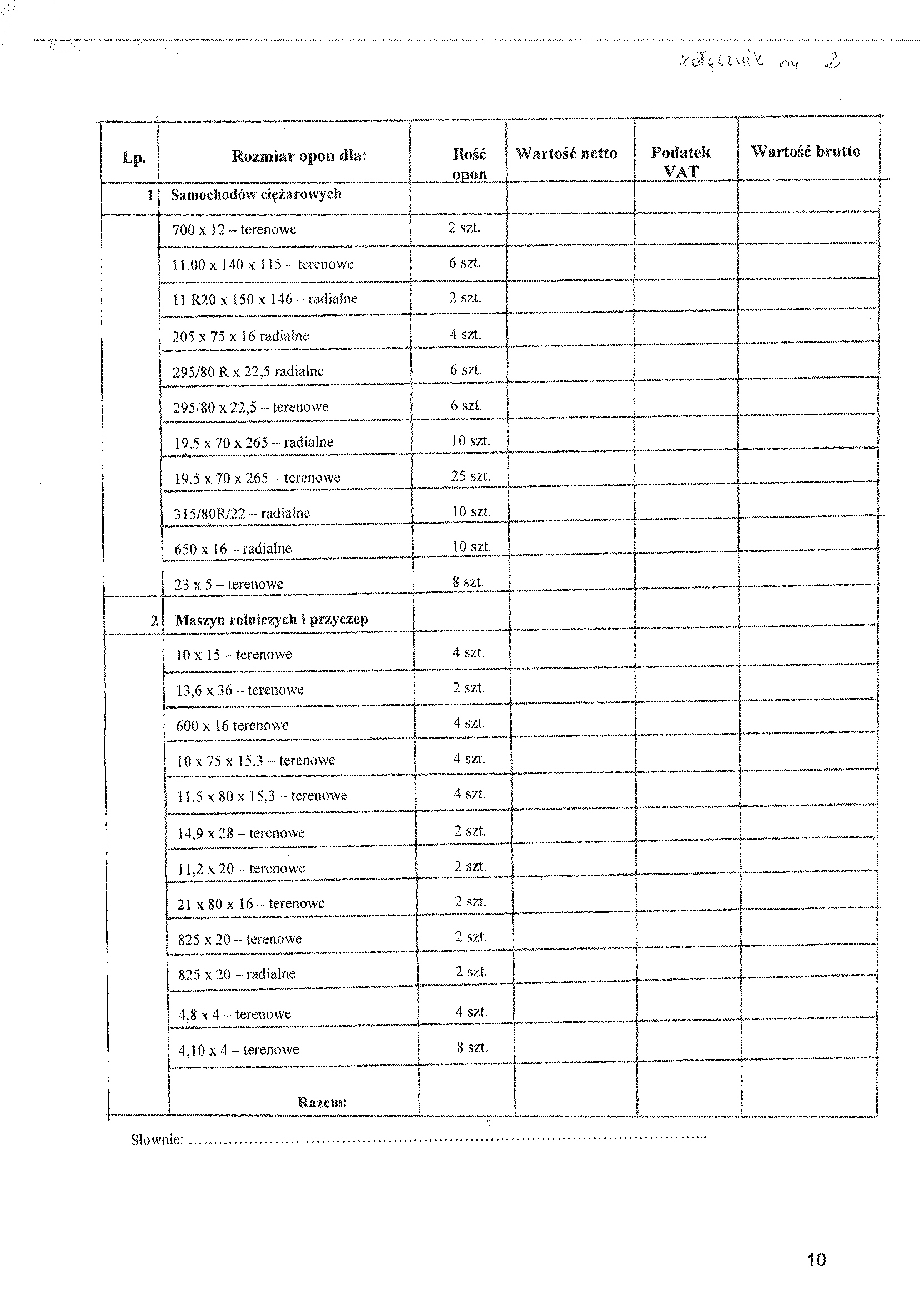 3. 聽Nomenklatura – wg Wsp贸lnego S艂ownika Zam贸wie艅 (CPV): 25.11.10.00-2,聽 25.11.13.10-8, 25.11.14.00-6.Tryb post臋powania: przetarg nieograniczony Rodzaj zam贸wienia: dostawa. 4. Przedmiotem zam贸wienia jest: sukcesywna wymiana opon w samochodach ci臋偶arowych oraz maszynach rolniczych i przyczepach, zgodnie z zam贸wieniem - w ci膮gu 7 dni od momentu zg艂oszenia. 5. Zakres zam贸wienia: 5.1. opony do samochod贸w ci臋偶arowych: a) 700 x 12 – terenowe – 2 szt. b) 11.00 x 140 x 115 – terenowe – 6 szt. c) 11 R20 x 150 x 146 – radialne – 2 szt. d) 205 x 75 x 16 radialne – 4 szt. e) 295/80 R x 22,5 – radialne – 6 szt. f) 295/80 x 22,5 – terenowe – 6 szt. g) 19.5 x 70 x 265 – radialne – 10 szt. h) 19.5 x 70 x 265 – terenowe – 25 szt. i) 315/80R/22 – radialne – 10 szt. j) 650 x 16 – radialne – 10 szt. k) 23 x 5 – terenowe – 8 szt. 5.2. opony do maszyn rolniczych oraz przyczep: a) 10 x 15 – terenowe – 4 szt. b) 13,6 x 36 – terenowe – 2 szt. c) 600 x 16 terenowe – 4 szt. d) 10 x 75 x 15,3 – terenowe – 4 szt. e) 11.5 x 80 x 15,3 – terenowe – 4 szt. f) 14,9 x 28 – terenowe – 2 szt. g) 11,2 x 20 – terenowe – 2 szt. h) 21 x 80 x 16 – terenowe – 2 szt. i) 825 x 20 – terenowe – 2 szt. j) 825 x 20 – radialne – 2 szt. k) 4,8 x 4 – terenowe – 4 szt. l) 4,10 x 4 – terenowe – 8 szt. 6. Wymagane warunki techniczne: a) okres gwarancji 24 miesi膮ce od daty zakupu i do g艂臋boko艣ci 1,6 mm mierzonej na punkcie pomiarowym TWI, b) w okresie gwarancji wszystkie reklamowane opony - w kt贸rych zostanie stwierdzona wada produkcyjna – b臋d膮 wymienione na nowe, wolne od wad, c) wykonawca b臋dzie zobowi膮zany do posiadania wymaganych opony w ci膮gu 7 dni od momentu zg艂oszenia, d) wykonawca zobowi膮zuje si臋 do odbioru zu偶ytego ogumienia w celu utylizacji oraz do podpisania karty przekazania odpadu, e) wykonawca zobowi膮偶e si臋 do wymiany opon na swoim terenie oraz wyznaczy swego pracownika. f) wymagana odleg艂o艣膰 do punktu wymiany opon –聽 miasto Inowroc艂aw. 聽