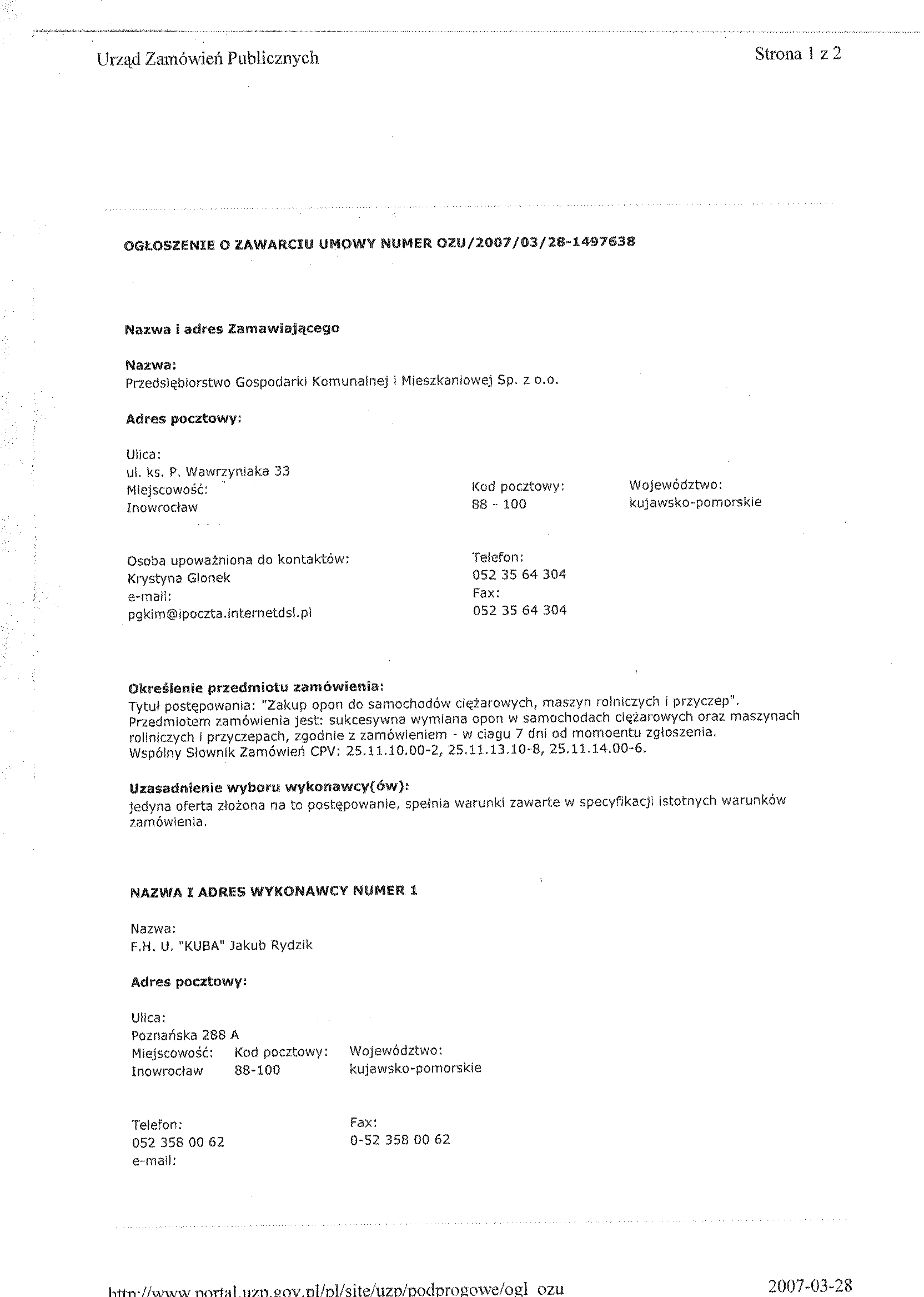 15. W celu potwierdzenia, 偶e Wykonawca posiada uprawnienie do wykonywania okre艣lonej dzia艂alno艣ci lub czynno艣ci oraz nie podlega wykluczeniu na podstawie art. 24 ustawy z dnia 29 stycznia 2004 r. – Prawo zam贸wie艅 publicznych, zamawiaj膮cy 偶膮da nast臋puj膮cych dokument贸w: a) aktualnego odpisu z w艂a艣ciwego rejestru albo aktualnego za艣wiadczenia o wpisie do ewidencji dzia艂alno艣ci gospodarczej, je偶eli odr臋bne przepisy wymagaj膮 wpisu do聽聽rejestru lub zg艂oszenia do ewidencji dzia艂alno艣ci gospodarczej, wystawionego nie wcze艣niej ni偶 6 miesi臋cy przed up艂ywem terminu sk艂adania ofert, b) o艣wiadczenia wykonawcy, 偶e nie posiada zaleg艂o艣ci podatkowej wobec Naczelnika Urz臋du Skarbowego, c) o艣wiadczenia wykonawcy, 偶e nie posiada zaleg艂o艣ci wobec Zak艂adu Ubezpiecze艅 Spo艂ecznych w op艂acaniu sk艂adek na ubezpieczenie spo艂eczne, zdrowotne oraz Fundusz Pracy. 15.1.Wype艂nione nast臋puj膮ce za艂膮czniki: a) formularz ofertowy wykonawcy (za艂. nr 1 do swiz). b) formularz cenowy (za艂. nr 2 do siwz), c) o艣wiadczenie w trybie art. 22 ustawy Pzp (za艂. nr 3 do siwz), d) o艣wiadczenie w trybie art.24 ust.1 pkt.1-4聽 ustawy聽 Pzp (za艂. nr 4 do siwz). 聽 16. Miejsce i termin sk艂adania ofert: sekretariat Przedsi臋biorstwa Gospodarki Komunalnej i Mieszkaniowej Sp. z o.o., ul. ks. Piotra Wawrzyniaka 33, 88-100 Inowroc艂aw, do dnia 12 marca 2007 r. do godz. 9.30.