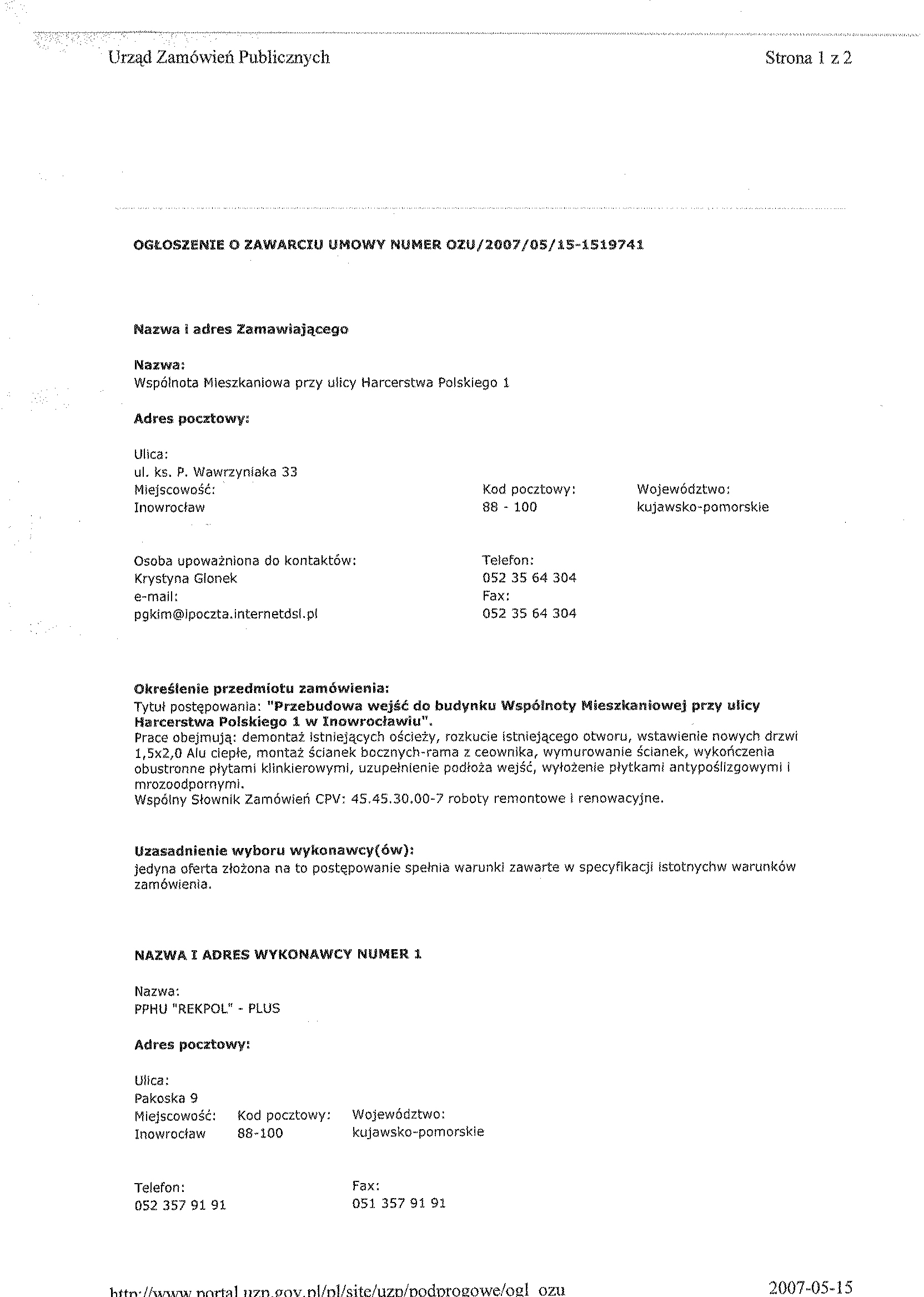 1. Zamawiaj膮cy: Wsp贸lnota Mieszkaniowa przy ulicy Harcerstwa Polskiego 1 w Inowroc艂awiu, w imieniu i na rzecz kt贸rej dzia艂a na mocy umowy o administrowanie, Przedsi臋biorstwo Gospodarki Komunalnej i Mieszkaniowej Sp. z o.o. w Inowroc艂awiu 聽 Ulica: ks. Piotra Wawrzyniaka 33 Kod: 88-100, Miejscowo艣膰: Inowroc艂aw Telefon / faks 052 35 64聽304 e-mail: pgkim@poczta.internetdsl.pl聽 http://pgkim-inowroclaw.samorzady.pl 聽
