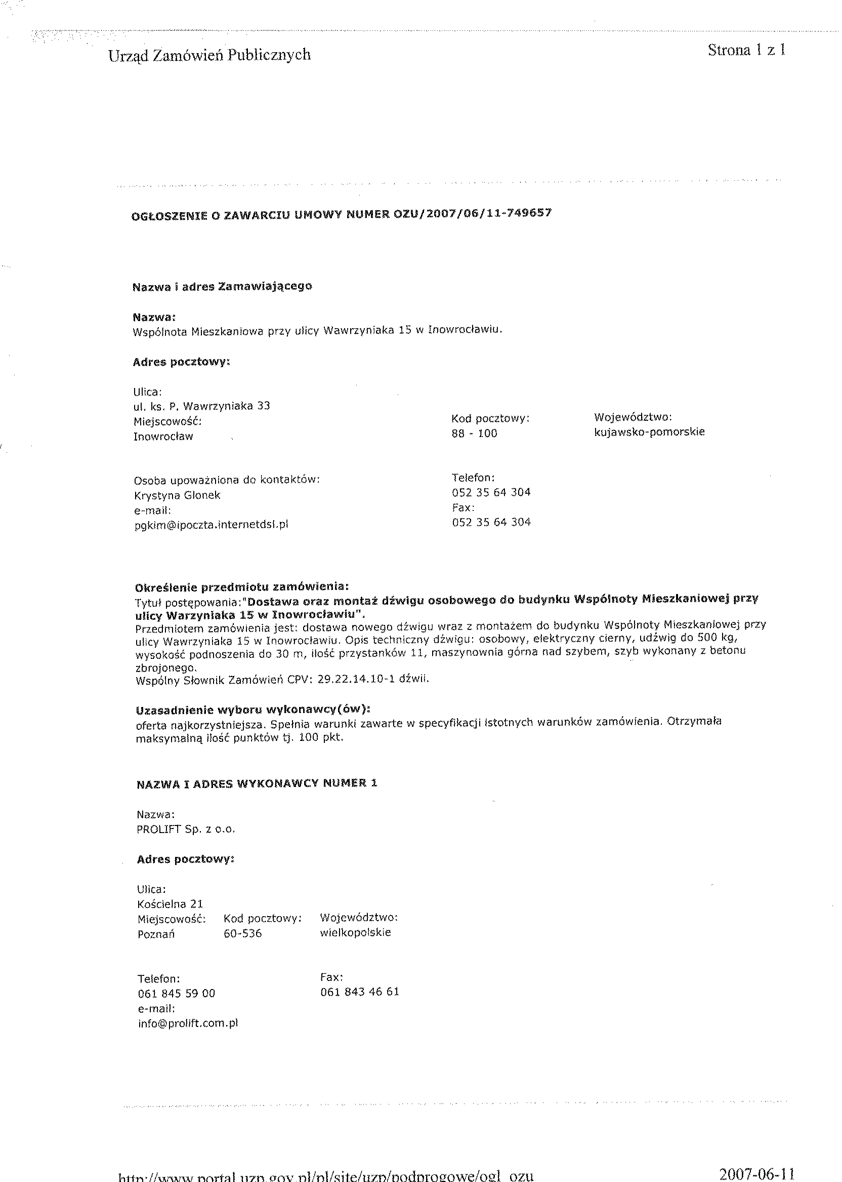 3. 聽Nomenklatura – wg Wsp贸lnego S艂ownika Zam贸wie艅 (CPV): 29.22.14.10 – 1 d藕wigiTryb post臋powania: przetarg nieograniczony Rodzaj zam贸wienia: dostawa. 4. Przedmiotem zam贸wienia jest: dostawa nowego d藕wigu wraz z monta偶em do budynku Wsp贸lnoty Mieszkaniowej przy ulicy Wawrzyniaka 15 -聽 w ilo艣ci 1 szt. 5. Opis techniczny d藕wigu: osobowy, elektryczny cierny, ud藕wig do 500 kg, wysoko艣膰 podnoszenia do 30 m, ilo艣膰 przystank贸w 11, maszynownia g贸rna nad szybem, szyb wykonany z betonu zbrojonego. 6. Wymagania wobec Dostawcy/ Wykonawcy: a) przygotowanie formalno艣ci zwi膮zanych z Urz臋dem Dozoru Technicznego, b) gwarancja 24 miesi膮ce, c) zapewnienie serwisu gwarancyjnego i pogwarancyjnego. 7. Termin wykonania: 5 miesi臋cy od podpisania umowy. 8. Nie dopuszcza si臋 sk艂adania ofert cz臋艣ciowych. 9. Nie dopuszcza si臋 sk艂adania ofert wariantowych. 10. Zamawiaj膮cy nie przewiduje zawarcia umowy ramowej, jak r贸wnie偶 nie dokona wyboru oferty najkorzystniejszej z zastosowaniem aukcji elektronicznej. 11. Osobami uprawnionymi do kontakt贸w z dostawcami/wykonawcami s膮: 聽聽聽聽 a) K. Glonek, tel./faks聽 052 35 64聽304, 聽聽聽聽 b) Maria sarnowska, tel. 052聽 35 64聽325. 12. Adres strony internetowej, na kt贸rej dost臋pna jest specyfikacja istotnych warunk贸w zam贸wienia: http://pgkim-inowroclaw.samorzady.pl 13. Op艂ata za otrzymanie specyfikacji istotnych warunk贸w zam贸wienia b臋dzie pokrywa膰 jedynie koszty jej druku oraz聽 przekazania. 14. Dostawca/Wykonawca zainteresowany post臋powaniem powinien z艂o偶y膰 wniosek u zamawiaj膮cego z podaniem wszystkich danych firmy -聽 niezb臋dnych do przekazywania zmian i zapyta艅 dotycz膮cych powy偶szego post臋powania. 聽