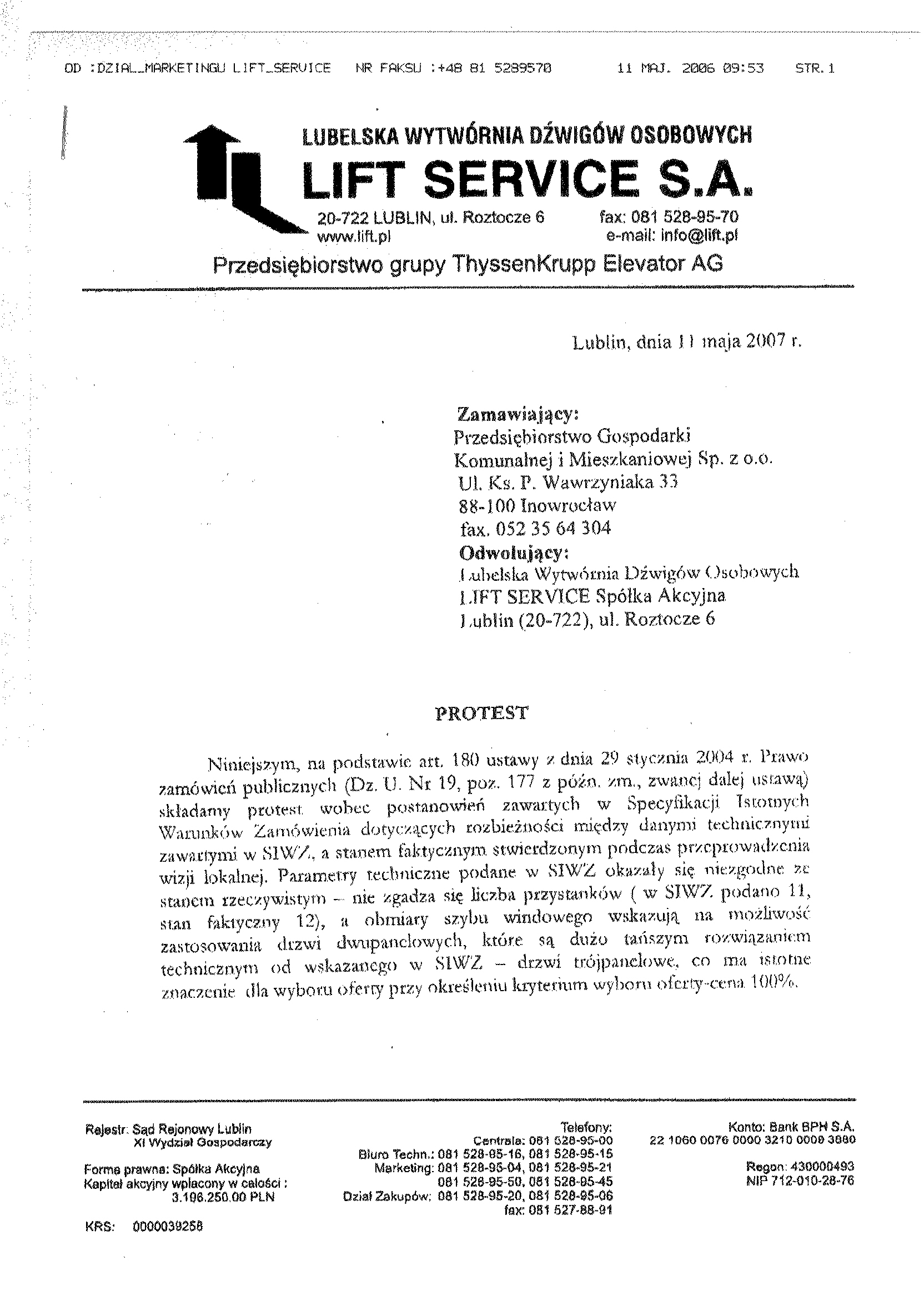 17. Miejsce i termin sk艂adania ofert: sekretariat Przedsi臋biorstwa Gospodarki Komunalnej i Mieszkaniowej Sp. z o.o., ul. ks. Piotra Wawrzyniaka 33, 88-100 Inowroc艂aw, do dnia 14 maja 2007 r. do godz. 9.30. 18. Kryteria wyboru oferty聽 (w % ): cena聽 - 100 % 19. Zamawiaj膮cy nie wymaga wadium. 20.Miejsce i termin otwarcia ofert: Przedsi臋biorstwo Gospodarki Komunalnej i Mieszkaniowej Sp. z o.o., ul. ks. Piotra Wawrzyniaka 33, 88-100 Inowroc艂aw dnia 14 maja 2007聽 r.聽 o godz. 10.00 (salka konferencyjna). 21.Termin zwi膮zania聽 ofert膮: 30 dni . 22. zamawiaj膮cy nie wymaga wniesienia zabezpieczenia nale偶ytego wykonania umowy. 聽