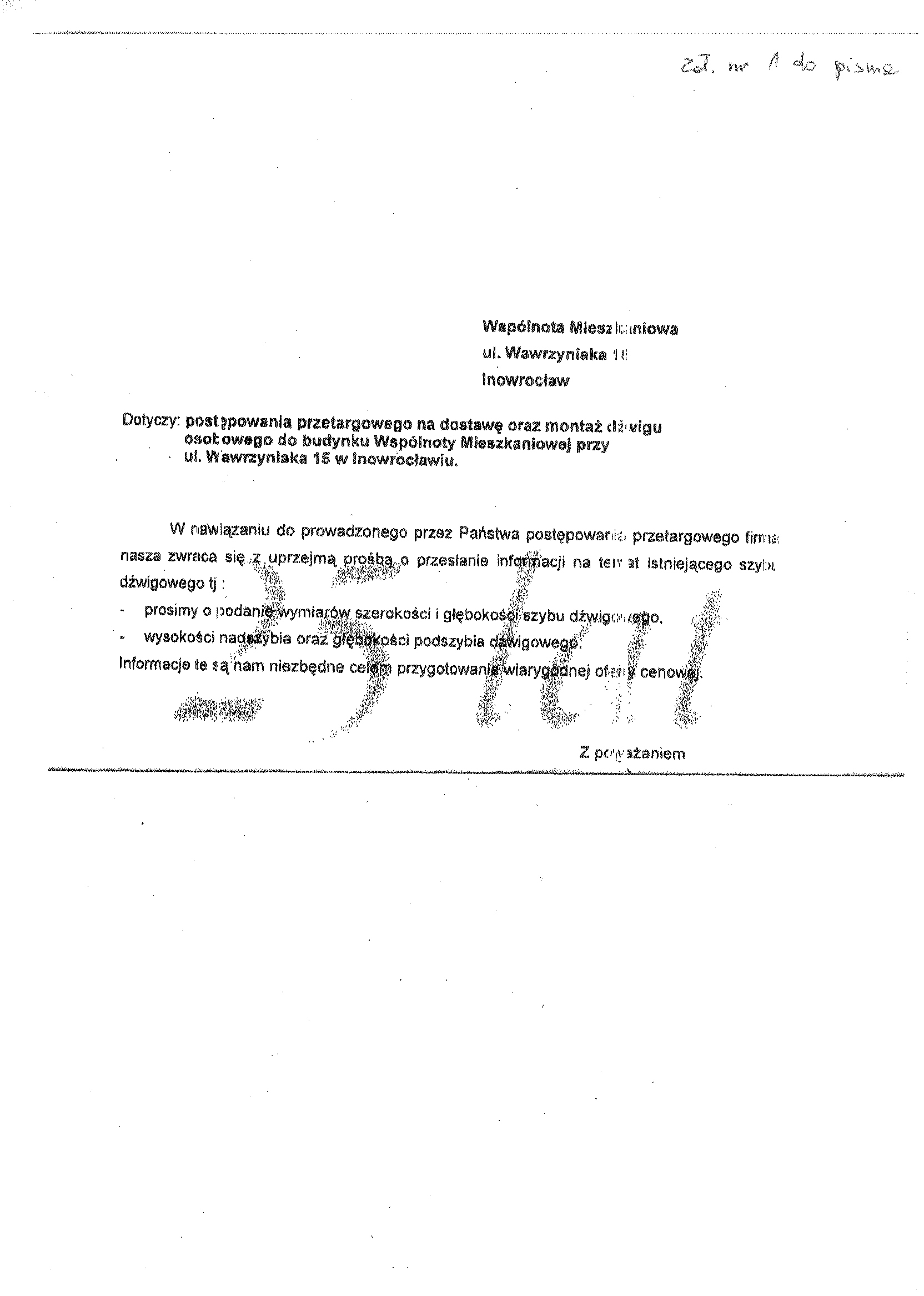 2. Przedmiot zam贸wienia: „Dostawa oraz monta偶 d藕wigu osobowego do budynku Wsp贸lnoty Mieszkaniowej przy ulicy Wawrzyniaka 15 w Inowroc艂awiu”. 聽