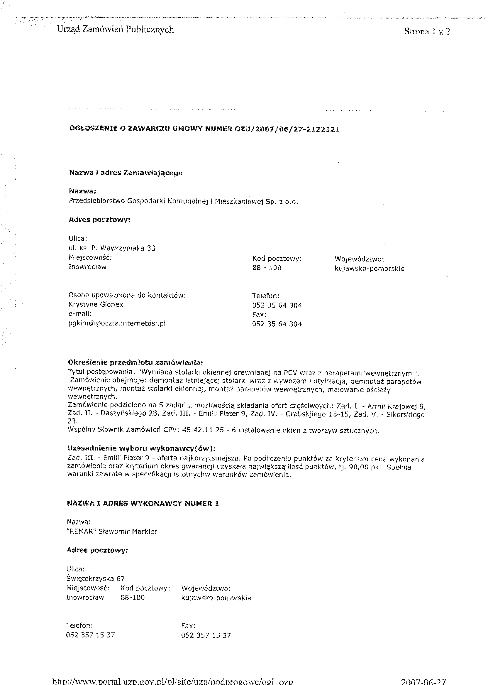 14. W celu potwierdzenia, 偶e Wykonawca posiada uprawnienie do wykonywania okre艣lonej dzia艂alno艣ci lub czynno艣ci oraz nie podlega wykluczeniu na podstawie art. 24 ustawy z dnia 29 stycznia 2004 r. - Prawo zam贸wie艅 publicznych, zamawiaj膮cy 偶膮da, nast臋puj膮cych dokument贸w: a) aktualnego odpisu z w艂a艣ciwego rejestru albo aktualnego za艣wiadczenia o wpisie do ewidencji聽聽dzia艂alno艣ci gospodarczej, je偶eli odr臋bne przepisy wymagaj膮 wpisu do rejestru lub zg艂oszenia do ewidencji dzia艂alno艣ci gospodarczej, wystawionego nie wcze艣niej ni偶 6 miesi臋cy przed up艂ywem聽聽聽terminu sk艂adania ofert; b) o艣wiadczenie wykonawcy, 偶e nie posiada zaleg艂o艣ci podatkowej wobec Naczelnika Urz臋du Skarbowego, c) o艣wiadczenie wykonawcy, 偶e nie posiada zaleg艂o艣ci wobec Zak艂adu Ubezpiecze艅 Spo艂ecznych w op艂acaniu sk艂adek na ubezpieczenie spo艂eczne, zdrowotne oraz Fundusz Pracy. 14.1.W celu potwierdzenia posiadania przez wykonawc臋 niezb臋dnej wiedzy i do艣wiadczenia oraz os贸b zdolnych do wykonania zam贸wienia, zamawiaj膮cy 偶膮da nast臋puj膮cych dokument贸w: a) wykazu wykonanych rob贸t budowlanych w okresie ostatniego 1 roku, przed dniem wszcz臋cia post臋powania o udzielenie zam贸wienia, z podaniem ich warto艣ci oraz daty i miejsca wykonania oraz za艂膮czeniem dokument贸w potwierdzaj膮cych, 偶e roboty te zosta艂y wykonane nale偶ycie, z艂. nr 2 do siwz (minimum 1 referencja), 14.2. W celu potwierdzenia, 偶e wykonawca znajduje si臋 w sytuacji ekonomicznej i finansowej zapewniaj膮cej wykonanie zam贸wienia zamawiaj膮cy 偶膮da nast臋puj膮cych dokument贸w: a) polisy, a w przypadku jej braku innego dokumentu potwierdzaj膮cego, 偶e wykonawca jest聽聽聽聽ubezpieczony od odpowiedzialno艣ci cywilnej w zakresie prowadzonej dzia艂alno艣ci. 14.3.Kosztorys ofertowy, kt贸ry musi by膰 integraln膮 cz臋艣ci膮 z艂o偶onej oferty. Wykonawca mo偶e przyj膮膰 dowoln膮 form臋 i聽 podstaw臋 wyceny rob贸t. 5. Kserokopi臋 atestu na okna, certyfikat (je艣li posiada) oraz atest na profile okienne. 14.4.Wype艂nione nast臋puj膮ce za艂膮czniki: a) o艣wiadczenie w trybie art. 24 ustawy Pzp (za艂. nr 3 do siwz), b) o艣wiadczenie w trybie art.22 ust.1 pkt.1-4聽 ustawy聽 Pzp (za艂. nr 4 do siwz). c) formularz ofertowy wykonawcy (za艂. nr 1 do swiz). 15. Miejsce i termin sk艂adania ofert: sekretariat Przedsi臋biorstwa Gospodarki Komunalnej i Mieszkaniowej Sp. z o.o., ul. ks. Piotra Wawrzyniaka 33, 88-100 Inowroc艂aw, do dnia 11 maja 2007 r. do godz. 10.30. 16. Kryteria wyboru oferty聽 (w % ): a) cena wykonania zam贸wienia – 80 % b) gwarancja – 20 %. 17. Zamawiaj膮cy nie wymaga wadium. 18.Miejsce i termin otwarcia ofert: Przedsi臋biorstwo Gospodarki Komunalnej i Mieszkaniowej Sp. z o.o., ul. ks. Piotra Wawrzyniaka 33, 88-100 Inowroc艂aw dnia 11 maja 2007聽 r.聽 o godz. 11.00 (salka konferencyjna). 19.Termin zwi膮zania聽 ofert膮: 30 dni . 20. Zamawiaj膮cy nie wymaga wniesienia zabezpieczenia nale偶ytego wykonania umowy (znwu). 聽