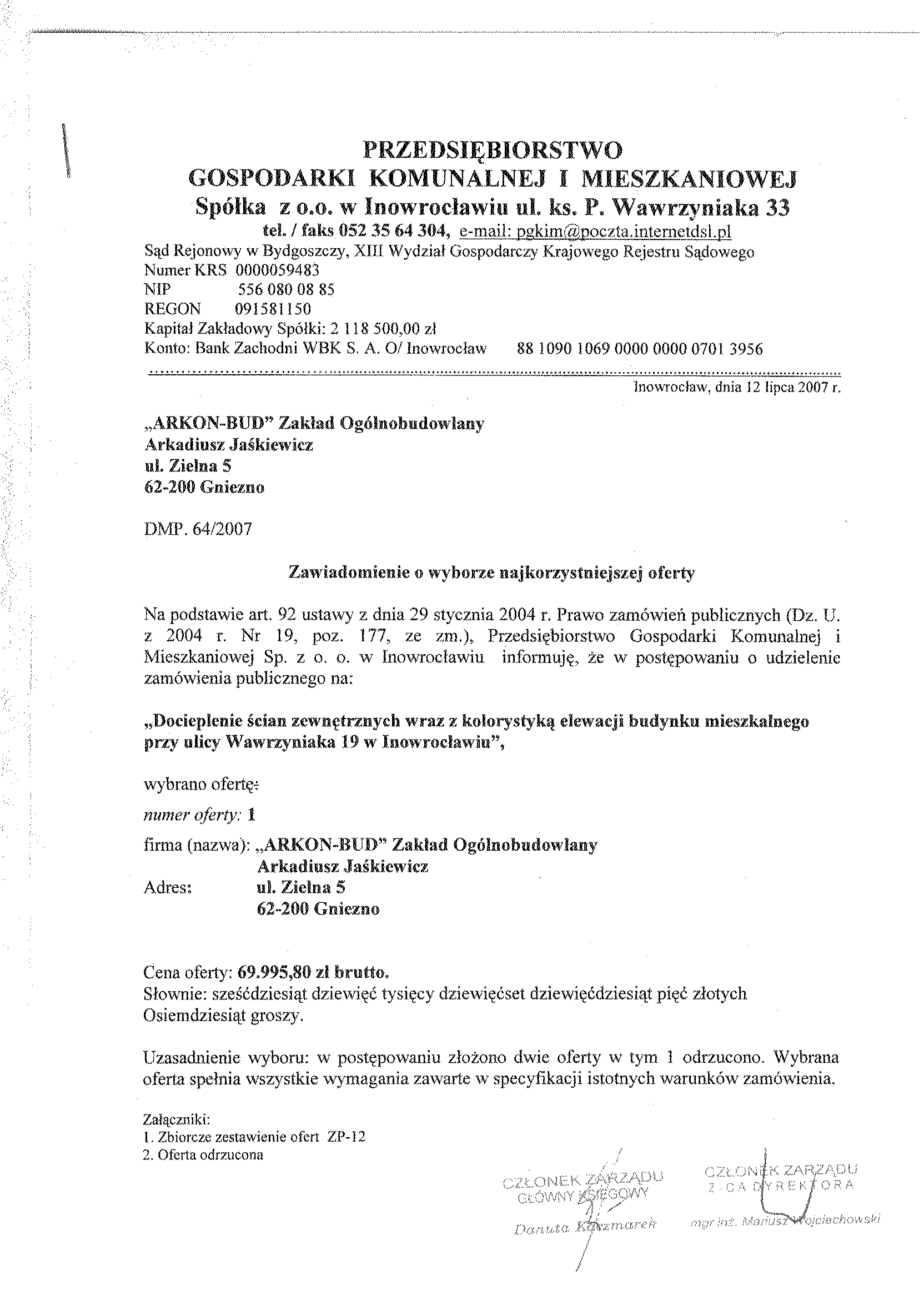1. Zamawiaj膮cy: 聽聽Przedsi臋biorstwo Gospodarki Komunalnej i Mieszkaniowej Sp. z o.o. w Inowroc艂awiu 聽 Ulica: ks. Piotra Wawrzyniaka 33 Kod: 88-100, Miejscowo艣膰: Inowroc艂aw Telefon / faks 052 35 64聽304 e-mail: pgkim@poczta.internetdsl.pl聽 http://pgkim-inowroclaw.samorzady.pl 聽