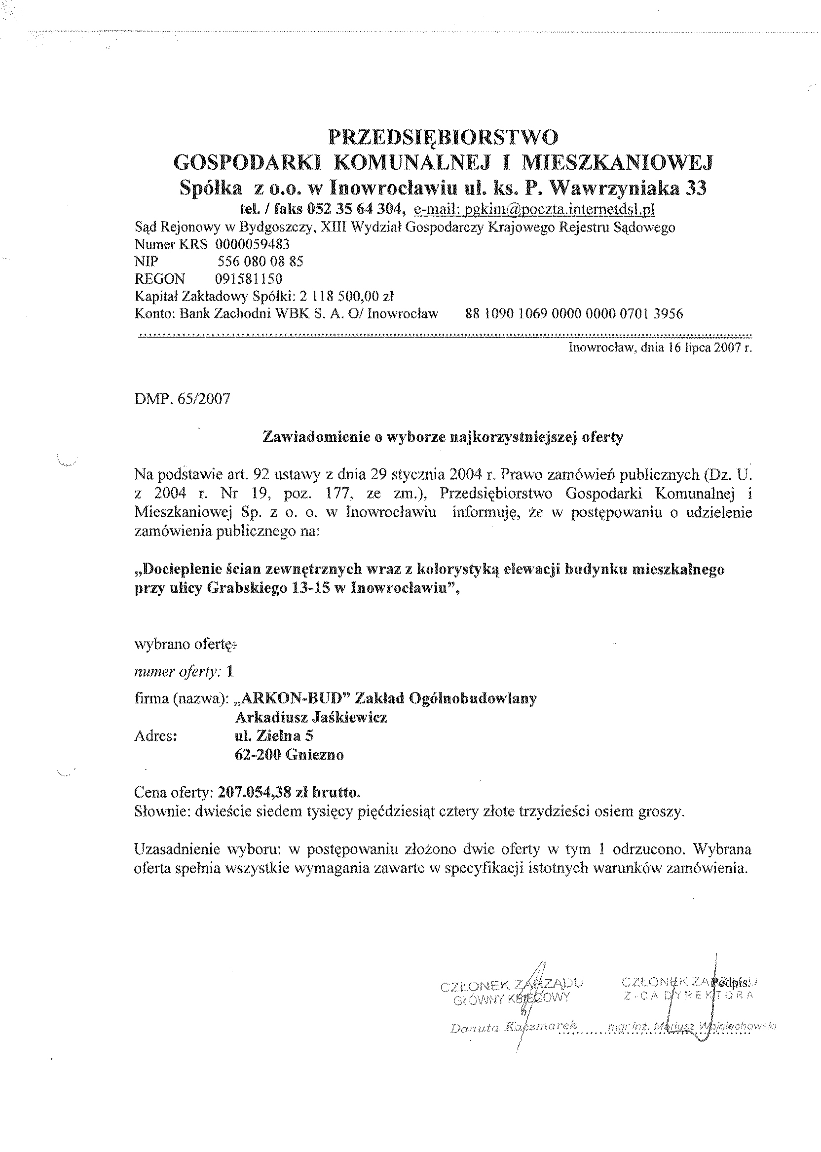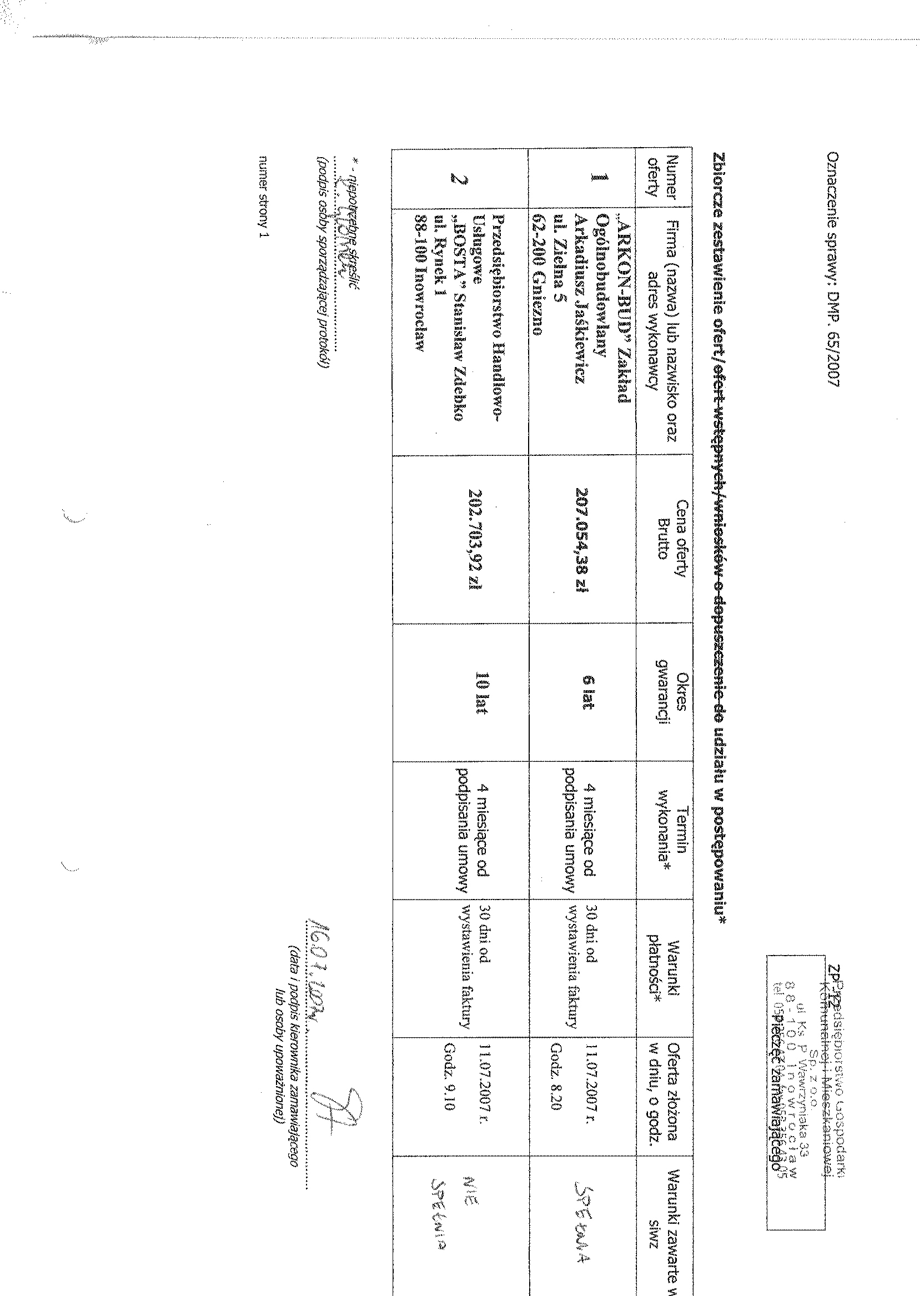 Numer sprawy: DMP. 65/2007聽聽聽聽聽聽聽聽聽聽聽聽聽聽聽聽聽聽聽聽聽聽聽聽聽聽聽聽聽聽聽聽Inowroc艂aw, dnia 20 czerwca 2007 r.聽聽