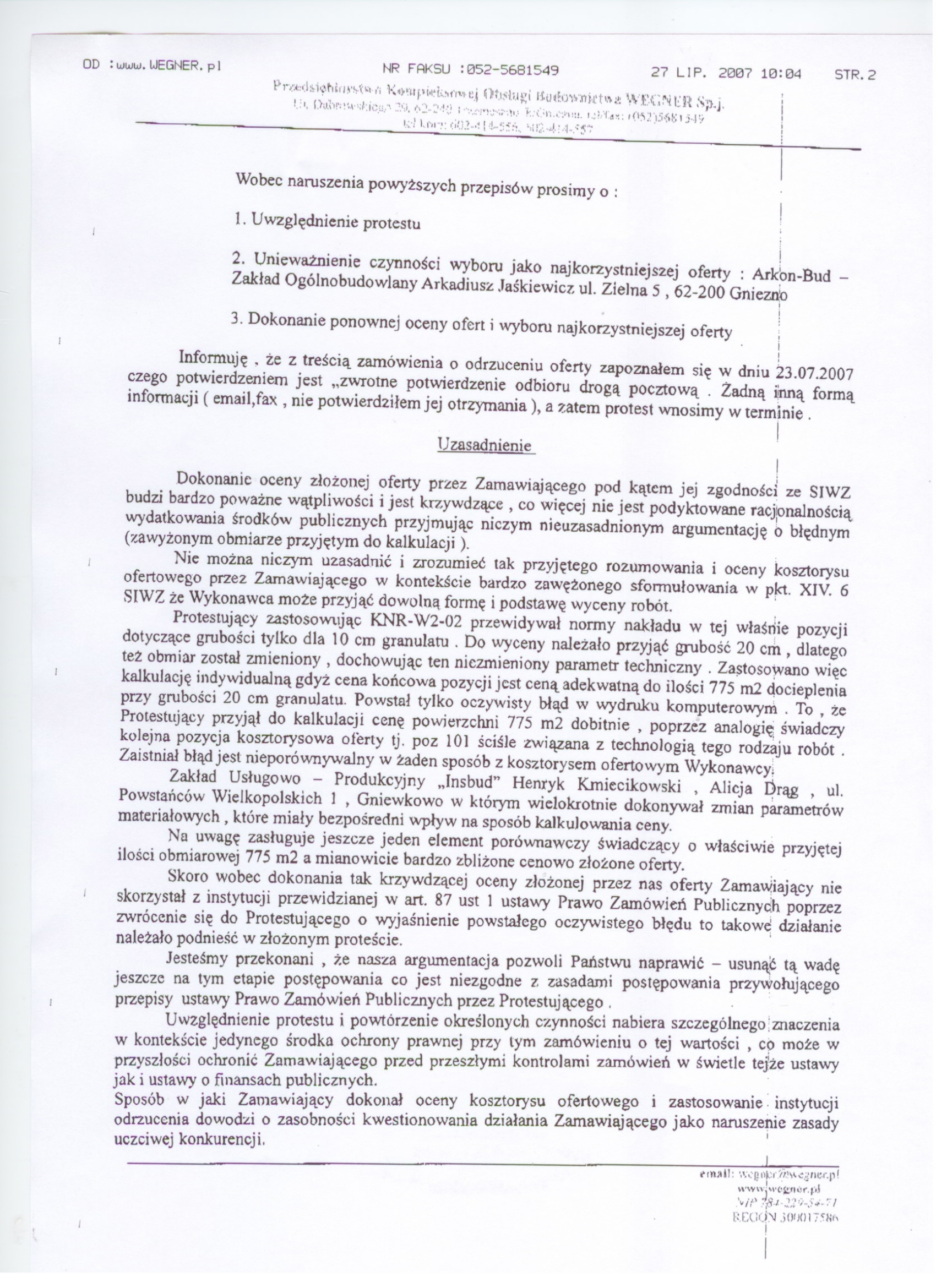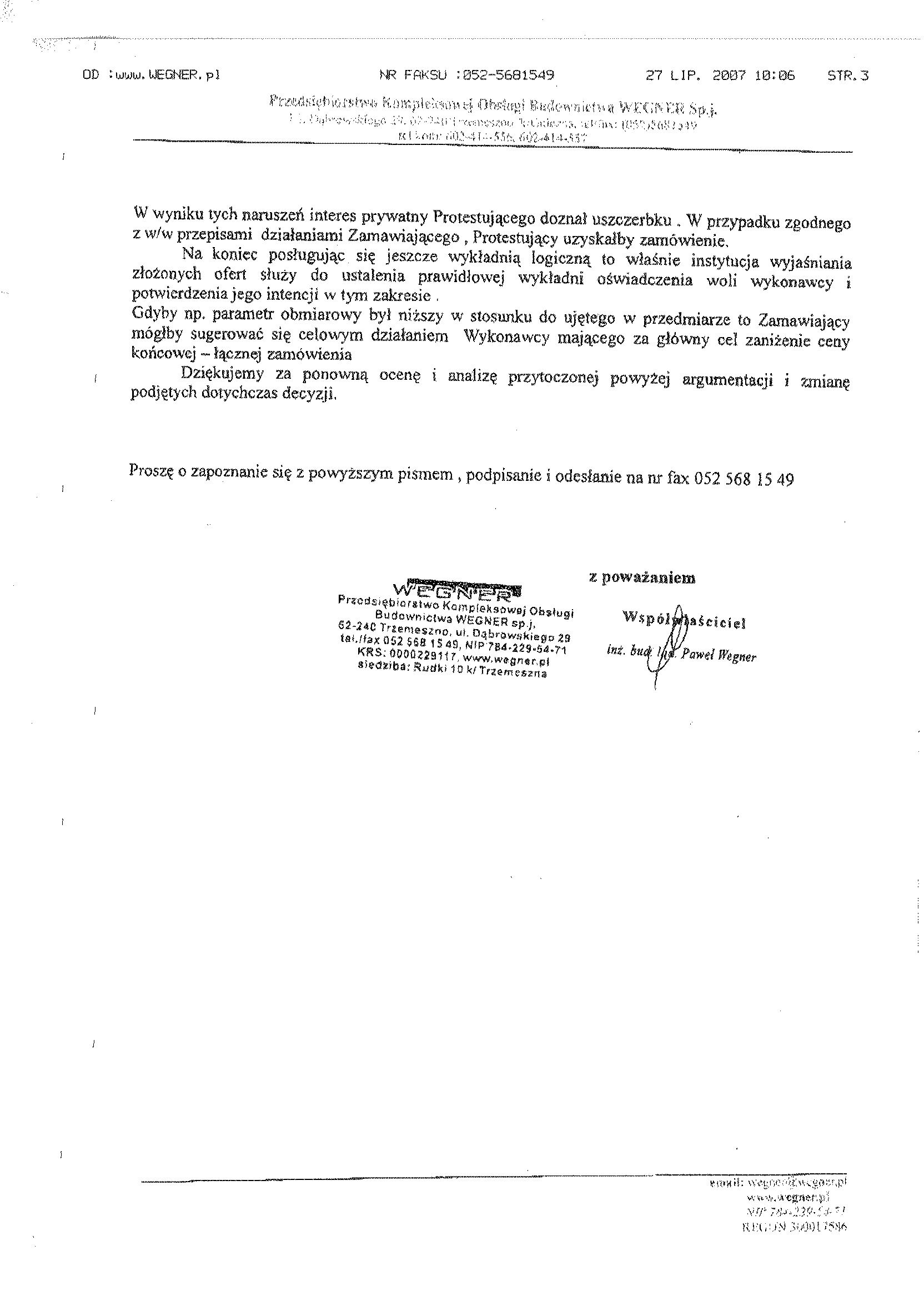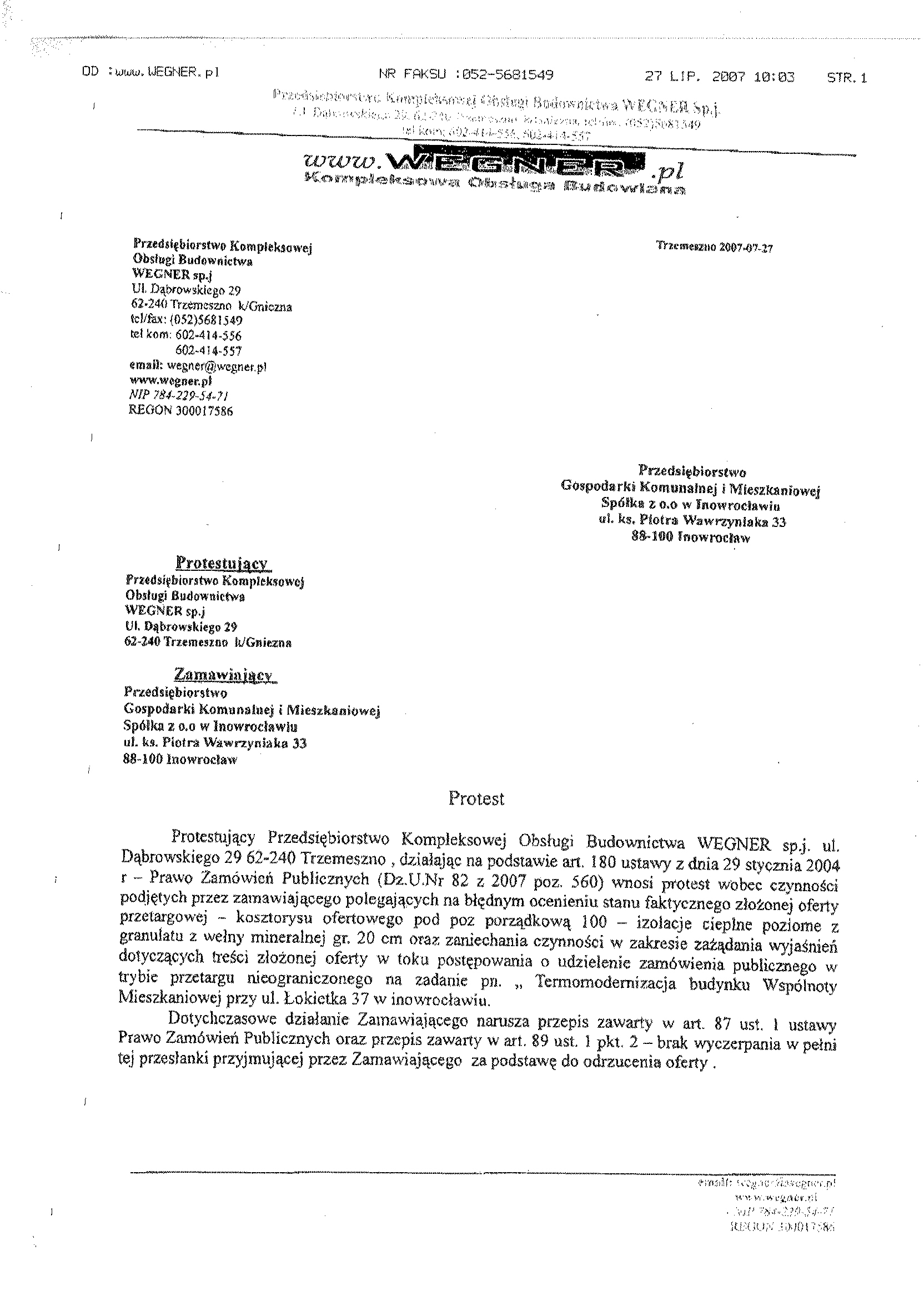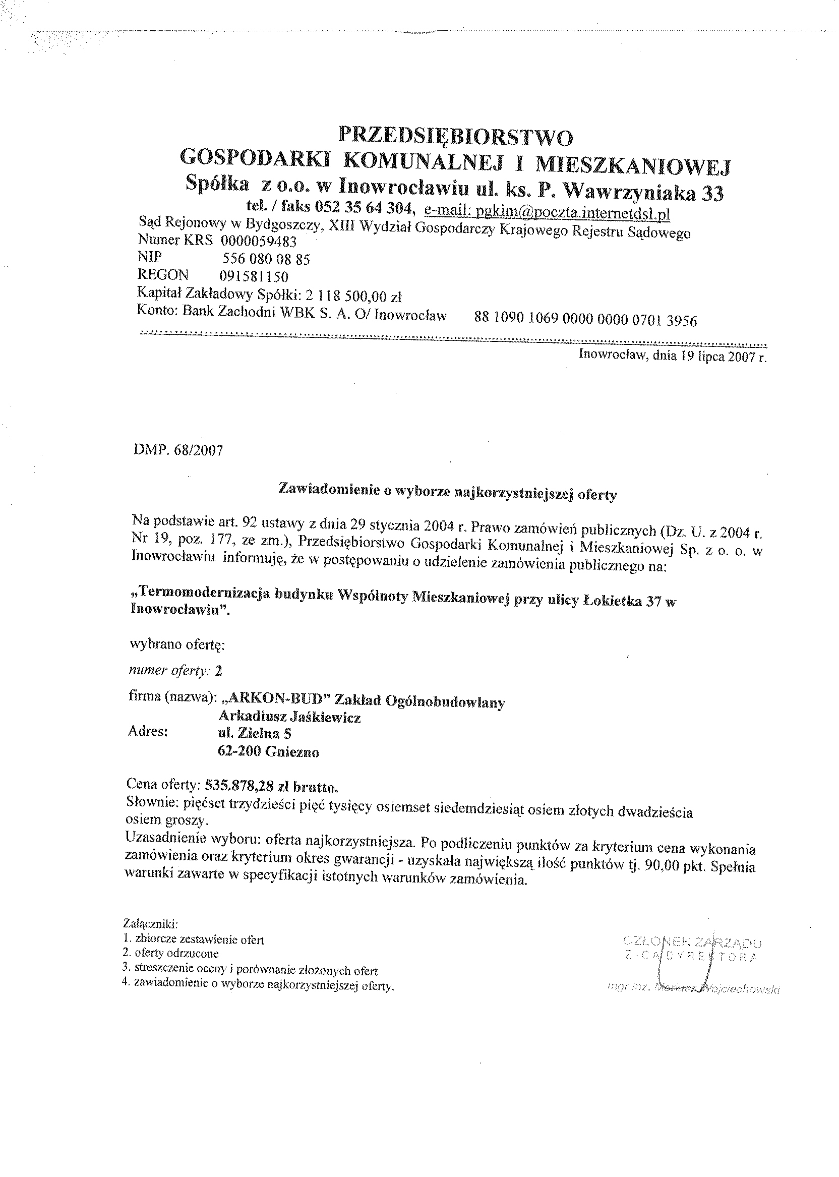 15. W celu potwierdzenia, 偶e Wykonawca posiada uprawnienie do wykonywania okre艣lonej dzia艂alno艣ci lub czynno艣ci oraz nie podlega wykluczeniu na podstawie art. 24 ustawy z dnia 29 stycznia 2004 r. - Prawo zam贸wie艅 publicznych, zamawiaj膮cy 偶膮da, nast臋puj膮cych dokument贸w: a) aktualnego odpisu z w艂a艣ciwego rejestru albo aktualnego za艣wiadczenia o wpisie do ewidencji dzia艂alno艣ci gospodarczej, je偶eli odr臋bne przepisy wymagaj膮 wpisu do rejestru lub zg艂oszenia do ewidencji dzia艂alno艣ci gospodarczej, wystawionego nie wcze艣niej ni偶 6 miesi臋cy przed up艂ywem terminu sk艂adania ofert; b) o艣wiadczenie wykonawcy, 偶e nie posiada zaleg艂o艣ci podatkowej wobec Naczelnika Urz臋du Skarbowego, c) o艣wiadczenie wykonawcy, 偶e nie posiada zaleg艂o艣ci wobec Zak艂adu Ubezpiecze艅 Spo艂ecznych w op艂acaniu sk艂adek na ubezpieczenie spo艂eczne, zdrowotne oraz Fundusz Pracy. 15.1.W celu potwierdzenia posiadania przez wykonawc臋 niezb臋dnej wiedzy i do艣wiadczenia oraz os贸b zdolnych do wykonania zam贸wienia, zamawiaj膮cy 偶膮da nast臋puj膮cych dokument贸w: a) wykazu wykonanych rob贸t budowlanych w okresie ostatnich 5 lat przed dniem wszcz臋cia post臋powania o udzielenie zam贸wienia, a je偶eli okres prowadzenia dzia艂alno艣ci jest kr贸tszy – w tym okresie, odpowiadaj膮cych swoim rodzajem i warto艣ci膮 robotom budowlanym stanowi膮cym聽 przedmiot zam贸wienia, z podaniem ich warto艣ci oraz daty i miejsca wykonania oraz za艂膮czeniem dokument贸w potwierdzaj膮cych, 偶e roboty te zosta艂y wykonane nale偶ycie, b) zamawiaj膮cy 偶膮da za艂膮czenia kserokopii uprawnie艅 budowlanych w specjalno艣ciach obj臋tych przedmiotem zam贸wienia, c) aktualnego wpisu do w艂a艣ciwych Izb Zawodowych. 15.2. W celu potwierdzenia, 偶e wykonawca znajduje si臋 w sytuacji ekonomicznej i finansowej zapewniaj膮cej wykonanie zam贸wienia zamawiaj膮cy 偶膮da nast臋puj膮cych dokument贸w: a) polisy, a w przypadku jej braku innego dokumentu potwierdzaj膮cego, 偶e wykonawca jest ubezpieczony od odpowiedzialno艣ci cywilnej w zakresie prowadzonej dzia艂alno艣ci. 15.3.Wype艂nione nast臋puj膮ce za艂膮czniki: a) formularz ofertowy wykonawcy (za艂. nr 1 do swiz). b) wykaz podobnych rob贸t (za艂. nr 2 do siwz), c) o艣wiadczenie w trybie art. 24 ustawy Pzp (za艂. nr 3 do siwz), d) o艣wiadczenie w trybie art.22 ust.1 pkt.1-4聽 ustawy聽 Pzp (za艂. nr 4 do siwz). 15.4.Kosztorys ofertowy, kt贸ry musi by膰 integraln膮 cz臋艣ci膮 z艂o偶onej oferty. Podstaw膮 do opracowania przez Wykonawc臋聽 kosztorysu ofertowego jest聽 przedmiar rob贸t, b臋d膮cy za艂膮cznikiem do siwz. Wykonawca mo偶e przyj膮膰 dowoln膮 form臋 i podstaw臋 wyceny rob贸t. 16. Miejsce i termin sk艂adania ofert: oferty nale偶y z艂o偶y膰 w sekretariacie Przedsi臋biorstwa Gospodarki Komunalnej i Mieszkaniowej Sp. z o.o., ul. ks. Piotra Wawrzyniaka 33, 88-100 Inowroc艂aw,聽 do dnia 17 lipca 2007 r. godzina 9.30. 聽