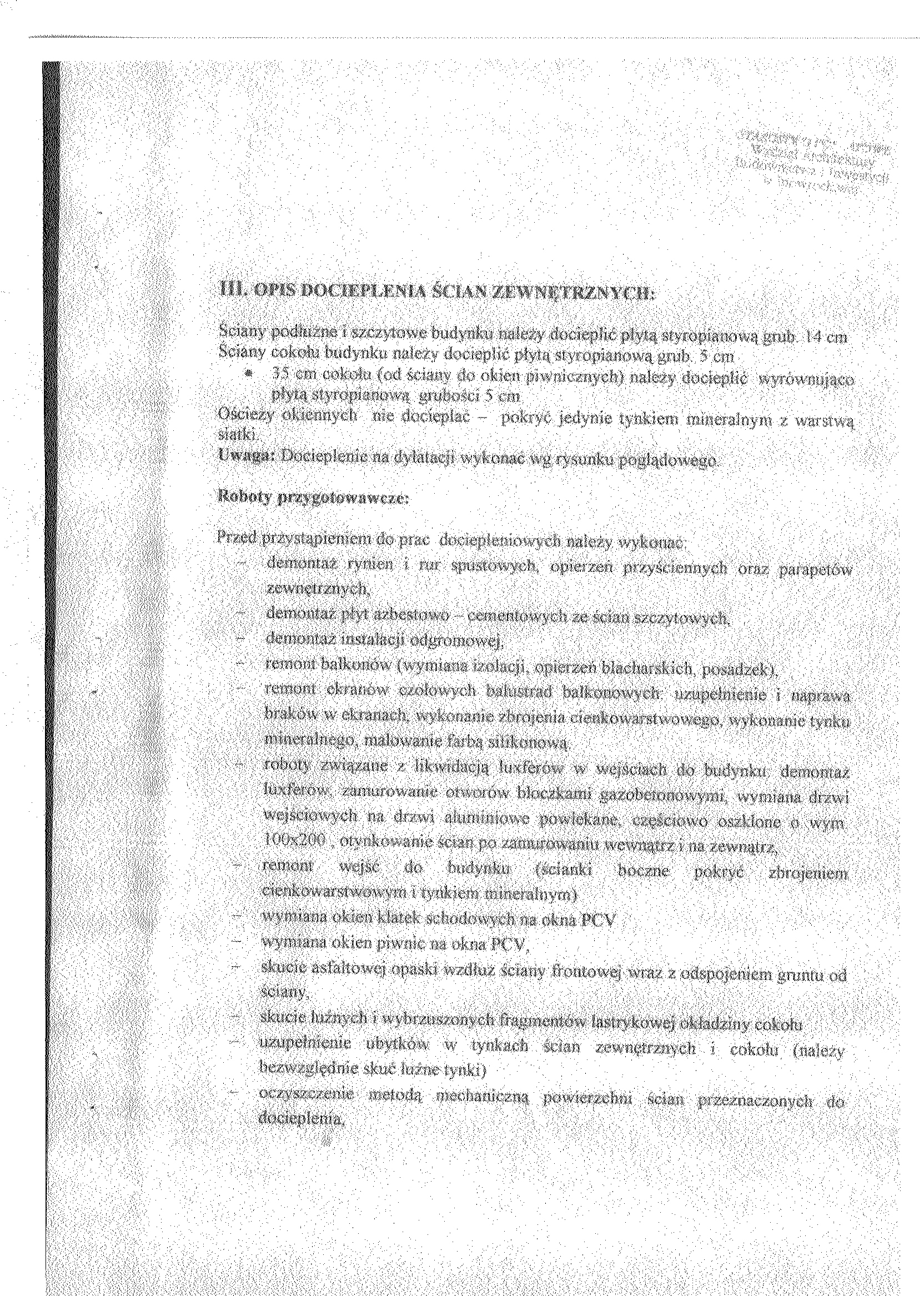 4. Nie dopuszcza si臋 sk艂adania ofert cz臋艣ciowych. 5. Nie dopuszcza si臋 sk艂adania ofert wariantowych. 6. Nie b臋dzie prowadzona aukcja elektroniczna. 7. Numer og艂oszenia w BZP: 105660 – 2007; data zamieszczenia 25.06.2007 r. 8. Opis przedmiotu zam贸wienia. Zam贸wienie zosta艂o podzielone na etapy i obejmuje: Etap - I 聽- remont wej艣膰 do budynku, wymiana stolarki okiennej klatek schodowych oraz piwnic od strony frontowej, docieplenie – roboty pomocnicze od strony frontowej, docieplenie – strona frontowa, Etap – II- 聽docieplenie – roboty pomocnicze od strony balkon贸w i szczyt贸w, doceieplenie – strona balkonowa plus szczyty, demonta偶 p艂yt azbestowych ze 艣cian szczytowych, wymiana stolarki okiennej od strony balkon贸w, remont balkon贸w, dociepelenie stropodachu wraz z remontem dachu (wymiana pokrycia),聽 opaska betonowa wok贸艂 budynku. 聽