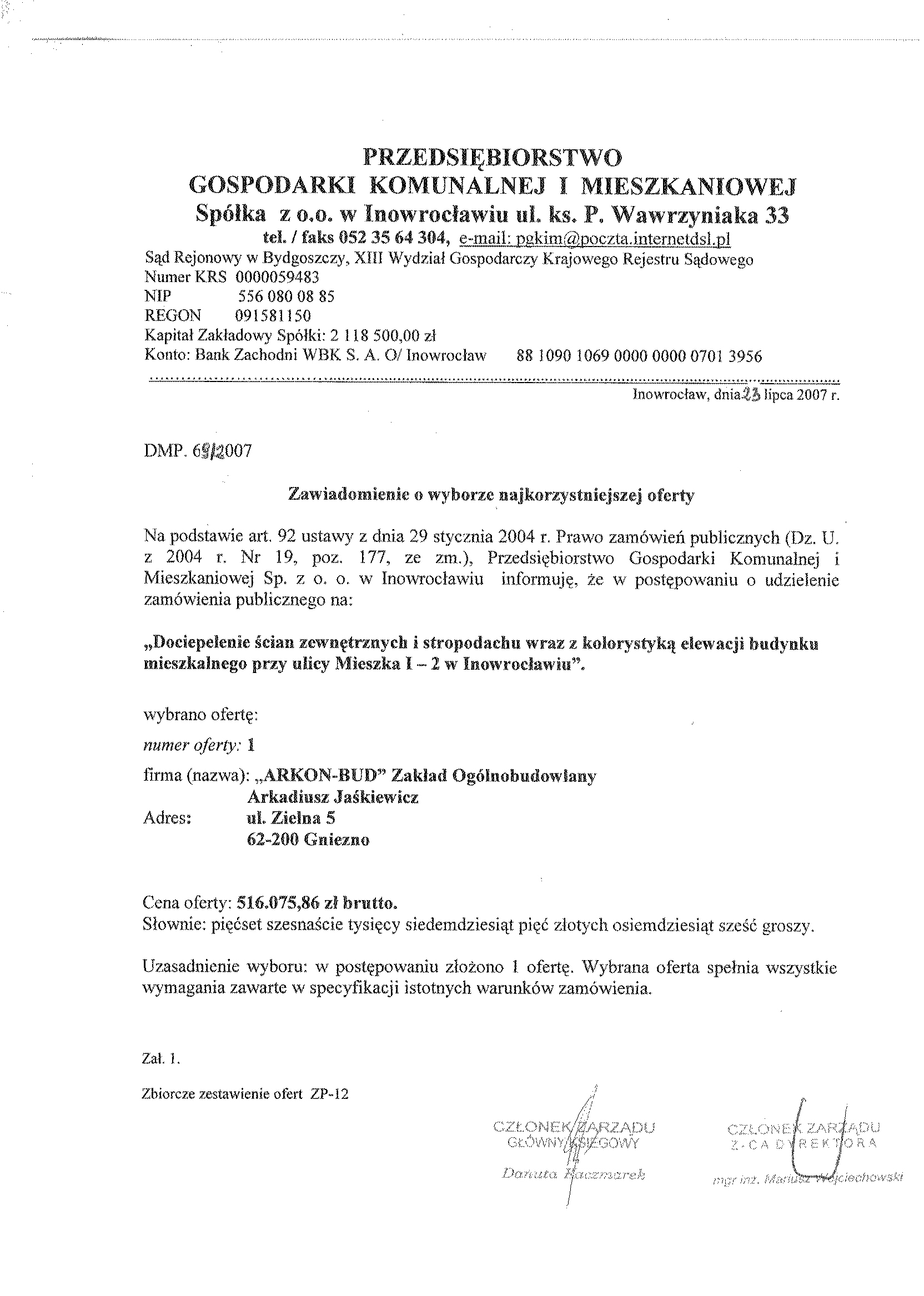 2. Przedmiot zam贸wienia: „Dociepelenie 艣cian zewn臋trznych i stropodachu wraz z kolorystyk膮 elewacji budynku mieszkalnego przy ulicy Mieszka I – 2 w Inowroc艂awiu”.