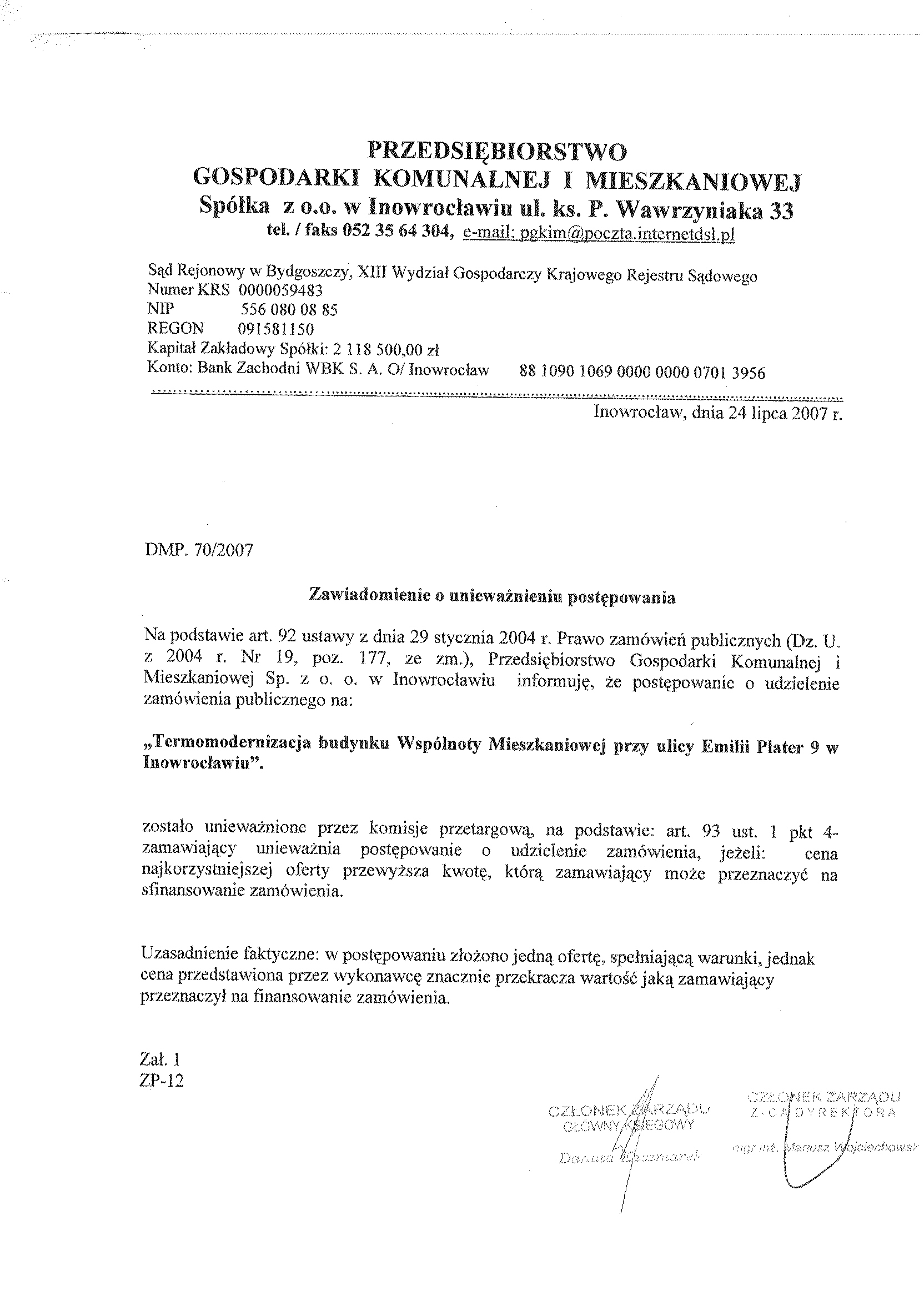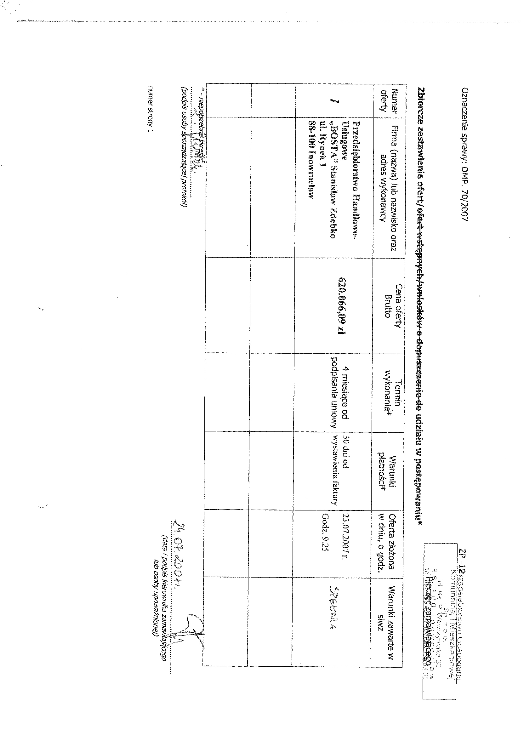 19.Miejsce i termin otwarcia ofert: Przedsi臋biorstwo Gospodarki Komunalnej i Mieszkaniowej Sp. z o.o., ul. ks. Piotra Wawrzyniaka 33, 88-100 Inowroc艂aw, do dnia 23 lipca 2007 r. godzina 10.00