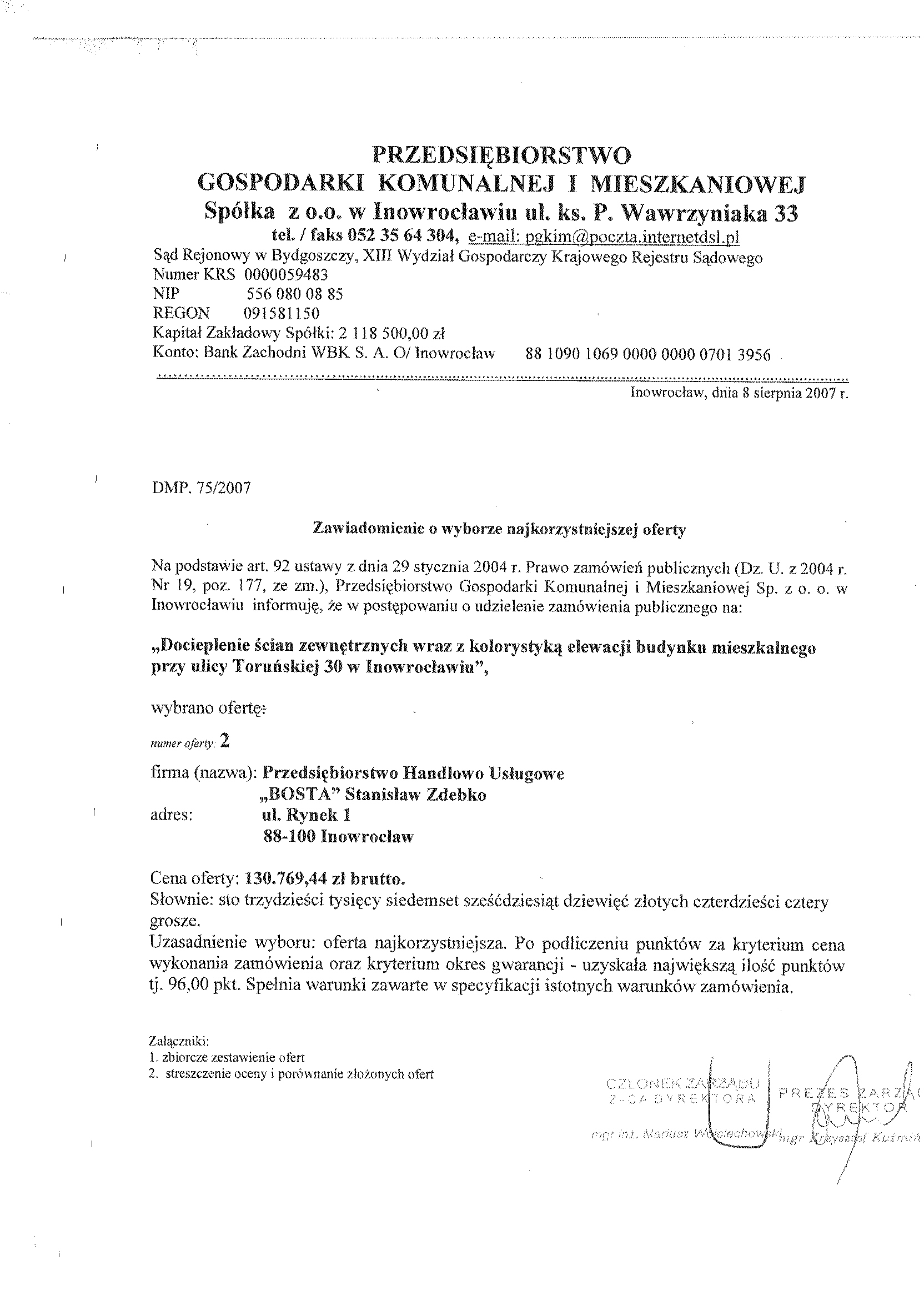 4. Nie dopuszcza si臋 sk艂adania ofert cz臋艣ciowych. 5. Nie dopuszcza si臋 sk艂adania ofert wariantowych. 6. 聽Zamawiaj膮cy nie przewiduje zawarcia umowy ramowej, jak r贸wnie偶 nie dokona wyboru oferty najkorzystniejszej z zastosowaniem aukcji elektronicznej. 7. Numer og艂oszenia w BZP: 聽116692 – 2007; data zamieszczenia 11.07.2007 r. 8. Opis przedmiotu zam贸wienia. Zam贸wienie obejmuje: rozbi贸rka pokrycia gzymsu, rozebranie 艣cian, filar贸w i kolumn, rozebranie obr贸bek blacharskich, obr贸bki blacharskie, ocieplenie budynku p艂ytami styropianowymi, przyklejenie siatki, mocowanie ko艂kami, ochrona naro偶nik贸w, wykonanie tynk贸w, malowanie farbami, wykucie z muru i wstawienie nowych okien, rozbi贸rka pokrycia dachowego, monta偶 blach, pokrycie dachu pap膮 termozgrzewaln膮, wykonanie izolacji cieplnej, wymiana przewod贸w instalacji. 9. Osobami uprawnionymi do kontakt贸w z wykonawcami s膮: 聽聽聽 a) Krystyna Glonek, tel. 052 35 64聽304, 聽聽聽 b) Maria Sarnowska, tel. 052 35 64聽320, 聽聽聽 c) Anna Nawrocka, tel. 052 35 64聽325. 10. Termin (okres) realizacji zam贸wienia: 4 miesi膮ce od podpisania umowy. 11. Adres strony internetowej, na kt贸rej dost臋pna jest specyfikacja istotnych warunk贸w zam贸wienia: http://pgkim-inowroclaw.samorzady.pl 12. Op艂ata za otrzymanie specyfikacji istotnych warunk贸w zam贸wienia b臋dzie pokrywa膰 jedynie koszty jej druku oraz聽 przekazania. 13.Wykonawca zainteresowany post臋powaniem powinien z艂o偶y膰 wniosek u zamawiaj膮cego z podaniem wszystkich danych firmy -聽 niezb臋dnych do przekazywania zmian i zapyta艅 dotycz膮cych powy偶szego post臋powania. 14. O udzielenie zam贸wienia mog膮 ubiega膰 si臋 wy艂膮cznie Wykonawcy, kt贸rzy: 1) posiadaj膮 uprawnienia do wykonywania okre艣lonej dzia艂alno艣ci lub czynno艣ci, je偶eli ustawy nak艂adaj膮 obowi膮zek posiadania takich uprawnie艅, 2) posiadaj膮 niezb臋dn膮 wiedz臋 i do艣wiadczenie oraz potencja艂 techniczny, a tak偶e dysponuj膮 osobami zdolnymi do wykonania zam贸wienia, 3) znajduj膮 si臋 w sytuacji ekonomicznej i finansowej zapewniaj膮cej wykonanie zam贸wienia, 4) nie podlegaj膮 wykluczeniu z post臋powania o udzielenie zam贸wienia. Zamawiaj膮cy oceni spe艂nienie warunk贸w wymienionych w niniejszym rozdziale na podstawie z艂o偶onych przez Wykonawc臋 do oferty, o艣wiadcze艅 i dokument贸w. Ocena spe艂niania warunk贸w dokonana zostanie na zasadzie: 聽聽聽聽聽聽聽聽聽聽聽聽聽聽聽聽聽聽聽聽聽聽聽聽聽聽聽聽聽聽聽聽聽聽聽聽聽聽聽聽聽聽聽 spe艂nia/ nie spe艂nia 15. W celu potwierdzenia, 偶e Wykonawca posiada uprawnienie do wykonywania okre艣lonej dzia艂alno艣ci lub czynno艣ci oraz nie podlega wykluczeniu na podstawie art. 24 ustawy z dnia 29 stycznia 2004 r. - Prawo zam贸wie艅 publicznych, zamawiaj膮cy 偶膮da, nast臋puj膮cych dokument贸w: a) aktualnego odpisu z w艂a艣ciwego rejestru albo aktualnego za艣wiadczenia o wpisie do ewidencji dzia艂alno艣ci gospodarczej, je偶eli odr臋bne przepisy wymagaj膮 wpisu do rejestru lub zg艂oszenia do ewidencji dzia艂alno艣ci gospodarczej, wystawionego nie wcze艣niej ni偶 6 miesi臋cy przed up艂ywem terminu sk艂adania ofert; b) o艣wiadczenie wykonawcy, 偶e nie posiada zaleg艂o艣ci podatkowej wobec Naczelnika Urz臋du Skarbowego, c) o艣wiadczenie wykonawcy, 偶e nie posiada zaleg艂o艣ci wobec Zak艂adu Ubezpiecze艅 Spo艂ecznych w op艂acaniu sk艂adek na ubezpieczenie spo艂eczne, zdrowotne oraz Fundusz Pracy. 15.1.W celu potwierdzenia posiadania przez wykonawc臋 niezb臋dnej wiedzy i do艣wiadczenia oraz os贸b zdolnych do wykonania zam贸wienia, zamawiaj膮cy 偶膮da nast臋puj膮cych dokument贸w: a) wykazu wykonanych rob贸t budowlanych w okresie ostatniego 1 roku, przed dniem wszcz臋cia post臋powania o udzielenie zam贸wienia, z podaniem ich warto艣ci oraz daty i miejsca wykonania oraz za艂膮czeniem dokument贸w potwierdzaj膮cych, 偶e roboty te zosta艂y wykonane nale偶ycie, z艂. nr 2 do siwz (minimum 1 referencja), b) zamawiaj膮cy 偶膮da za艂膮czenia kserokopii uprawnie艅 budowlanych w specjalno艣ciach obj臋tych przedmiotem zam贸wienia, c) aktualnego wpisu do w艂a艣ciwych Izb Zawodowych. 15.2. W celu potwierdzenia, 偶e wykonawca znajduje si臋 w sytuacji ekonomicznej i finansowej zapewniaj膮cej wykonanie zam贸wienia zamawiaj膮cy 偶膮da nast臋puj膮cych dokument贸w: a) polisy, a w przypadku jej braku innego dokumentu potwierdzaj膮cego, 偶e wykonawca jest ubezpieczony od odpowiedzialno艣ci cywilnej w zakresie prowadzonej dzia艂alno艣ci. 15.3.Wype艂nione nast臋puj膮ce za艂膮czniki: a) formularz ofertowy wykonawcy (za艂. nr 1 do swiz). b) wykaz podobnych rob贸t (za艂. nr 2 do siwz), d) o艣wiadczenie w trybie art.22 ust.1 pkt.1-4聽 ustawy聽 Pzp (za艂. nr 3 do siwz). 15.4.Kosztorys ofertowy, kt贸ry musi by膰 integraln膮 cz臋艣ci膮 z艂o偶onej oferty. Podstaw膮 do opracowania przez Wykonawc臋聽 kosztorysu ofertowego jest聽 przedmiar rob贸t, b臋d膮cy za艂膮cznikiem do siwz. Wykonawca mo偶e przyj膮膰 dowoln膮 form臋 i podstaw臋 wyceny rob贸t. 16. Miejsce i termin sk艂adania ofert: oferty nale偶y z艂o偶y膰 w sekretariacie Przedsi臋biorstwa Gospodarki Komunalnej i Mieszkaniowej Sp. z o.o., ul. ks. Piotra Wawrzyniaka 33, 88-100 Inowroc艂aw,聽 do dnia 2 sierpnia 2007 r. godzina 9.30. 17. Kryteria wyboru ofert: 聽聽聽 聽a)聽 cena wykonania zam贸wienia聽聽聽聽聽聽聽聽聽聽聽聽聽聽 80 聽聽聽聽 b) gwarancja聽聽聽聽聽聽聽聽聽聽聽聽 聽聽聽聽聽聽聽聽聽聽聽聽聽聽聽聽聽聽聽聽聽聽聽聽聽聽聽聽聽聽聽20 17. Zamawiaj膮cy nie wymaga wadium. 18.Miejsce i termin otwarcia ofert: Przedsi臋biorstwo Gospodarki Komunalnej i Mieszkaniowej Sp. z o.o., ul. ks. Piotra Wawrzyniaka 33, 88-100 Inowroc艂aw, do dnia 聽2 sierpnia 2007 r. godzina 10.00 18.Termin zwi膮zania聽 ofert膮: 3