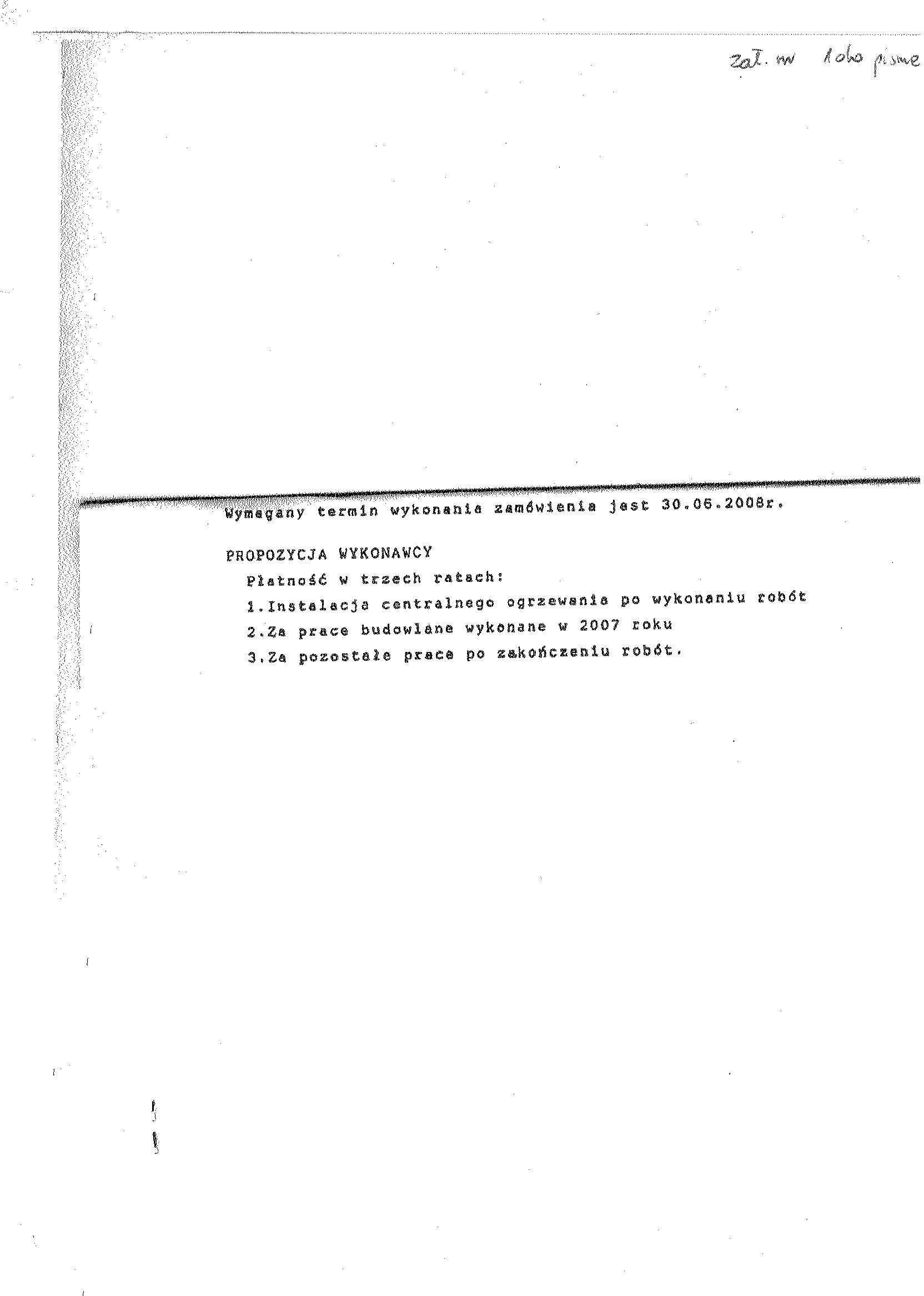 15. W celu potwierdzenia, 偶e Wykonawca posiada uprawnienie do wykonywania okre艣lonej dzia艂alno艣ci lub czynno艣ci oraz nie podlega wykluczeniu na podstawie art. 24 ustawy z dnia 29 stycznia 2004 r. - Prawo zam贸wie艅 publicznych, zamawiaj膮cy 偶膮da, nast臋puj膮cych dokument贸w: a) aktualnego odpisu z w艂a艣ciwego rejestru albo aktualnego za艣wiadczenia o wpisie do ewidencji dzia艂alno艣ci gospodarczej, je偶eli odr臋bne przepisy wymagaj膮 wpisu do rejestru lub zg艂oszenia do ewidencji dzia艂alno艣ci gospodarczej, wystawionego nie wcze艣niej ni偶 6 miesi臋cy przed up艂ywem terminu sk艂adania ofert; b) o艣wiadczenie wykonawcy, 偶e nie posiada zaleg艂o艣ci podatkowej wobec Naczelnika Urz臋du Skarbowego, c) o艣wiadczenie wykonawcy, 偶e nie posiada zaleg艂o艣ci wobec Zak艂adu Ubezpiecze艅 Spo艂ecznych w op艂acaniu sk艂adek na ubezpieczenie spo艂eczne, zdrowotne oraz Fundusz Pracy. 15.1.W celu potwierdzenia posiadania przez wykonawc臋 niezb臋dnej wiedzy i do艣wiadczenia oraz os贸b zdolnych do wykonania zam贸wienia, zamawiaj膮cy 偶膮da nast臋puj膮cych dokument贸w: a) wykazu wykonanych rob贸t budowlanych w okresie ostatniego 1 roku, przed dniem wszcz臋cia post臋powania o udzielenie zam贸wienia, z podaniem ich warto艣ci oraz daty i miejsca wykonania oraz za艂膮czeniem dokument贸w potwierdzaj膮cych, 偶e roboty te zosta艂y wykonane nale偶ycie, z艂. nr 2 do siwz (minimum 1 referencja), b) zamawiaj膮cy 偶膮da za艂膮czenia kserokopii uprawnie艅 budowlanych w specjalno艣ciach obj臋tych przedmiotem zam贸wienia, c) aktualnego wpisu do w艂a艣ciwych Izb Zawodowych. 15.2. W celu potwierdzenia, 偶e wykonawca znajduje si臋 w sytuacji ekonomicznej i finansowej zapewniaj膮cej wykonanie zam贸wienia zamawiaj膮cy 偶膮da nast臋puj膮cych dokument贸w: a) polisy, a w przypadku jej braku innego dokumentu potwierdzaj膮cego, 偶e wykonawca jest ubezpieczony od odpowiedzialno艣ci cywilnej w zakresie prowadzonej dzia艂alno艣ci. 15.3.Wype艂nione nast臋puj膮ce za艂膮czniki: a) formularz ofertowy wykonawcy (za艂. nr 1 do swiz). b) wykaz podobnych rob贸t (za艂. nr 2 do siwz), c) o艣wiadczenie w trybie art. 24 ustawy Pzp (za艂. nr 3 do siwz), d) o艣wiadczenie w trybie art.22 ust.1 pkt.1-4聽 ustawy聽 Pzp (za艂. nr 4 do siwz). 15.4.Kosztorys ofertowy, kt贸ry musi by膰 integraln膮 cz臋艣ci膮 z艂o偶onej oferty. Podstaw膮 do opracowania przez Wykonawc臋聽 kosztorysu ofertowego jest聽 przedmiar rob贸t, b臋d膮cy za艂膮cznikiem do siwz. Wykonawca mo偶e przyj膮膰 dowoln膮 form臋 i podstaw臋 wyceny rob贸t. 16. Miejsce i termin sk艂adania ofert: oferty nale偶y z艂o偶y膰 w sekretariacie Przedsi臋biorstwa Gospodarki Komunalnej i Mieszkaniowej Sp. z o.o., ul. ks. Piotra Wawrzyniaka 33, 88-100 Inowroc艂aw,聽 do dnia 8 sierpnia 2007 r. godzina 9:30. 17. Kryteria wyboru ofert: 聽聽聽 聽a)聽 cena wykonania zam贸wienia聽聽聽聽聽聽聽聽聽聽聽聽聽聽 80 聽聽聽聽 b) gwarancja聽聽聽聽聽聽聽聽聽聽聽聽 聽聽聽聽聽聽聽聽聽聽聽聽聽聽聽聽聽聽聽聽聽聽聽聽聽聽聽聽聽聽聽20 18. Zamawiaj膮cy nie wymaga wadium. 19.Miejsce i termin otwarcia ofert: Przedsi臋biorstwo Gospodarki Komunalnej i Mieszkaniowej Sp. z o.o., ul. ks. Piotra Wawrzyniaka 33, 88-100 Inowroc艂aw, do dnia 聽8 sierpnia 2007 r. godzina 10: 00 20.Termin zwi膮zania聽 ofert膮: 30 dni . 21. Zabezpieczenie nale偶ytego wykonania umowy (znwu) w wysoko艣ci 2 % od ustalonej warto艣ci zam贸wienia. 聽
